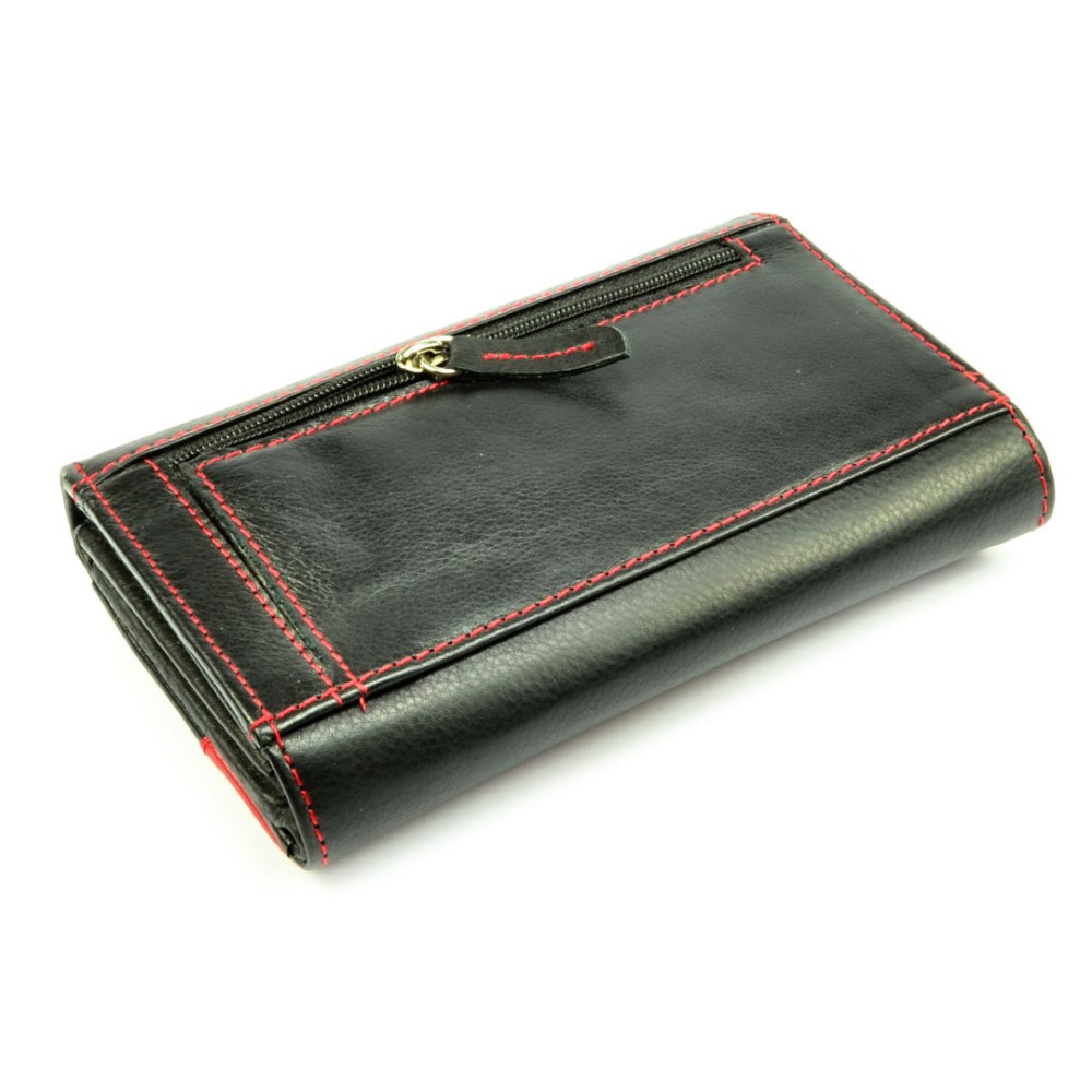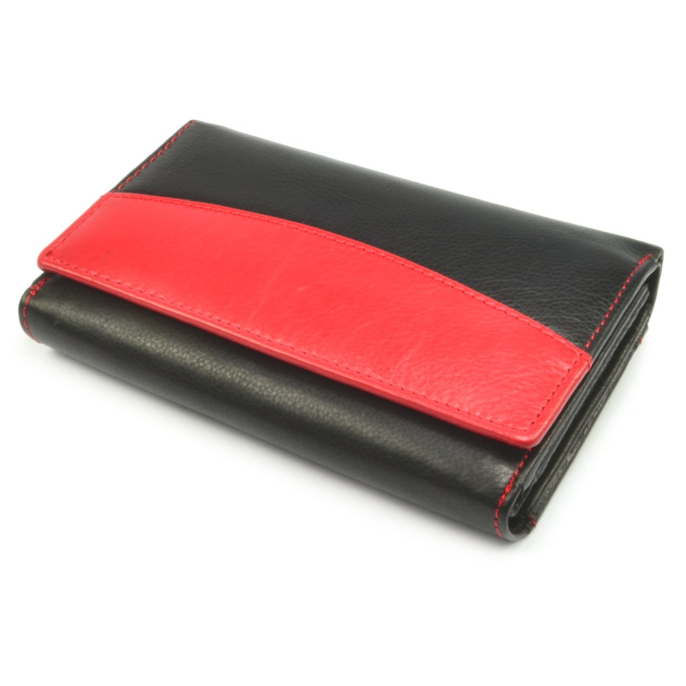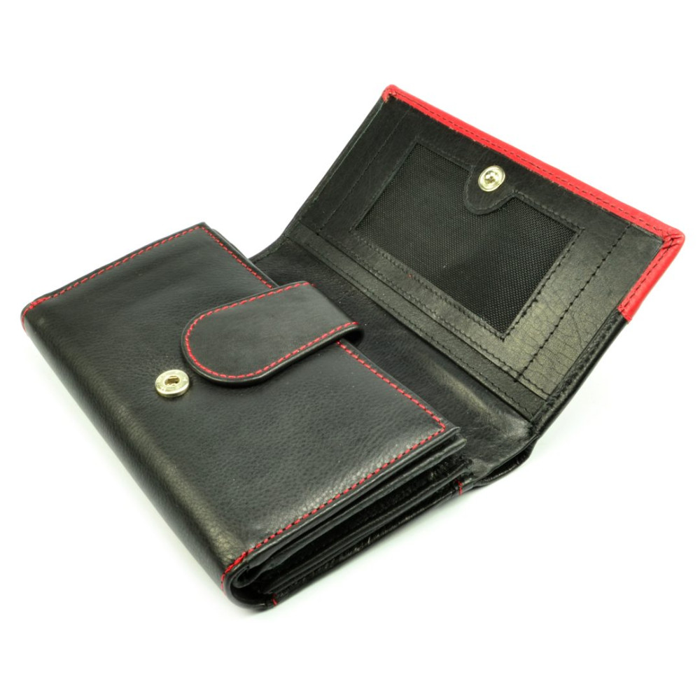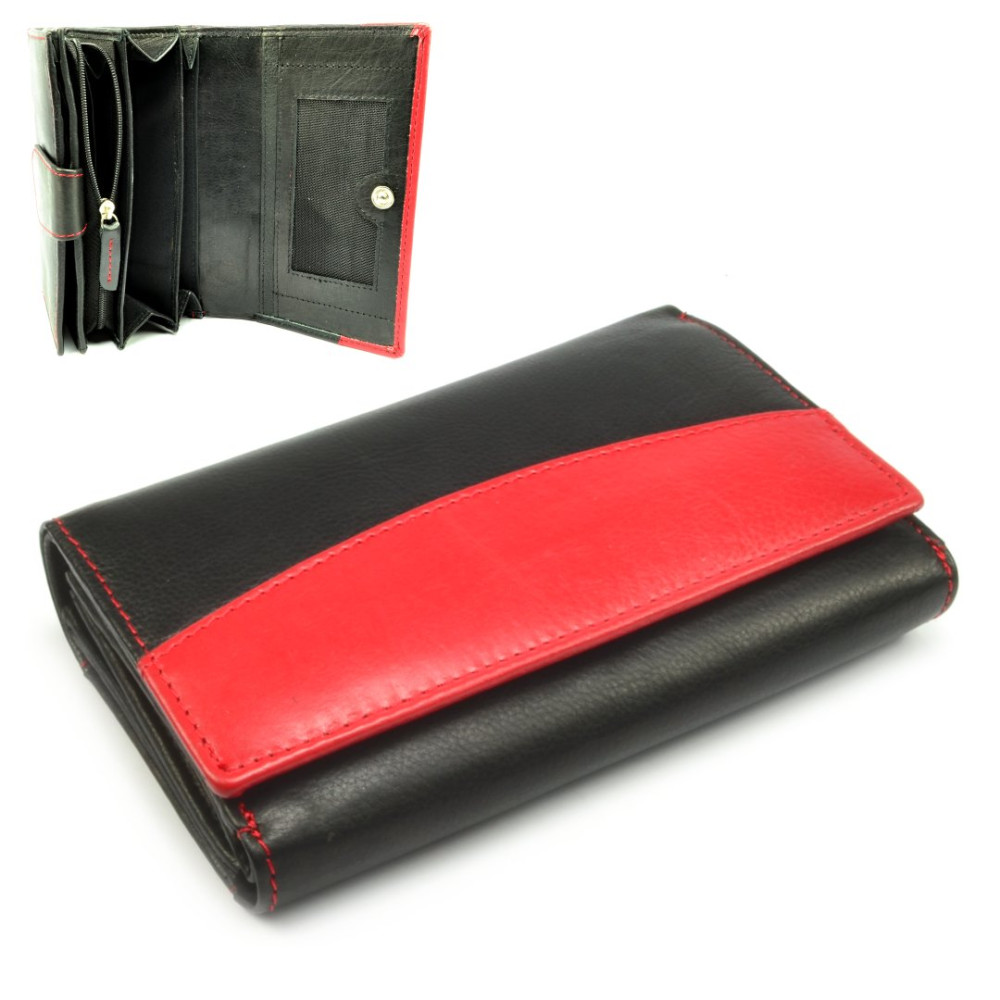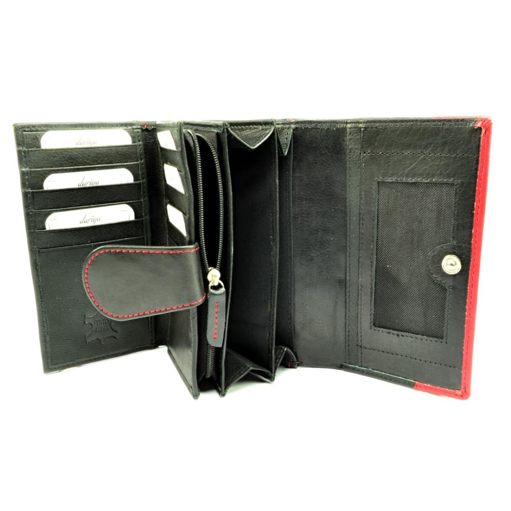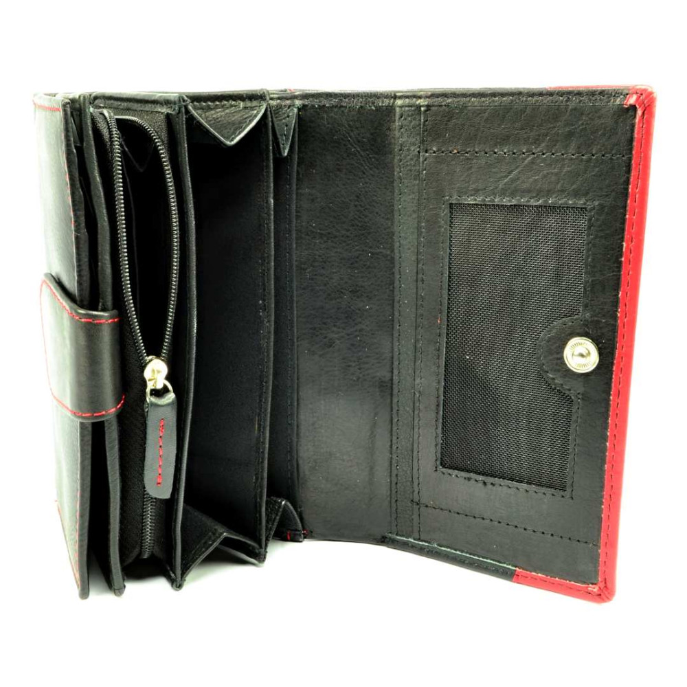 Pokud máte raději větší peněženky je tato černá dámská kožená peněženka jasná volba. Peněženka se uzavírá klopou s pevným drukem. Po otevření peněženky jsou přístupné tenké kapsy, jedna z nich je průhledná, kapsy na bankovky a mincovník. Ten je rozdělený na dvě velké kapsy a uzavírá se zipem s velkým jezdcem pro pohodlné otvírání. Pod přezkou uvnitř peněženky jsou kapsy na karty. Přes celou šířku peněženky je jedna velká kapsa na bankovky, přístupná z horní části peněženky. Na zadní straně peněženky je menší kapsa na zip. Peněženka je vyrobená z pravé kůže černé a červené barvy.