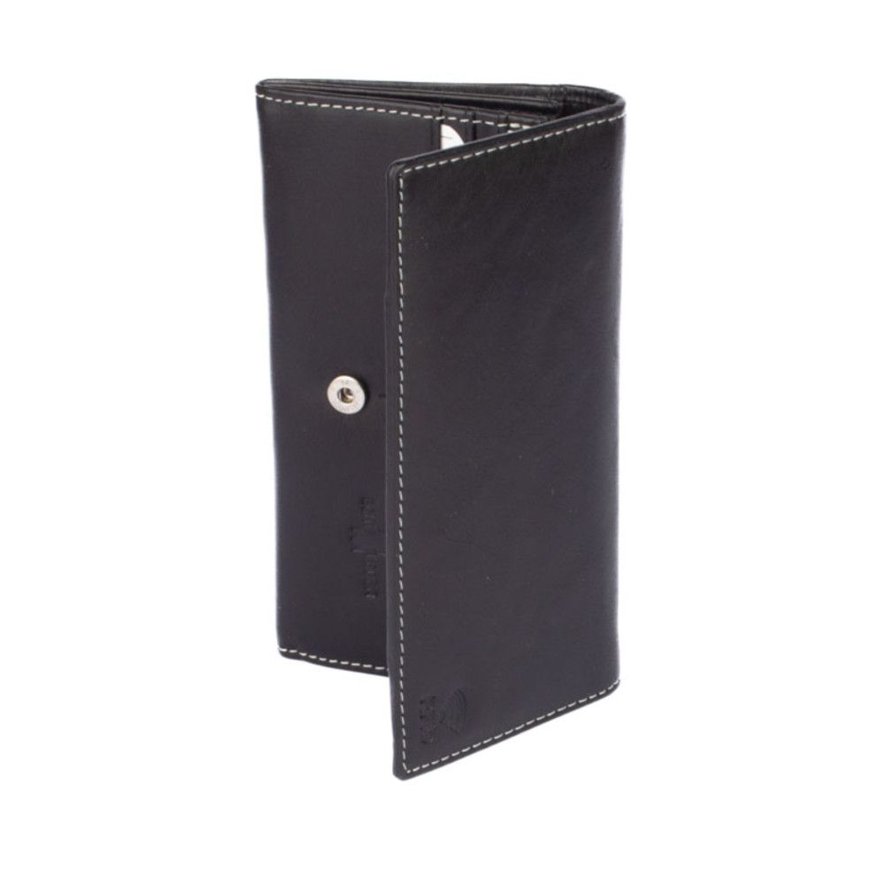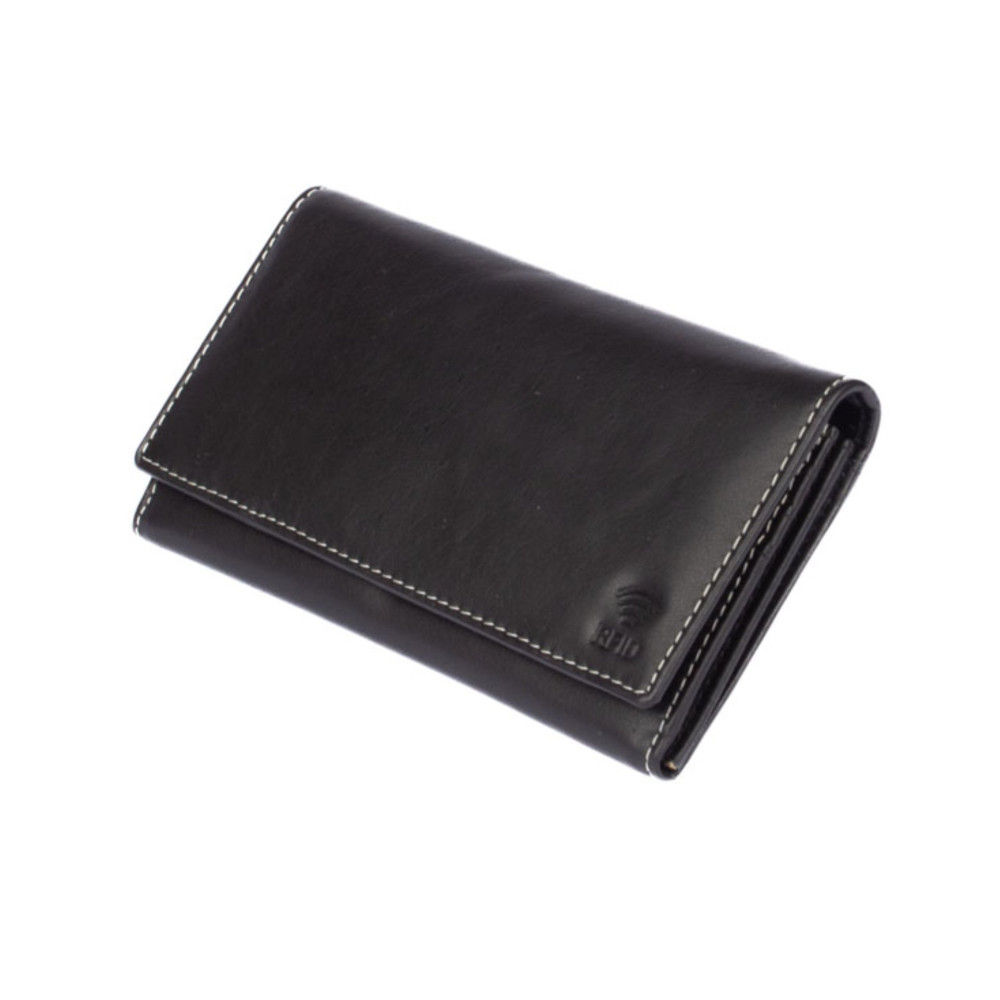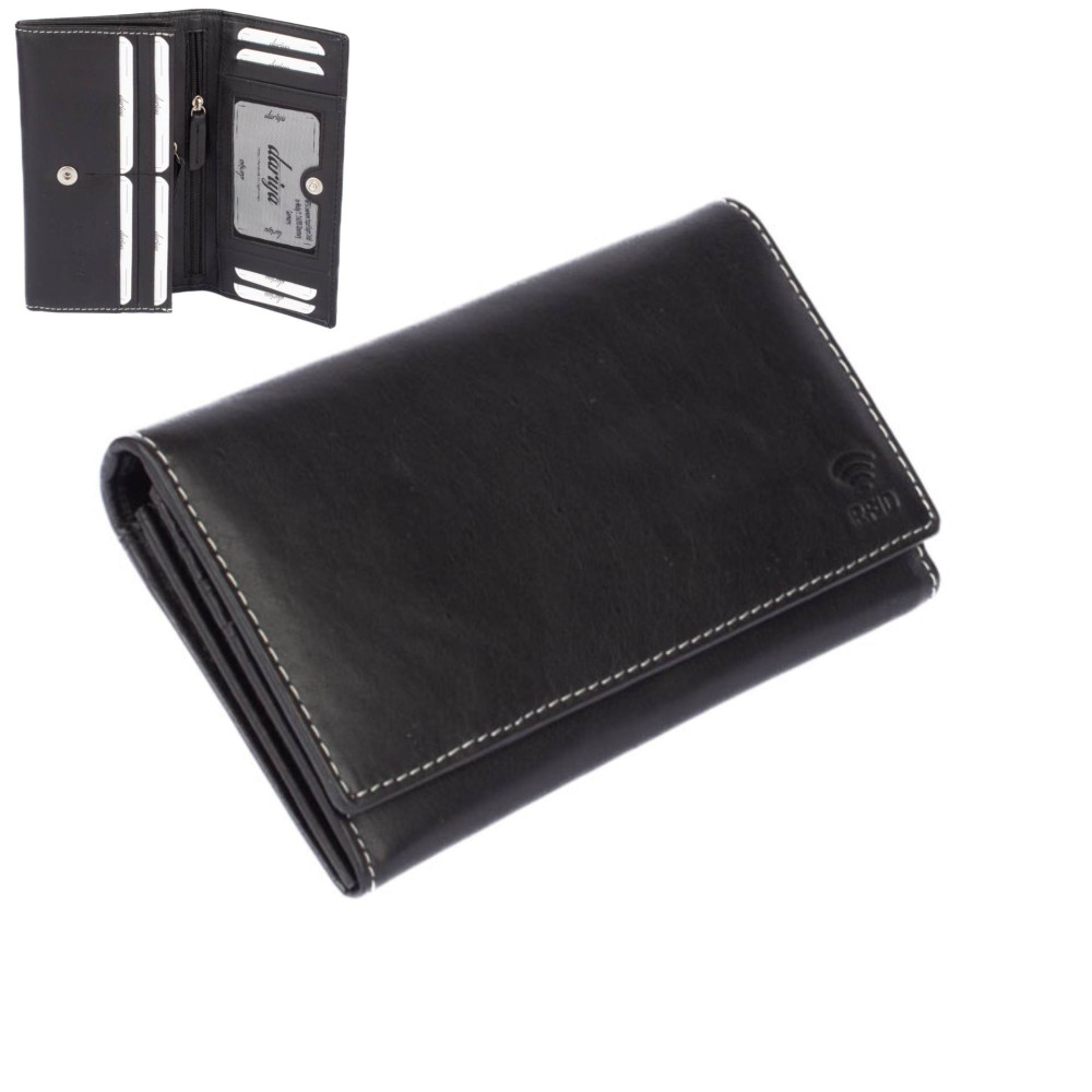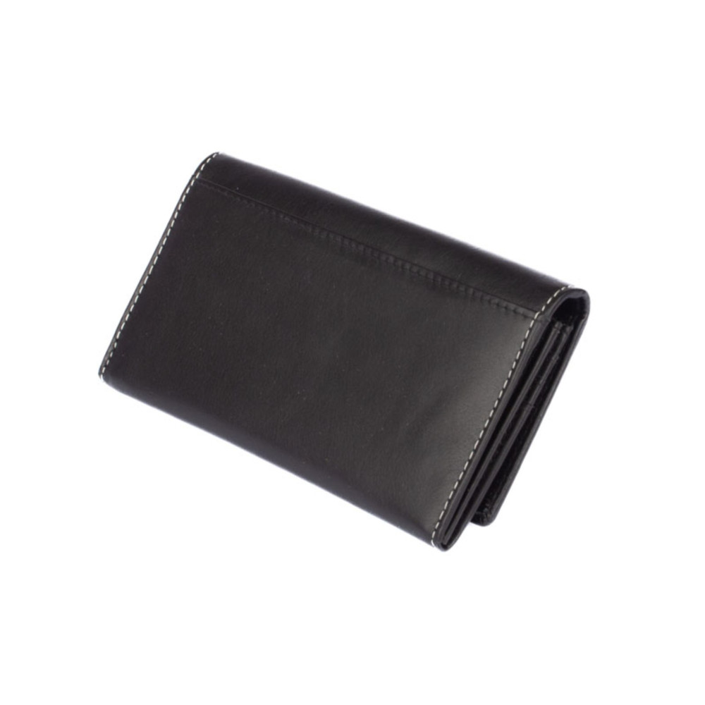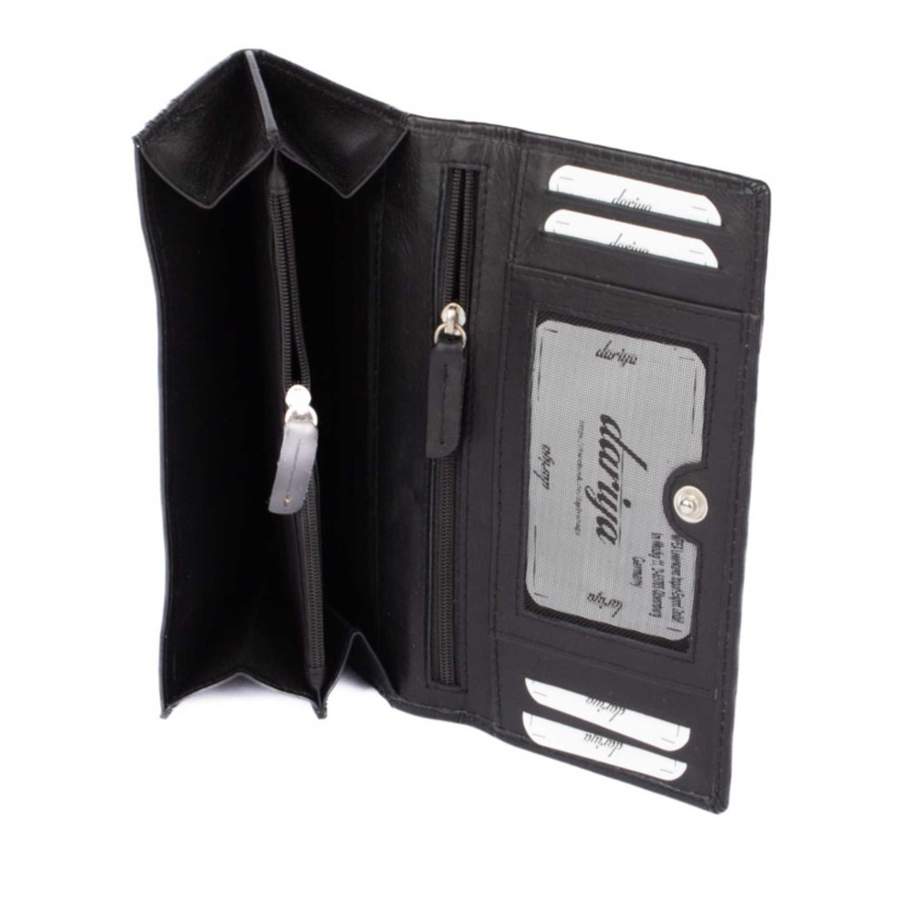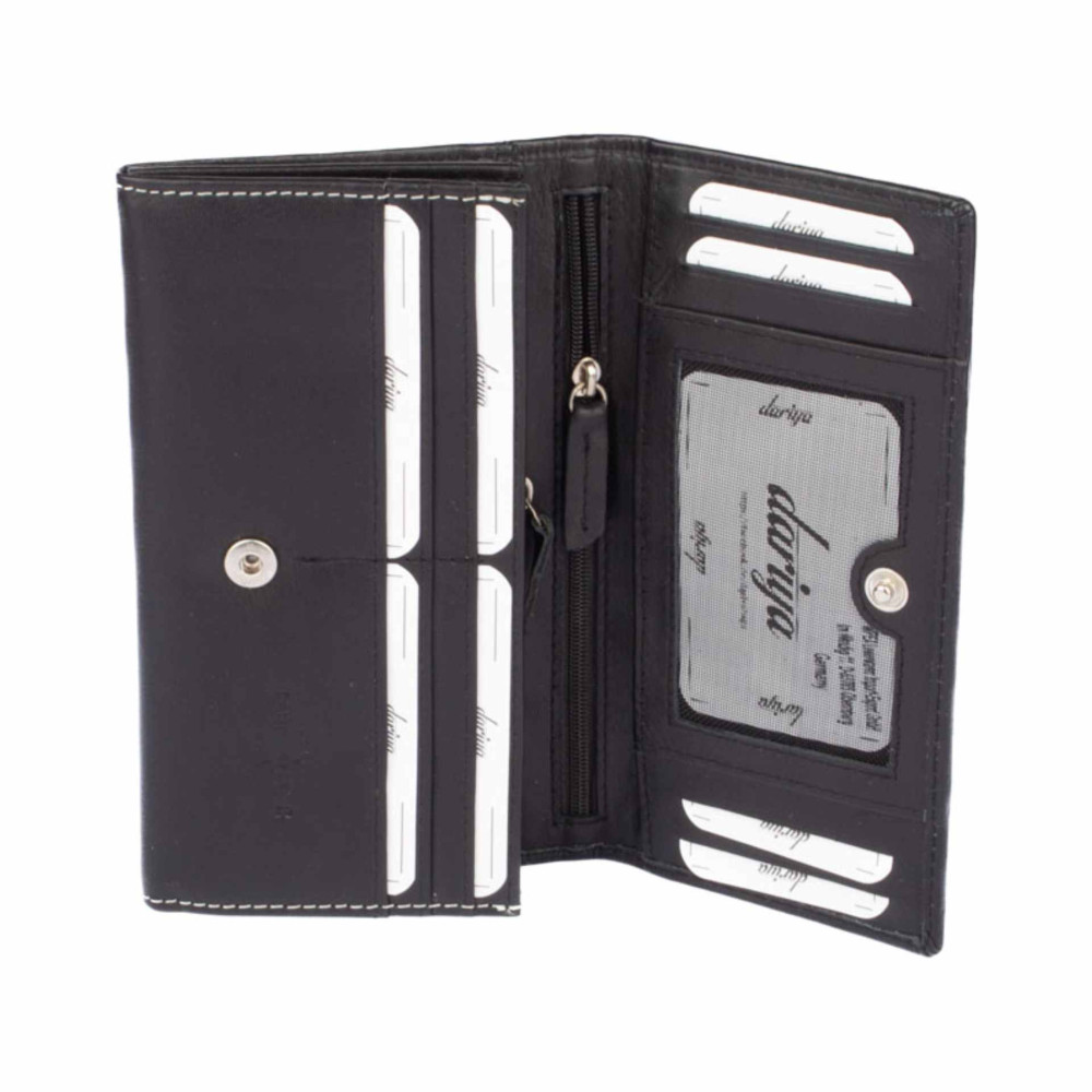 V klasické barvě černá dámská peněženka kožená se uzavírá klopou s pevným drukem. Tato moderní a praktická dámská peněženka má na zadní straně malou kapsičku. Po otevření peněženky jsou v kožené peněžence ihned přístupné kapsy na bankovky, karty a mincovník. Mincovník se uzavírá zipem a jako mincovník jde využít dvě kapsičky. Peněženka je vyrobena z kvalitní pravé kůže. Značka peněženky je Dariya bags.