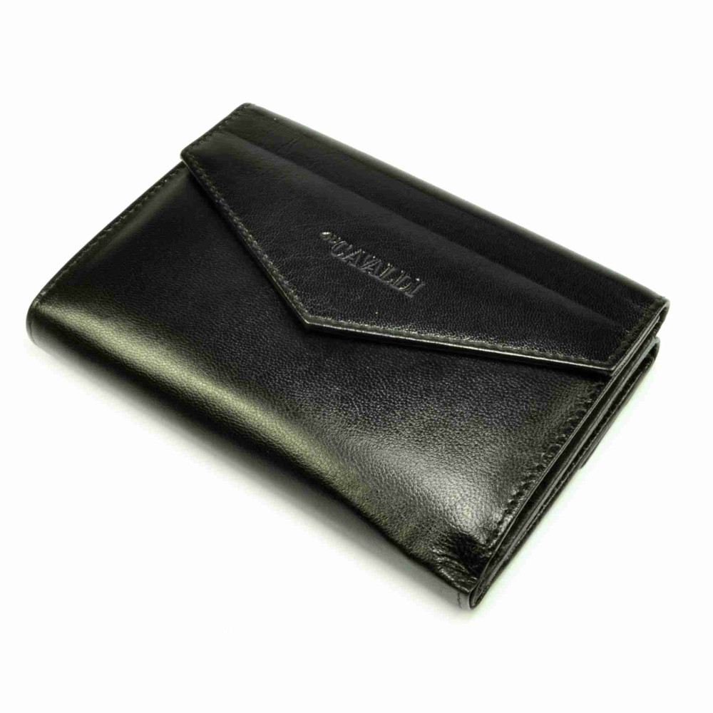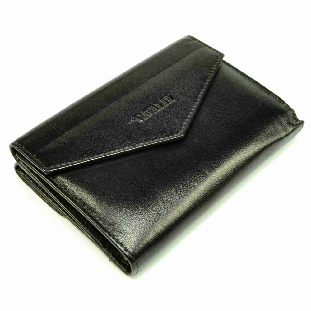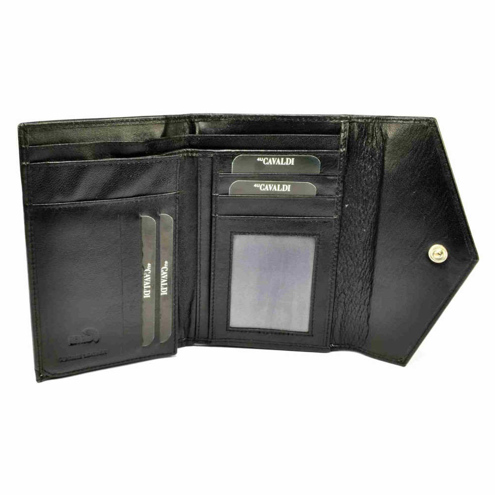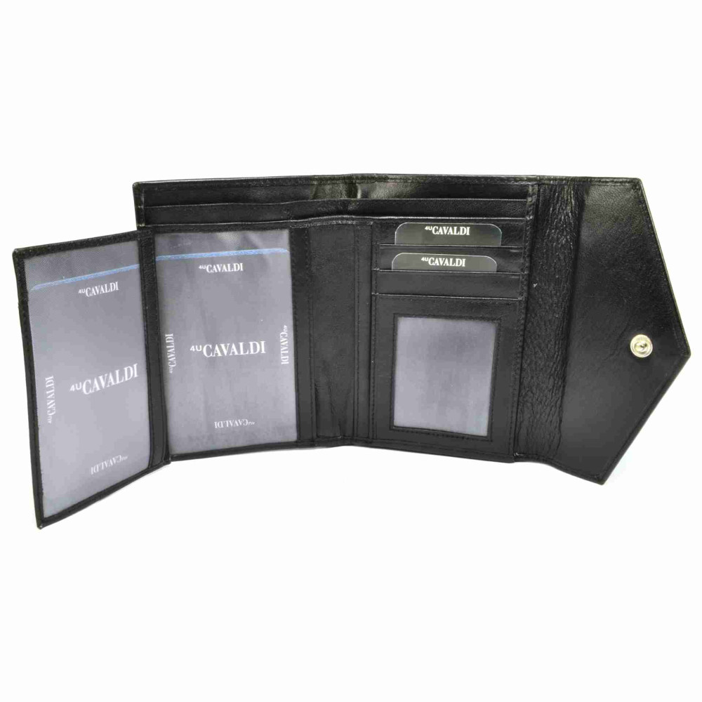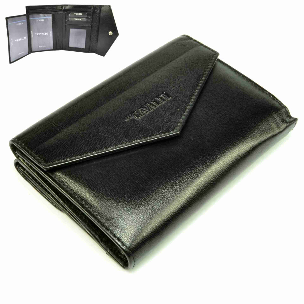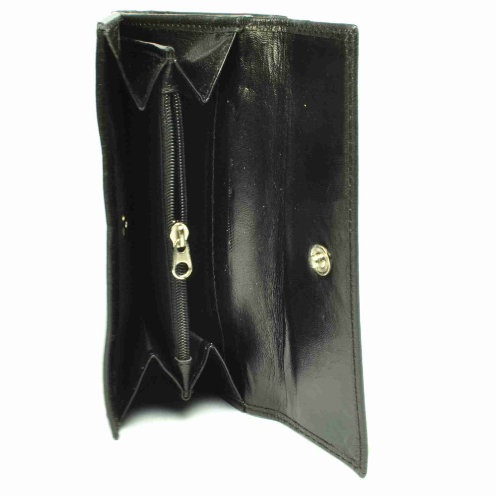 Módní černá kožená dámská peněženka je rozdělena na dvě poloviny. První polovina se zavírá klopou s drukem a skrývá velký mincovník. Ten je ještě rozdělen na tři kapsy, jedna z nich se zavírá zipem. V druhé polovině peněženky, která se také uzavírá klopou s drukem, jsou všechny ostatní kapsy. V peněžence je několik kapes na karty, jedna z nich je průhledná. Velké průhledné kapsy mlžete využít jako kapsy na doklady. Bankovky se vám pohodlně vejdou do dvou velkých kapes na bankovky. Peněženka je vyrobena z pravé kůže v odstínu černé a je dodávána v dárkové krabičce.