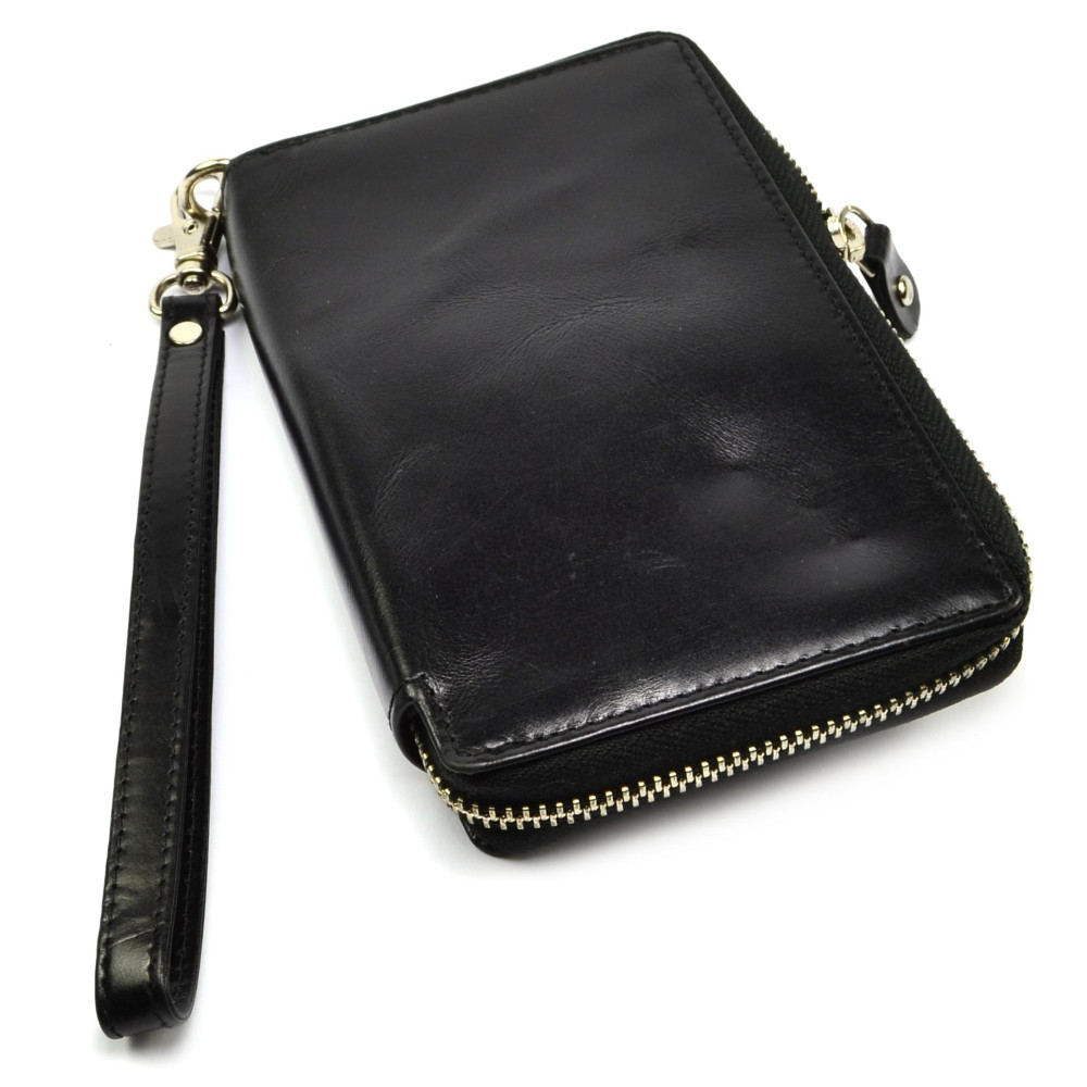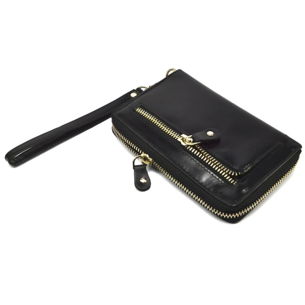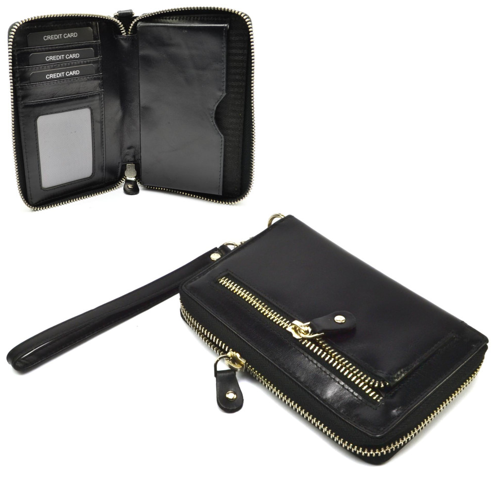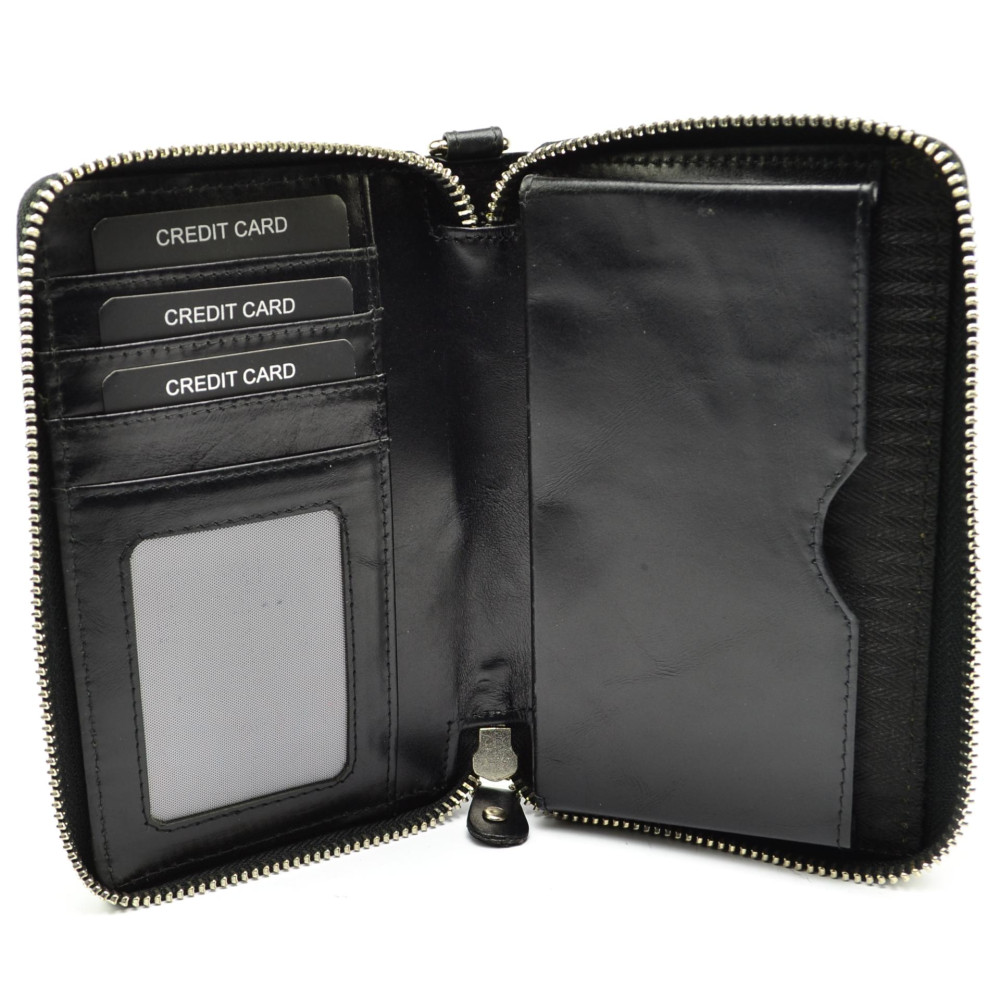 Černá peněženka dámská se uzavírá zipem s velkým jezdcem pro snadné otvírání. Po otevření černé peněženky se dostanete ke všem kapsám uvnitř. V černé peněžence je také kapsa například na mobilní telefon (rozměr kapsy je cca 13x7cm). Na zadní straně peněženky je kapsa na zip. Peněženka má odnímatelné poutko pro pohodlné nošení bez kabelky. Černá peněženka dámská je vyrobena z černé kůže s je značky Rovicky.