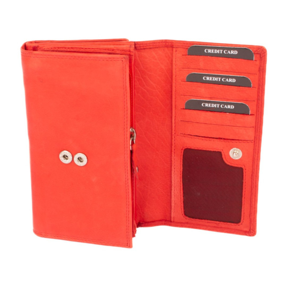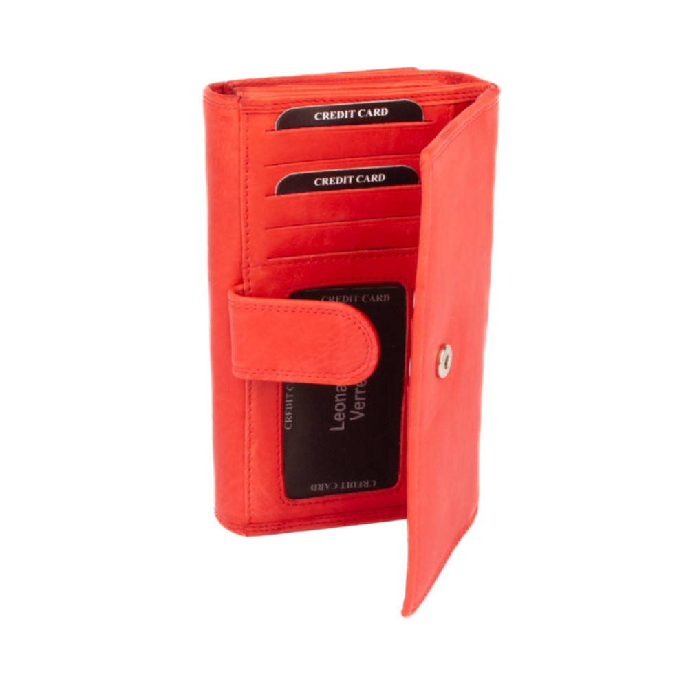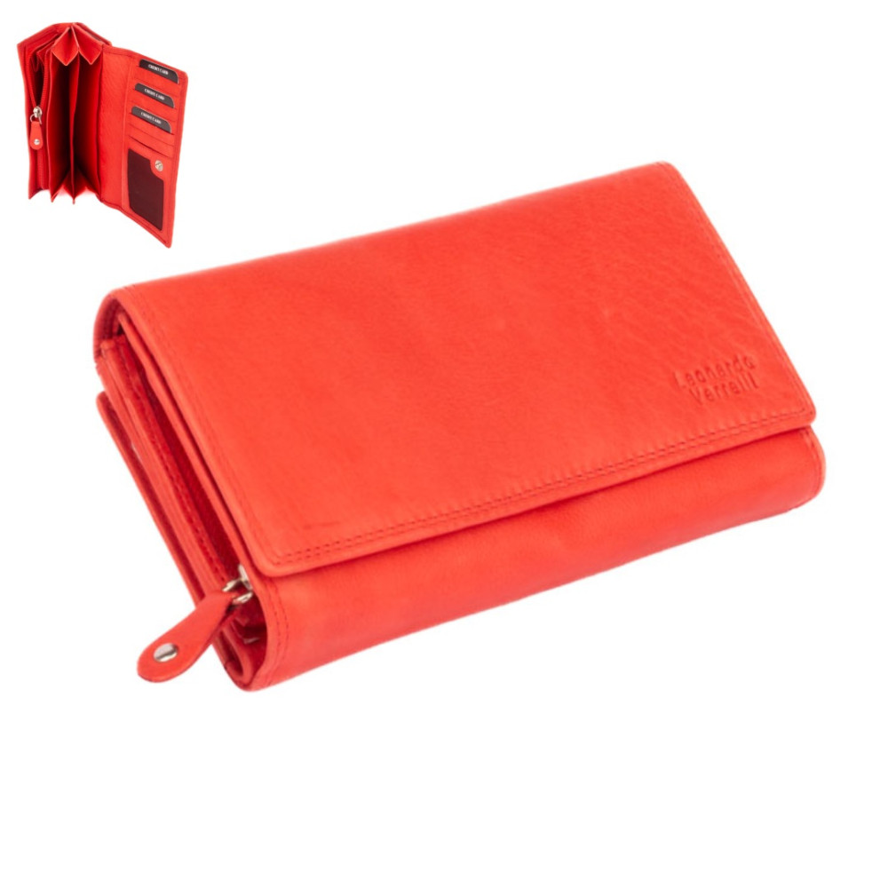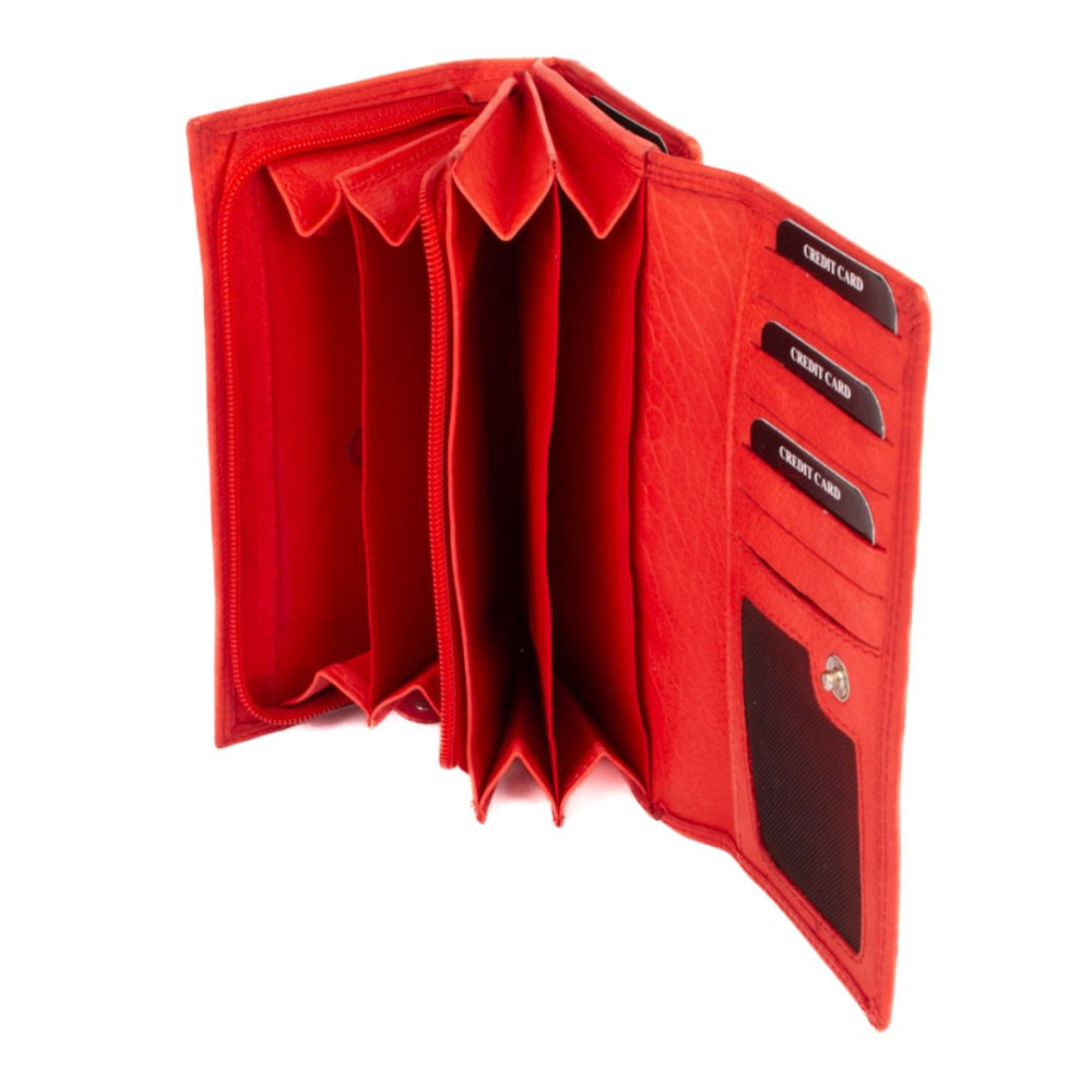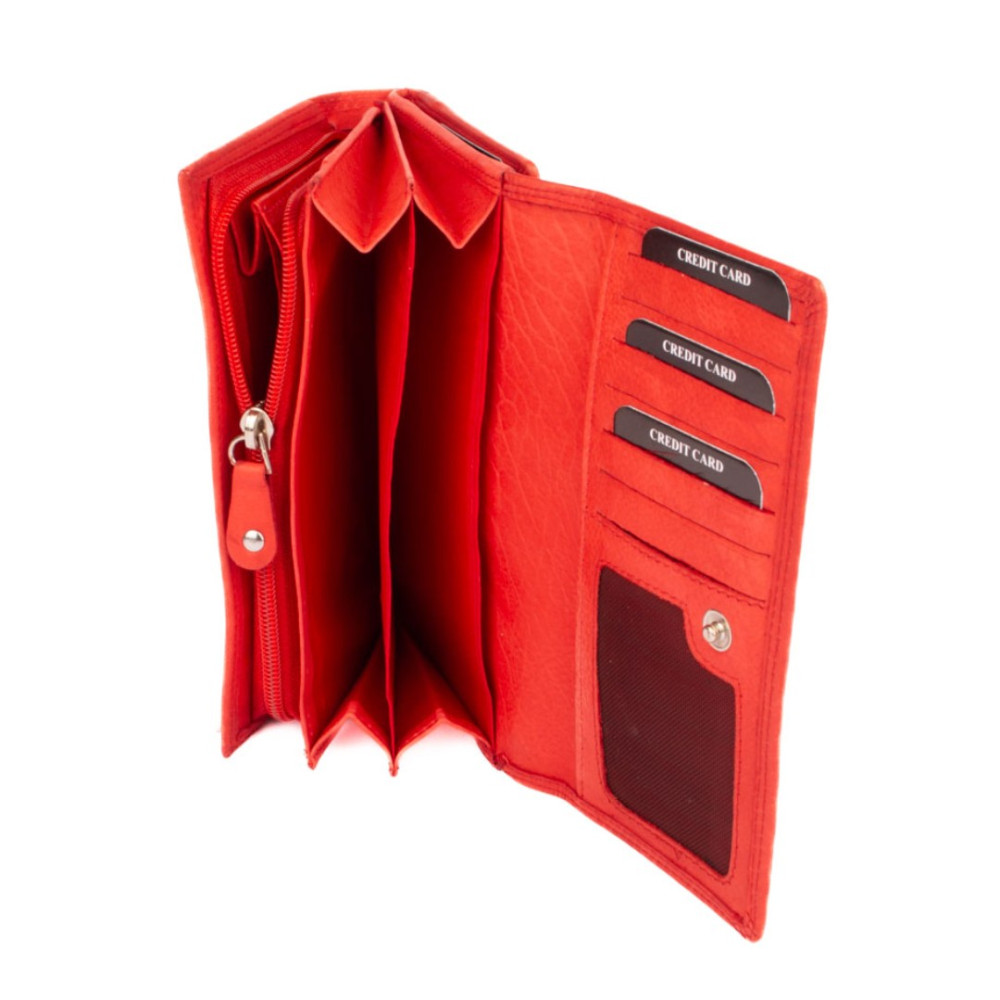 Světle Červená peněženka dámská je rozdělená na dvě poloviny. Jedna polovina se uzavírá klopou s pevným drukem. Po jejím otevření je přístupných několik kapes na platební a jiné karty, jedna z nich je průhledná. Vedle jsou dvě kapsy na bankovky. Všechny české bankovky je nutné přeložit před vložením. Vedle je kapsa na zip přes celou peněženku s velkým jezdcem pro pohodlné otevírání. Uvnitř jsou dvě velké kapsy na mince. Uplatnění najdete určitě i pro pár tenkých kapes, třeba na nějaké tajné papírky. Druhá polovina peněženky se uzavírá přezkou s pevným drukem. Po jejím otevření se přístupné další kapsy na karty, jedna je průhledná. Peněženka je vyrobená z pravé kůže s ornamenty jemných zrn, má světle červenou barvu a je dodávána bez dárkové krabičky. Červená peněženka dámská je také vybavena RFID ochranou proti nechtěnému čtení karet.