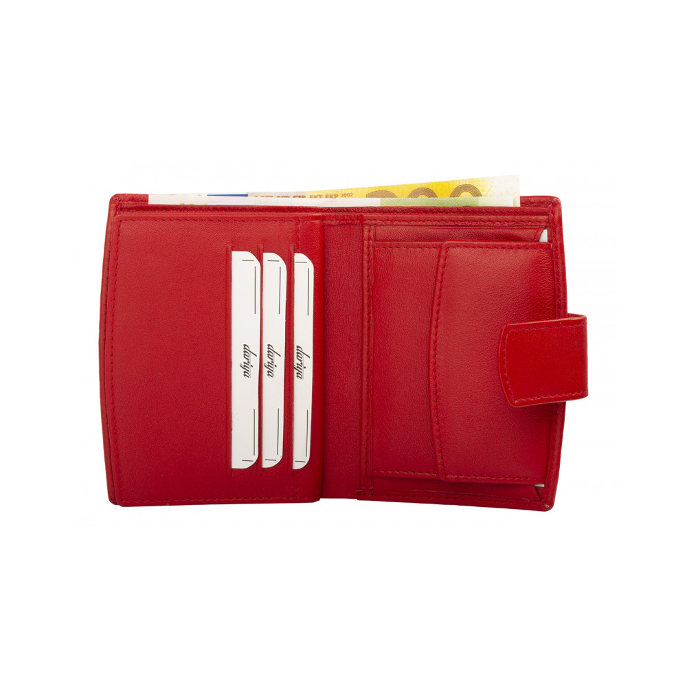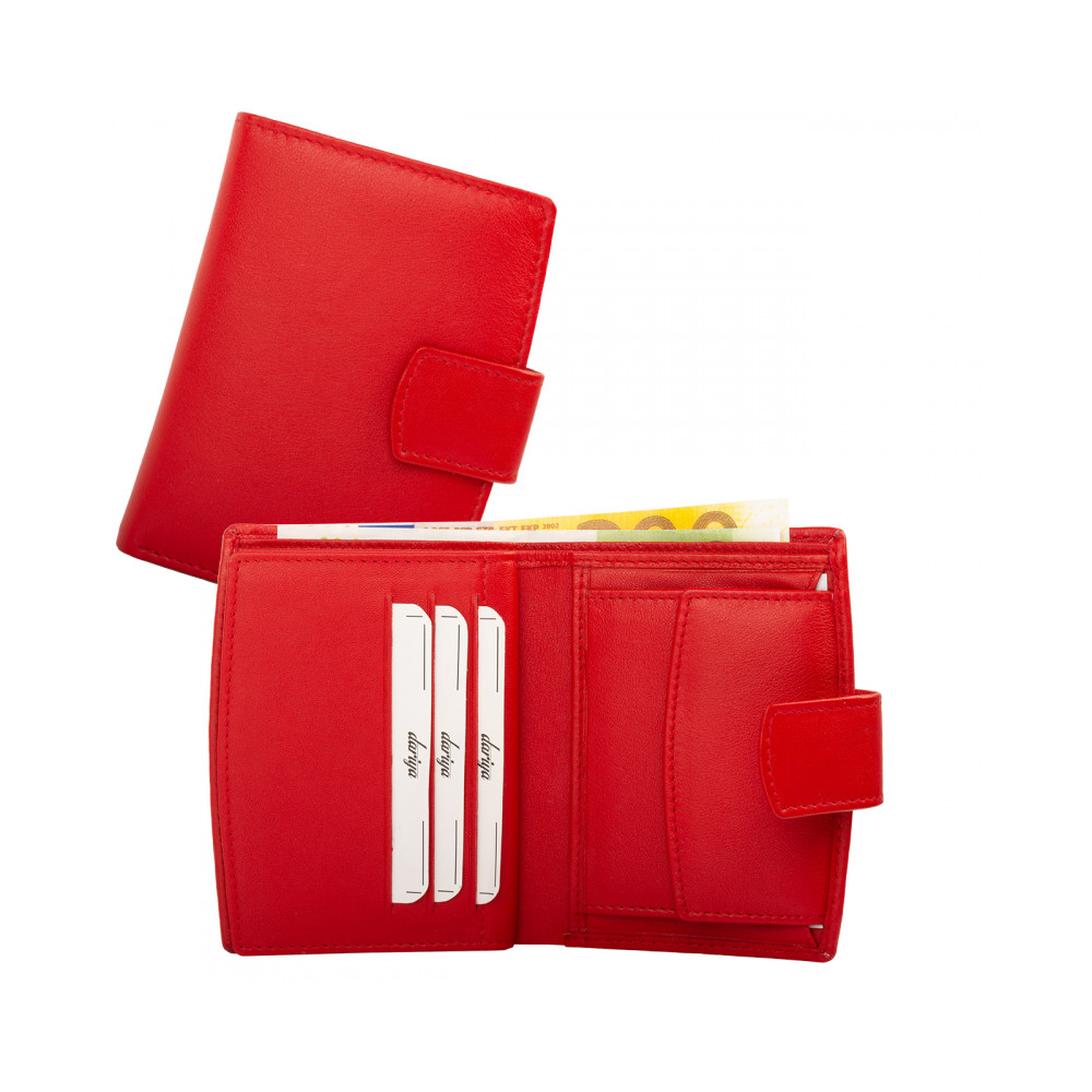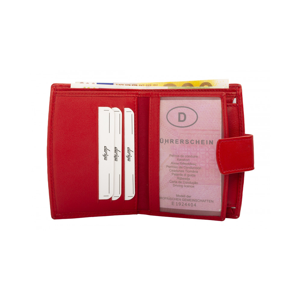 Červená peněženka kožená dámská z pravé kůže červené barvy se uzavírá přezkou s pevným drukem. Po otevření peněženky jsou přístupné všechny kapsy na karty, jedna z nich je průhledná. Bankovky uložíte do dvou kapes přes celou šíři peněženky. Mincovník peněženky je klasický, uzavíratelnou klopou s pevným drukem. Peněženka dámská malá je vyrobena z pravé kůže černé barvy a je značky Dariya Bags. Peněženka je dodávána bez dárkové krabičky.
