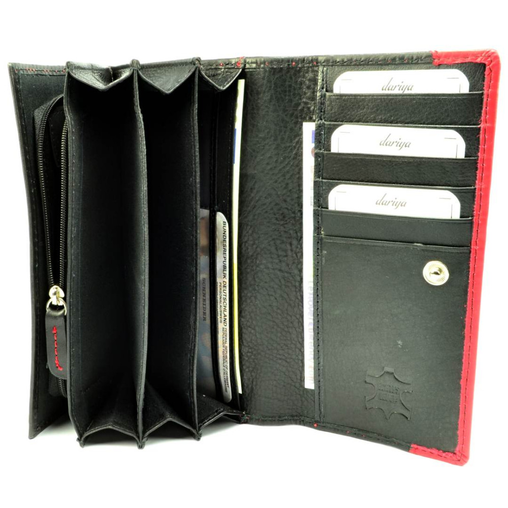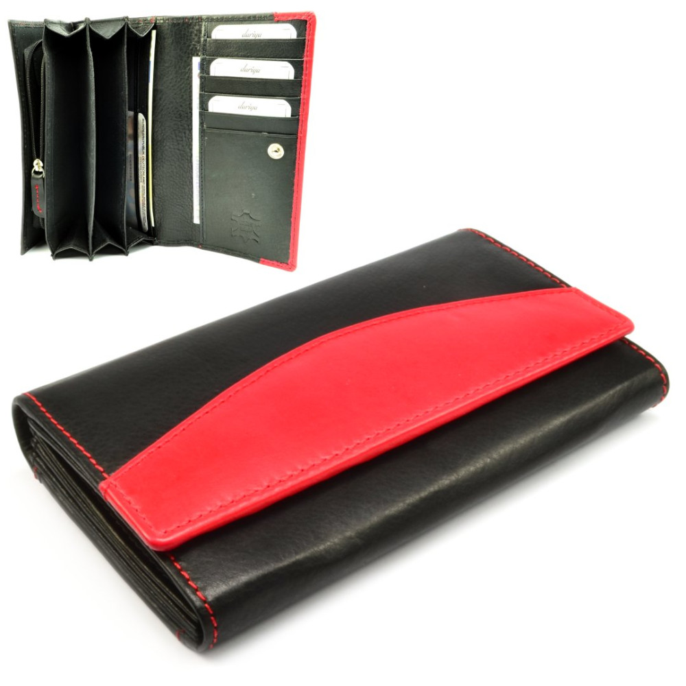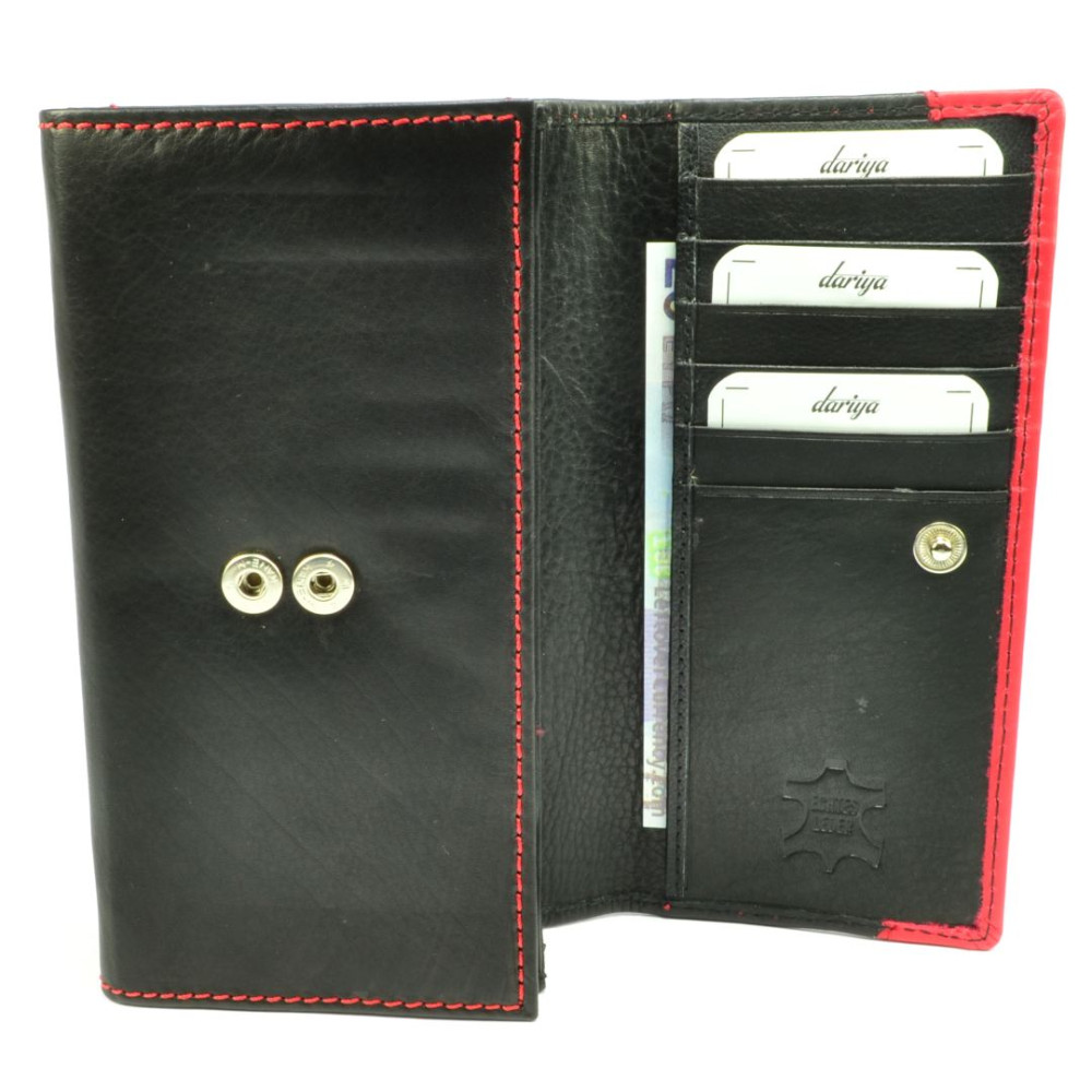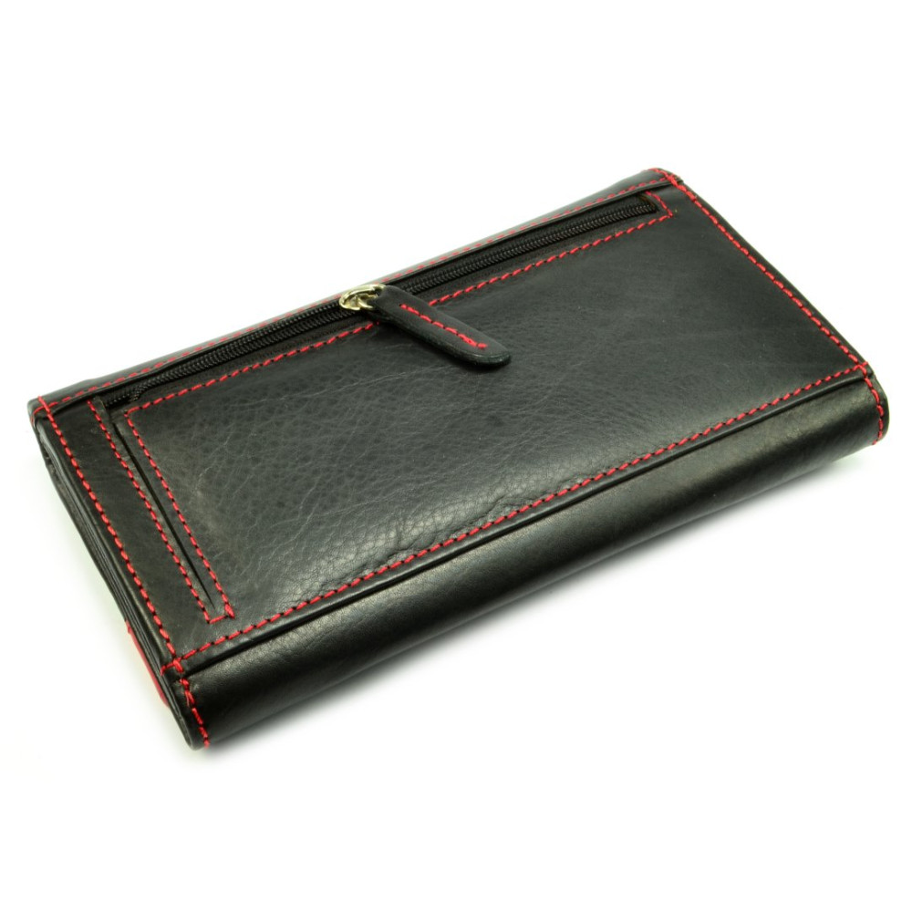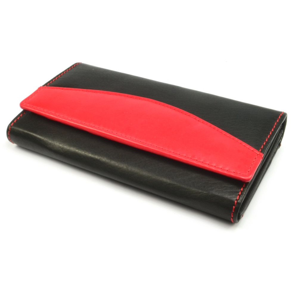 Pokud máte raději větší peněženky je tato dámská barevná peněženka jasná volba. Peněženka se uzavírá klopou s pevným drukem. Po otevření peněženky jsou přístupné tenké kapsy, jedna z nich je průhledná, kapsy na bankovky a mincovník. Ten je rozdělený na dvě velké kapsy a uzavírá se zipem s velkým jezdcem pro pohodlné otvírání. Pod přezkou uvnitř barevné peněženky jsou kapsy na karty. Přes celou šířku peněženky je jedna velká kapsa na bankovky, přístupná z horní části peněženky. Na zadní straně peněženky je menší kapsa na zip. Dámská barevná peněženka je vyrobená z pravé kůže černé barvy.