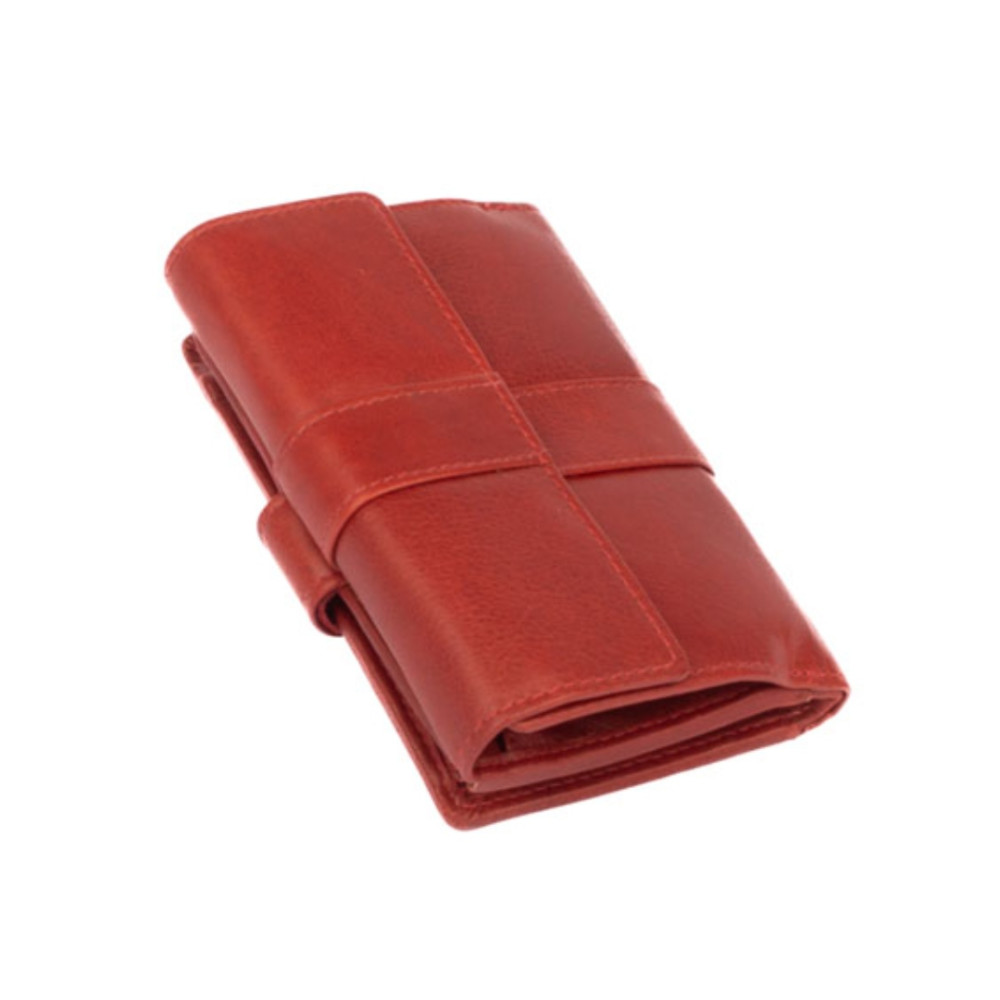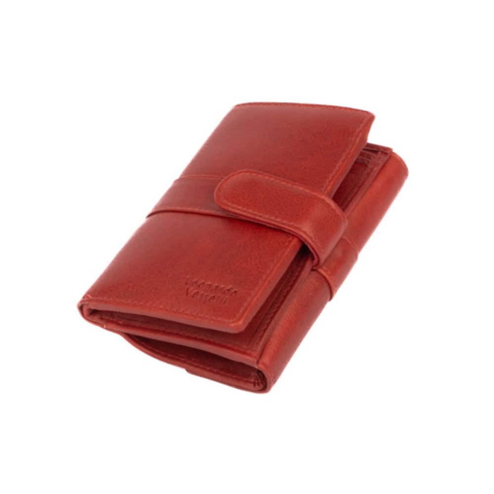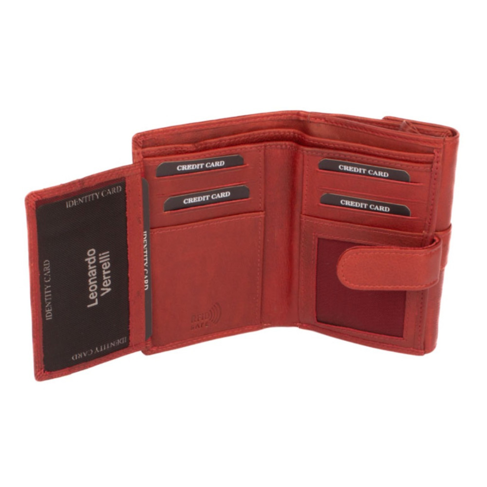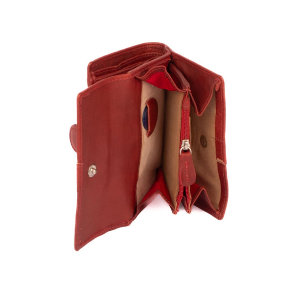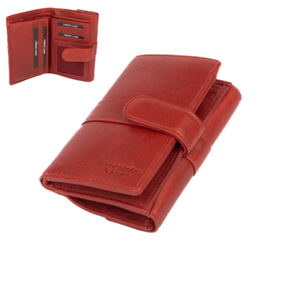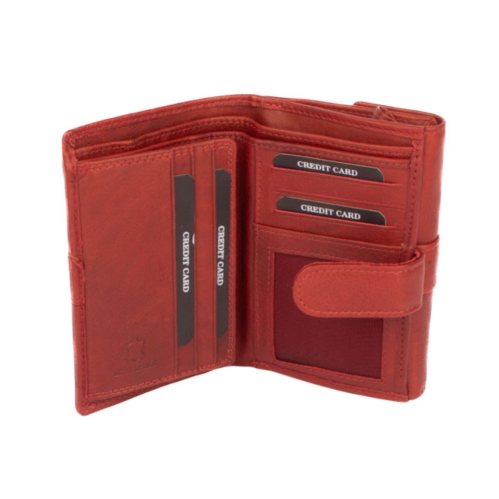 Dámská kožená peněženka s přezkou má dostatek kapes a velmi praktické členění. Peněženka je rozdělena na dvě poloviny. Jedna polovina se uzavírá přezkou s pevným drukem. Po jejím otevření jsou přístupné všechny kapsy na platební a jiné karty, některé z nich jsou průhledné. Nad nimi jsou dvě hluboké kapsy na bankovky. Všechny české bankovky lze vložit bez přehnutí. Uplatnění najdete určitě i pro pár tenkých kapes, třeba na nějaké tajné papírky. Druhá polovina peněženky se klopou s pevným drukem. Po jejím otevření se přístupné dvě velké kapsy, mezi nimi je jedna kapsa na zip. Na boční straně je kapsa s žetonem do košíku. Peněženka je vyrobená z pravé kůže s ornamenty jemných zrn, má červenou barvu a je dodávána v dárkové krabičce. Dámská kožená peněženka s přezkou je také vybavena RFID ochranou proti nechtěnému čtení karet.