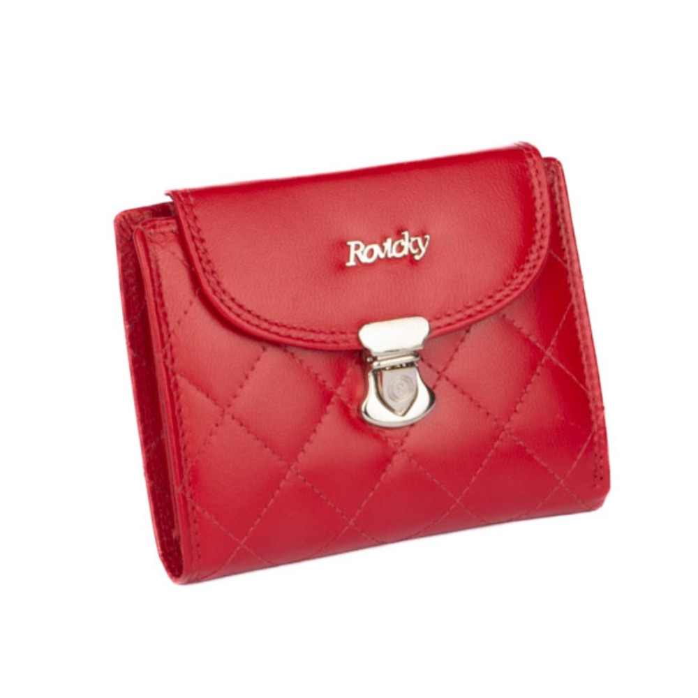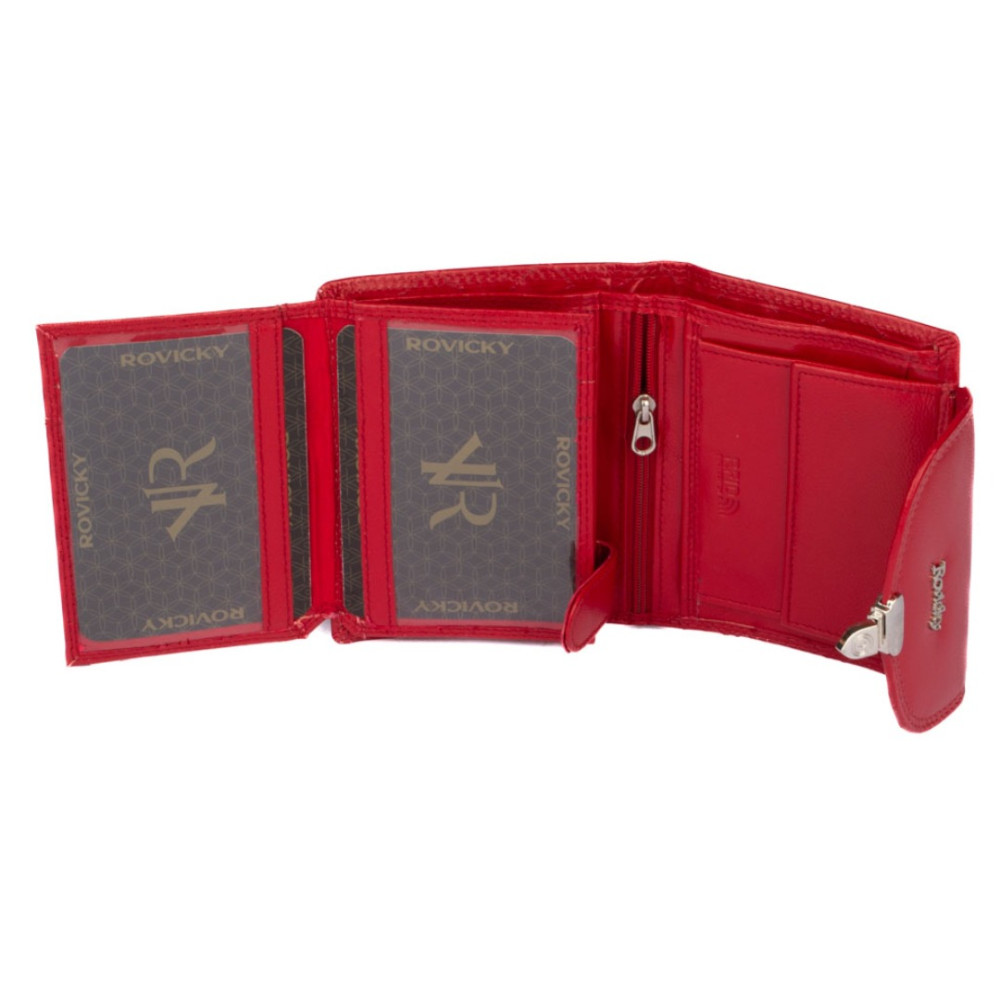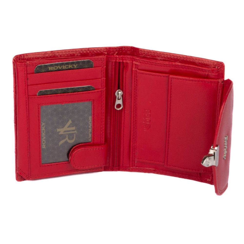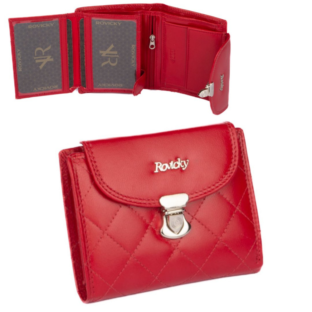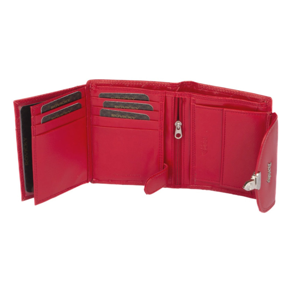 Kožená dámská malá peněženka se zapínáním na přední straně. Po otevření peněženky je přístupný mincovník, uzavíratelný klopou s pevným drukem. V druhé části peněženky, která je zajištěna přezkou s drukem, jsou přístupné kapsy na karty, jedna z nich je průhledná. Samozřejmostí jsou dvě kapsy na bankovky. Uvnitř peněženky jsou tajné kapsy, jedna je se uzavírá na zip. Dámská malá peněženka je vyrobena z pravé kůže červené barvy a je z kolekce oblíbené značky Rovicky. Peněženku dostanete v dárkové krabičce.