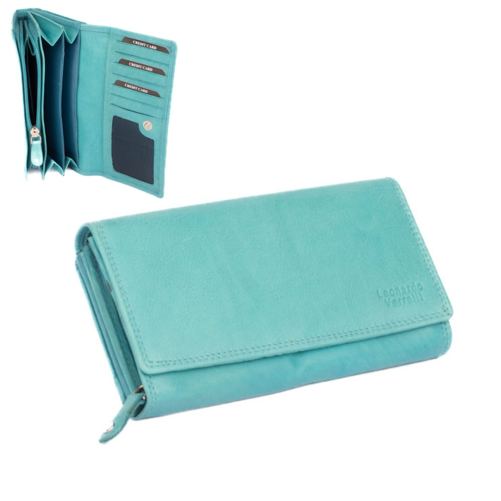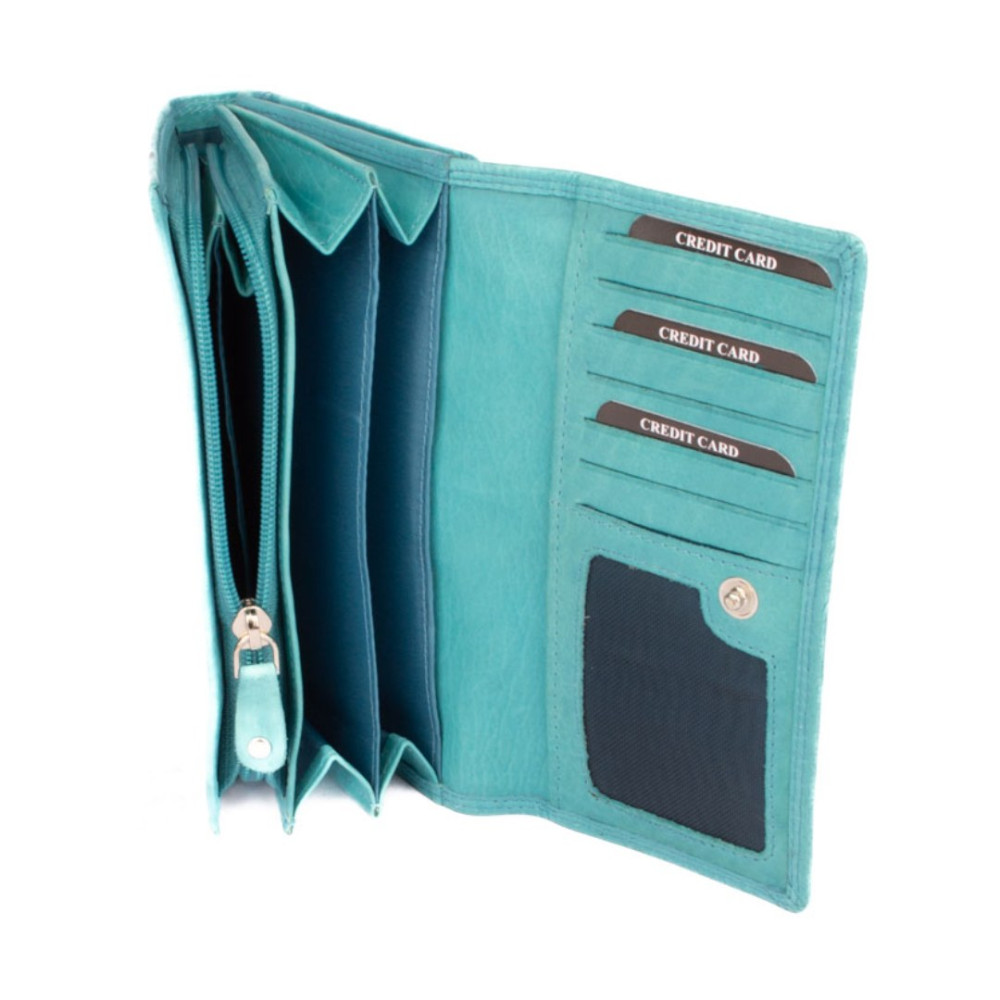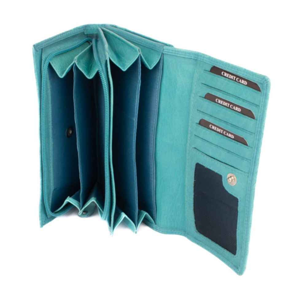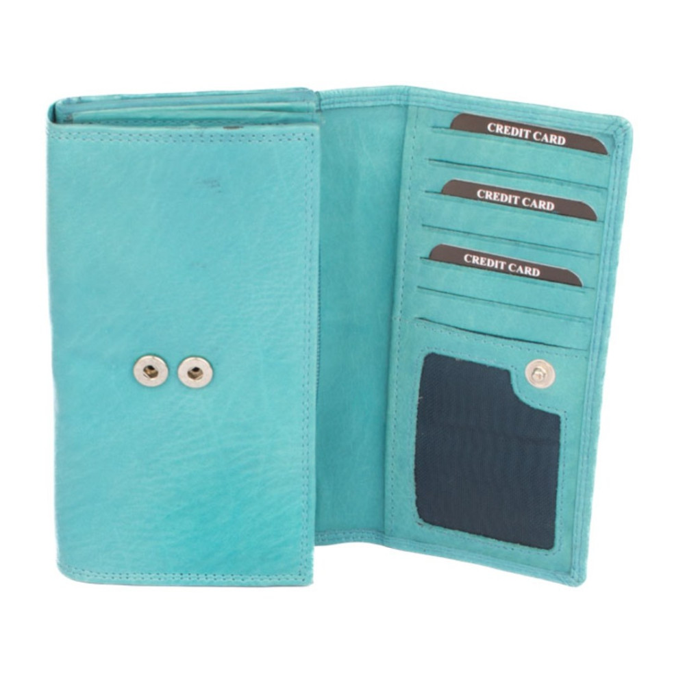 Dámská modrá peněženka je rozdělená na dvě poloviny. Jedna polovina se uzavírá klopou s pevným drukem. Po jejím otevření je přístupných několik kapes na platební a jiné karty, jedna z nich je průhledná. Vedle jsou dvě kapsy na bankovky. Všechny české bankovky je nutné přeložit před vložením. Vedle je kapsa na zip přes celou peněženku s velkým jezdcem pro pohodlné otevírání. Uvnitř jsou dvě velké kapsy na mince. Uplatnění najdete určitě i pro pár tenkých kapes, třeba na nějaké tajné papírky. Druhá polovina peněženky se uzavírá přezkou s pevným drukem. Po jejím otevření se přístupné další kapsy na karty, jedna je průhledná. Peněženka je vyrobená z pravé kůže s ornamenty jemných zrn, má tyrkysově modrou a je dodávána bez dárkové krabičky. Dámská modrá peněženka je také vybavena RFID ochranou proti nechtěnému čtení karet.