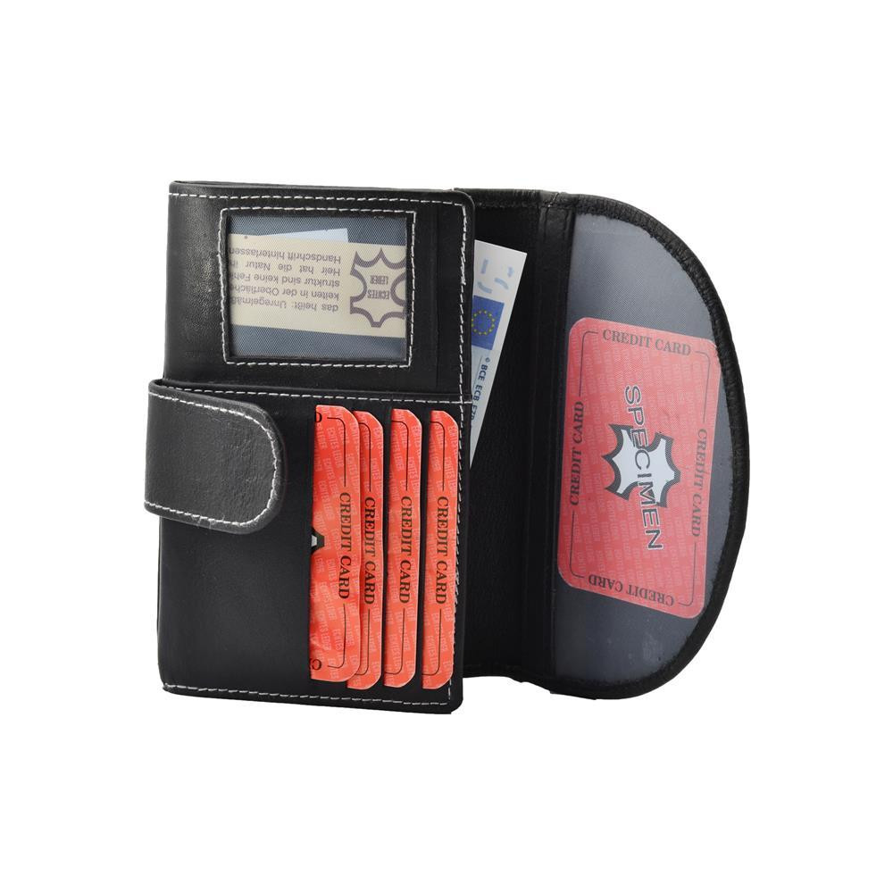 Dámská peněženka na zip je rozdělena na dvě části. První část se uzavírá přezkou s pevným drukem. Do této části pohodlně uložíte vaše bankovky. Platební karty uschováte do kapes po stranách a uvnitř i venku peněženky, tři z kapes jsou průhledné a můžete ji využít například na fotografie vašich blízkých. V této části peněženky jsou také tenké kapsy na vaše tajnosti. Do druhé části peněženky s uzavíráním na zip si můžete dávat třeba drobné mince. Peněženka je vyrobena z pravé kůže černé barvy a je dodávána bez dárkové krabičky.