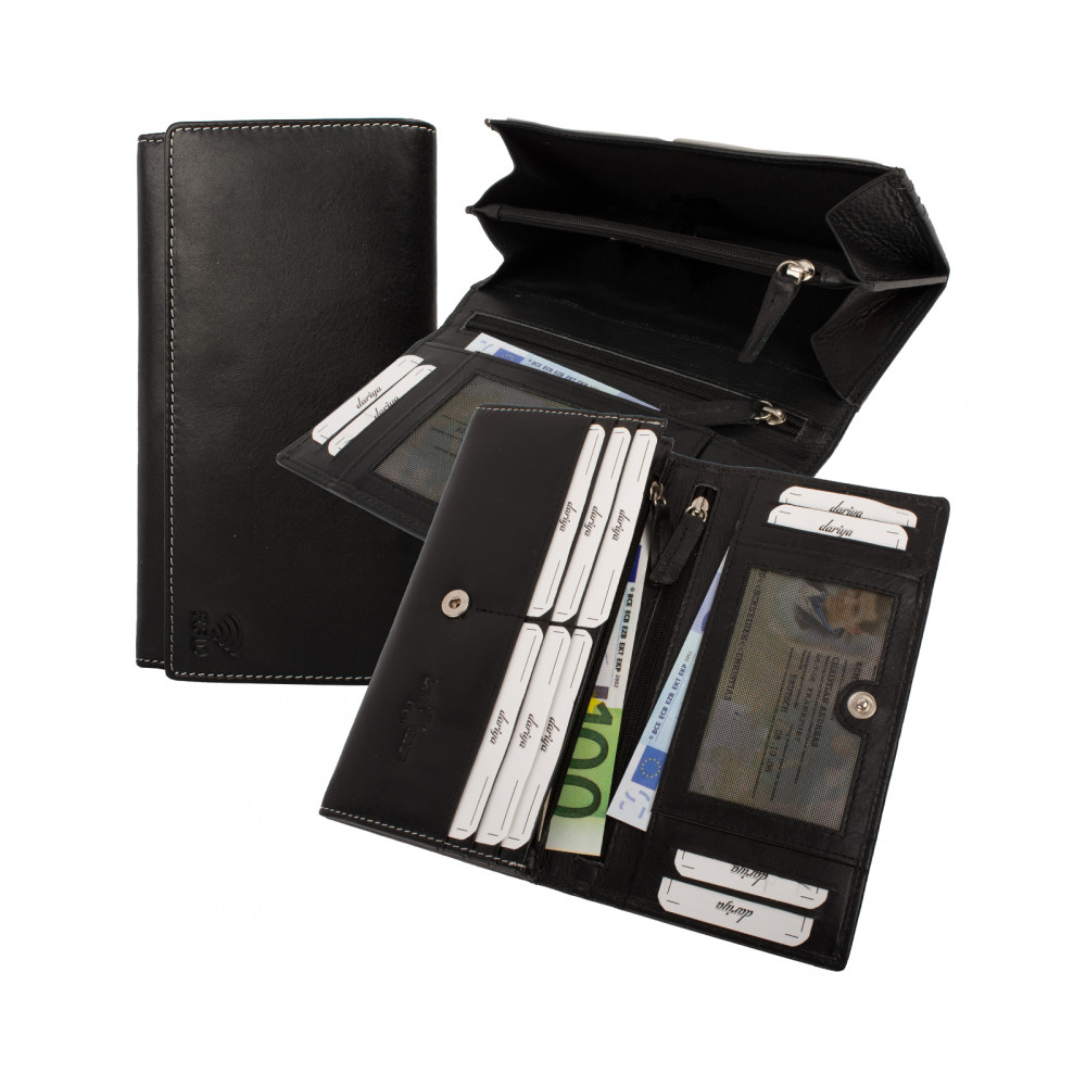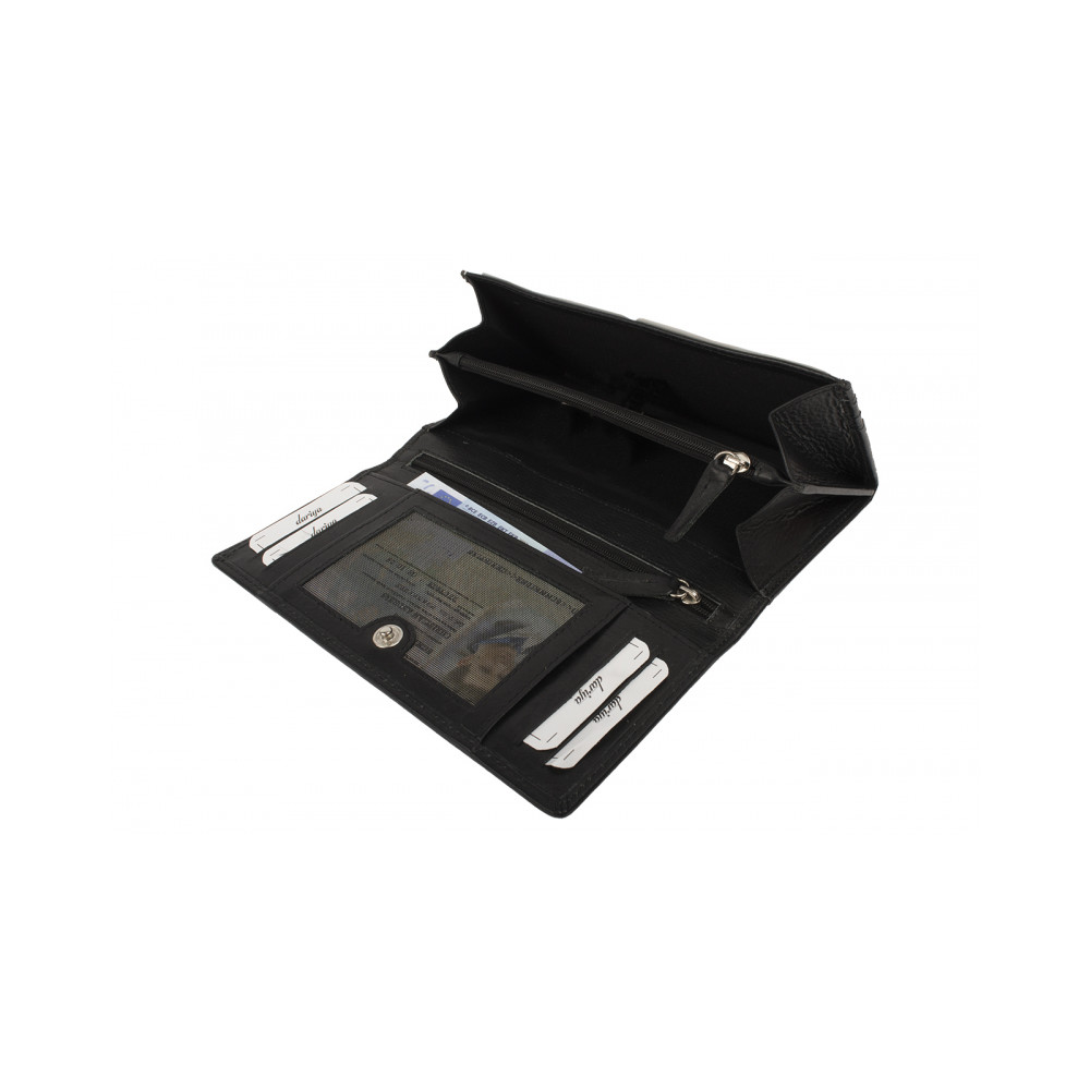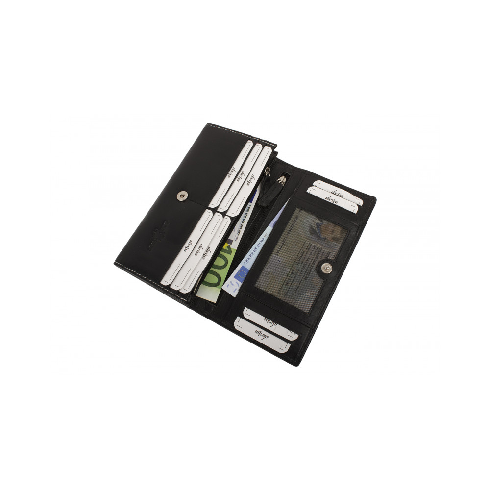 Moderní dámská peněženka z pravé velmi jemné kůže. Peněženka se uzavírá klopou s pevným drukem. Pod klopou jsou kapsy na karty, jedna z nich je průhledná. Další velké kapsy lze použít na bankovky. Jedna kapsa se uzavírá na zip a je vhodná jako mincovník. Tenké kapsy a další na zip poslouží k ukrytí vašich tajných papírků. Na zadní straně dámské peněženky je tenká velká kapsa přes celou šíři. Peněženka je vyrobena z pravé kůže a je značky Dariya Bags.