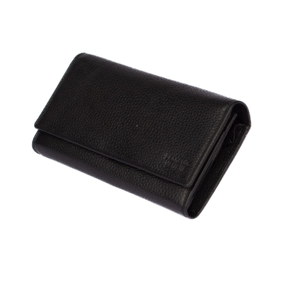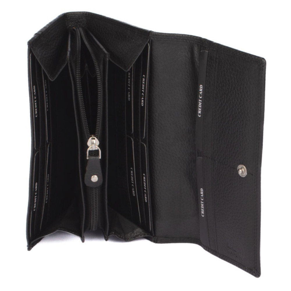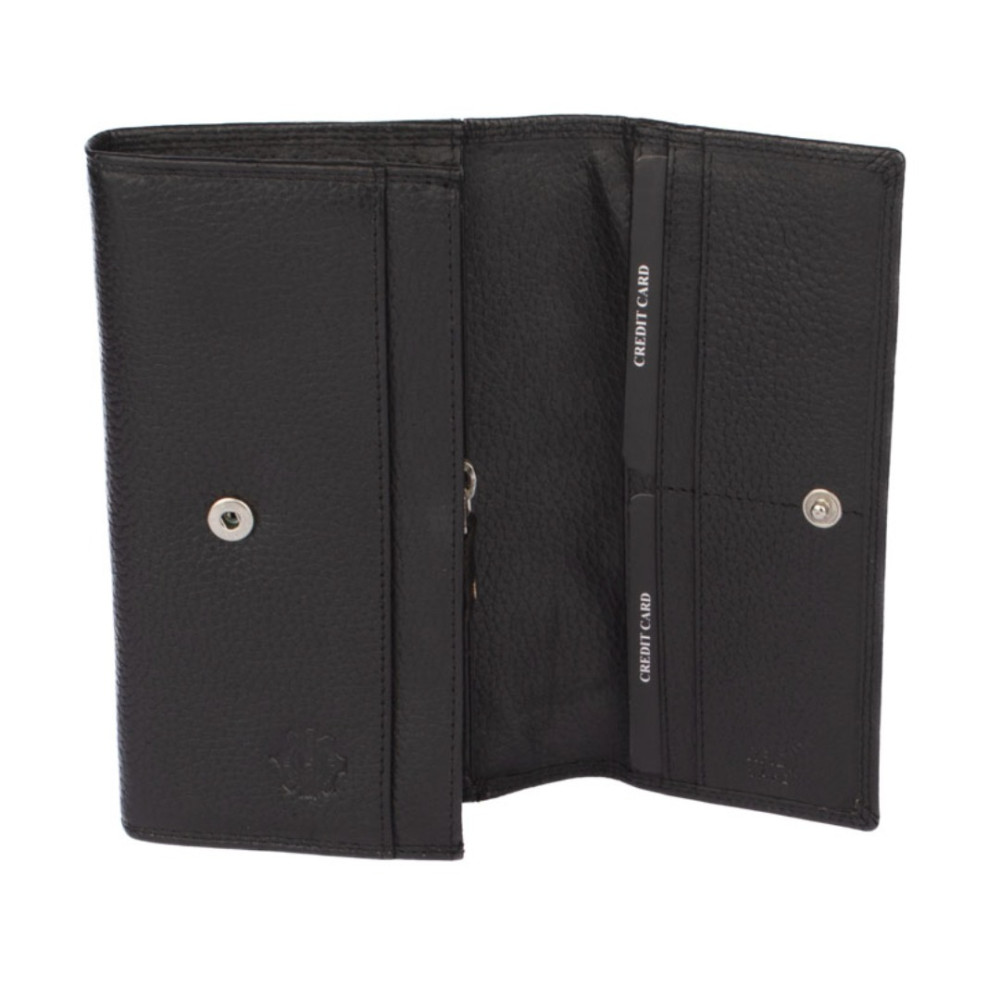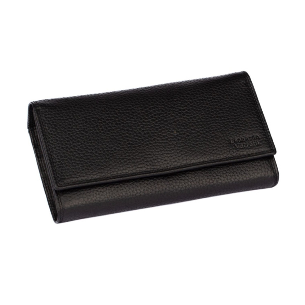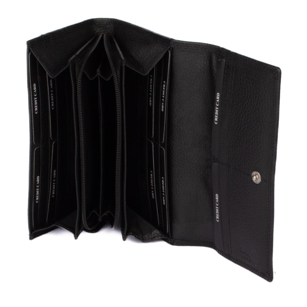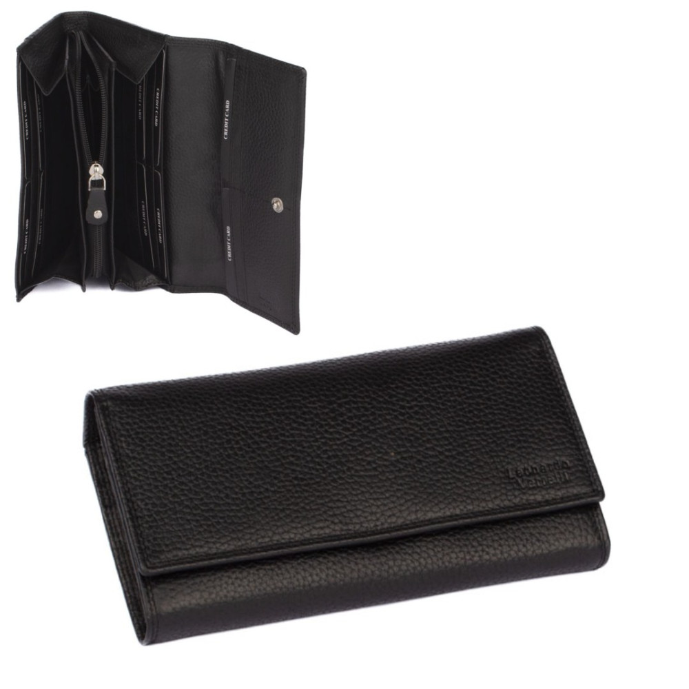 Dámská peněženka kožená z pravé kůže na povrchu pórovité se stane vaším oblíbeným doplňkem. Peněženka se uzavírá velkou klopou přes celou peněženkou s pevným drukem. Po otevření klopy jsou na její vnitřní straně kapsy na karty a tenká kapsa. Další, tentokrát velké kapsy, jsou v druhé části peněženky, ty můžete využít například na bankovky. Po bokách mají kapsy další kapsy na karty. V každé části je jedna tenká kapsa. Dámská peněženka kožená má přesně uprostřed velký mincovník přes celou peněženku uzavřený pořádným zipem s velkým jezdcem. Ten zajistí pohodlné otvírání. Uvnitř je tenká kapsa a dvě větší kapsy, například na mince. Kapsy jsou prošité až na dno, takže už nebudete trousit žádné mince. Na zadní straně peněženky je jedna tenká kapsa přístupná bez nutnosti otevřít peněženku. Tato dámská peněženka kožená je vyrobená z pravé kůže černé barvy a je značky Leonardo Verrelli. Peněženka je dodávána bez dárkové krabičky.