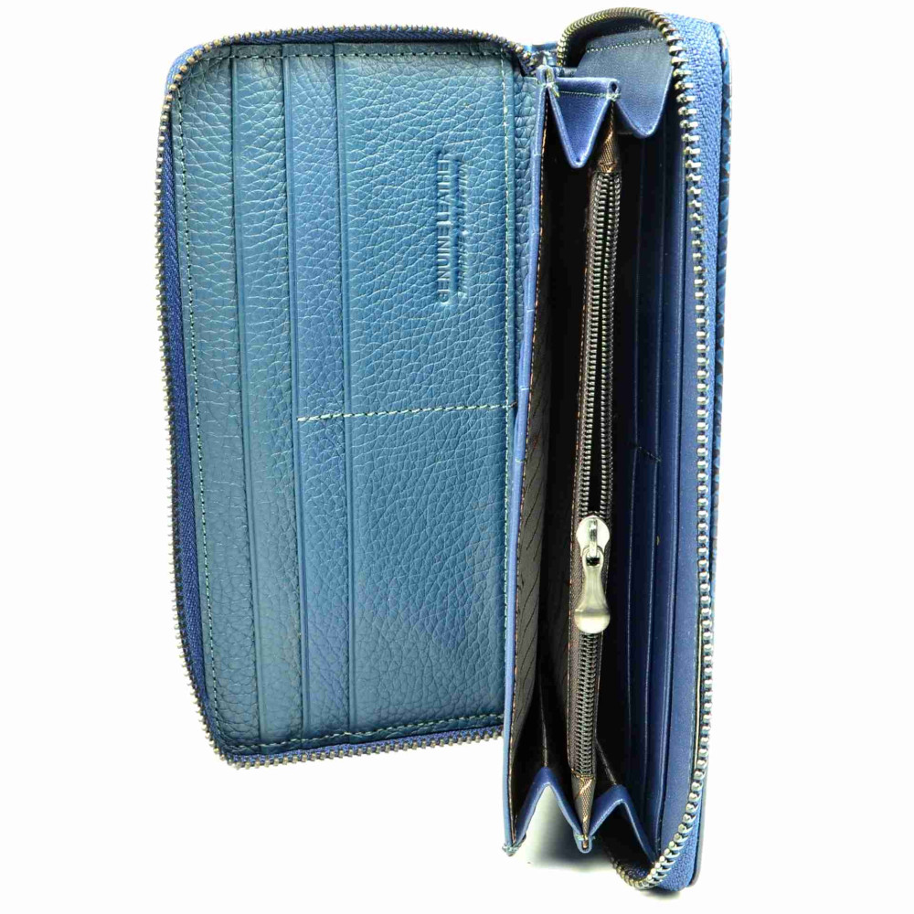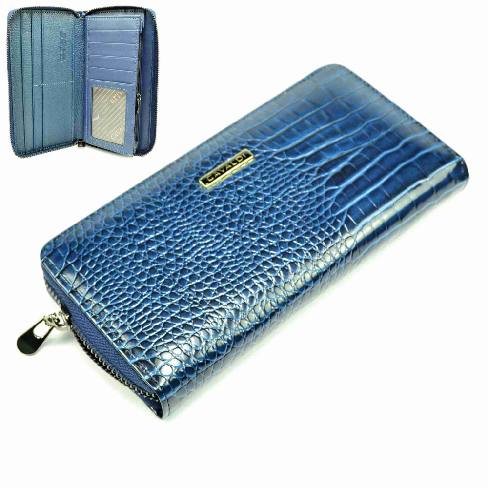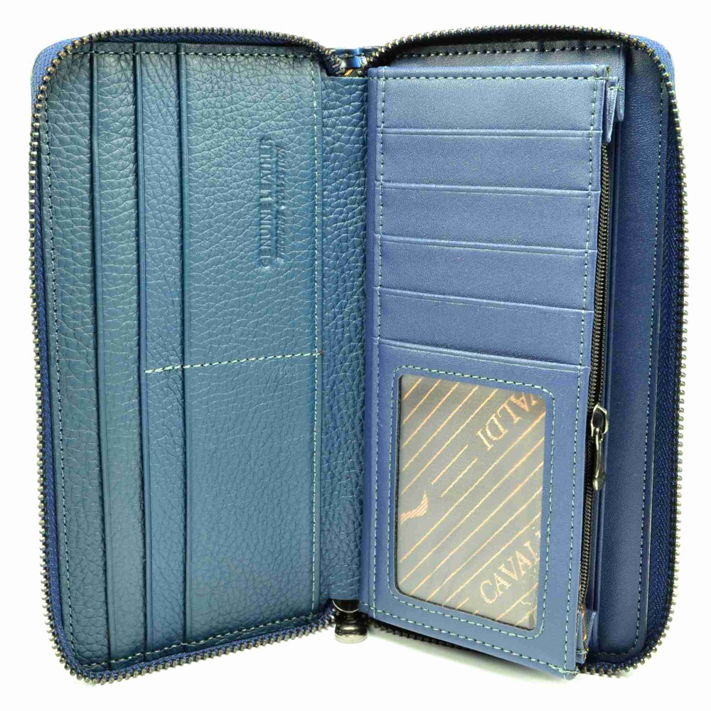 Tato velká dámská peněženka modrá má praktické uzavírání zipem s velkým jezdcem. Po otevření peněženky je ihned přístupná spousta kapes na platební a jiné karty a jedna z nich je průhledná. Za kapsami na karty jsou tenké kapsy pro uložení vašich největších tajností. Na boční straně peněženky jsou dvě velké kapsy na bankovky a mezi nimi jedna menší, uzavíratelná na zip. Ta se dá využít jako mincovník. Dámská peněženka modrá je vyrobena z pravé kůže uvnitř, z venku je z umělé kůže pro stálost barev. Peněženka je dodávána v dárkové krabičce a je značky 4U Cavaldi.
