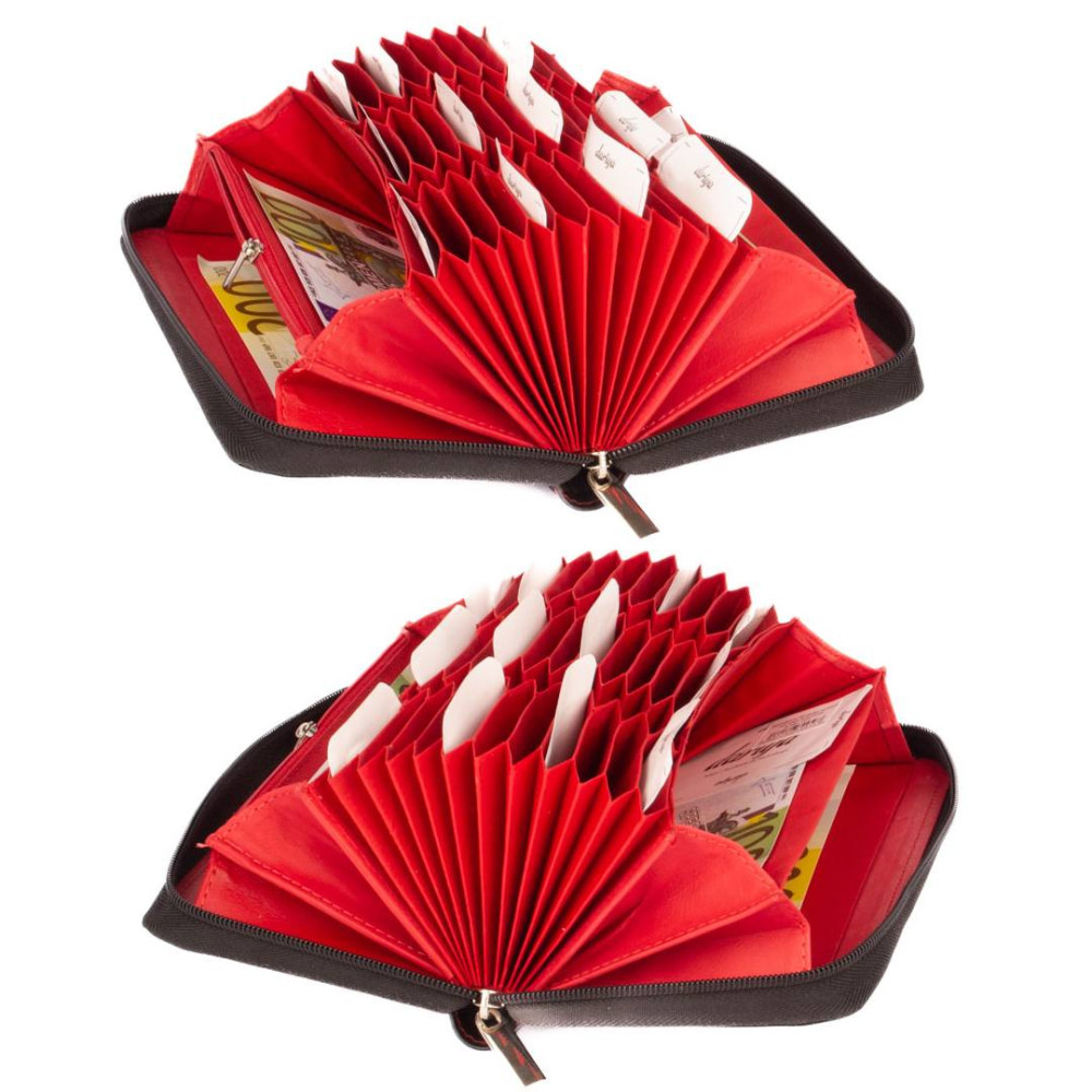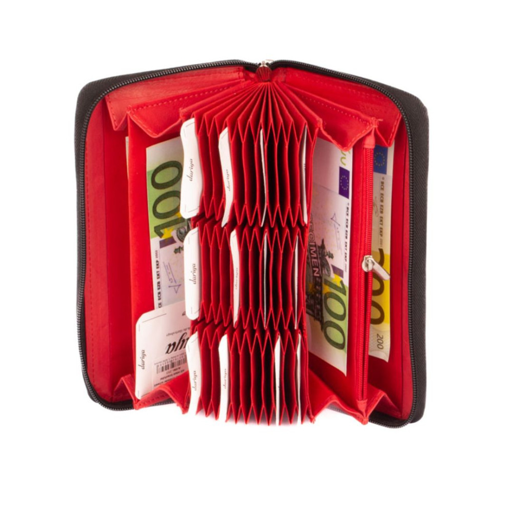 Penálová dámská peněženka na hodně karet jich pojme neuvěřitelných 39 kusů. Navíc má uvnitř parádně uspořádané kapsy na karty, které jsou sešité do vějíře a proto nebudete žádnou kartu dlouho hledat. Uvnitř peněženky jsou další 4 velké kapsy na bankovky a tenký mincovník. Ten se uzavírá zipem. Po stranách peněženky jsou 2 tenké kapsy na vaše tajnosti. Dámská peněženka na hodně karet je vyrobená z pravé kůže černé barvy s červeným prošíváním a je značky Dariya bags. Peněženka je dodávána bez krabičky.