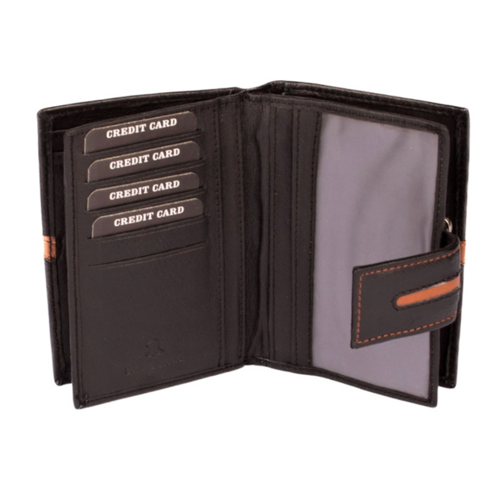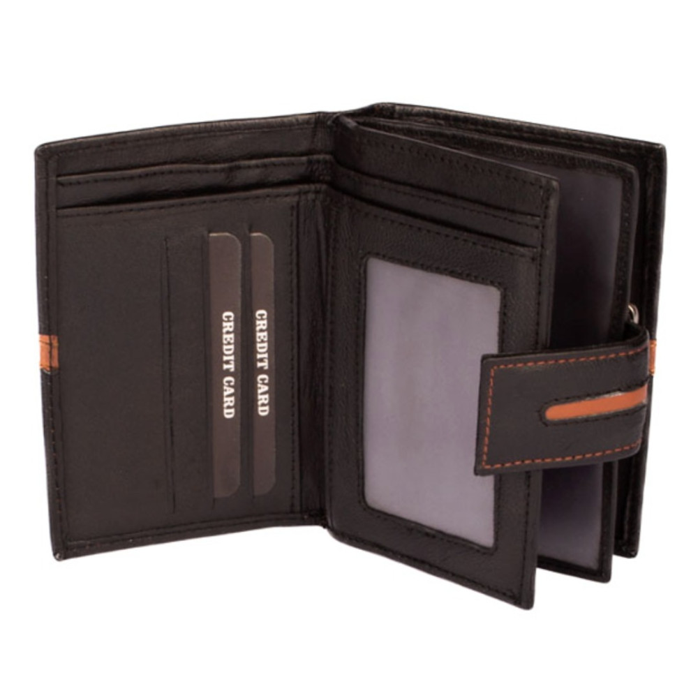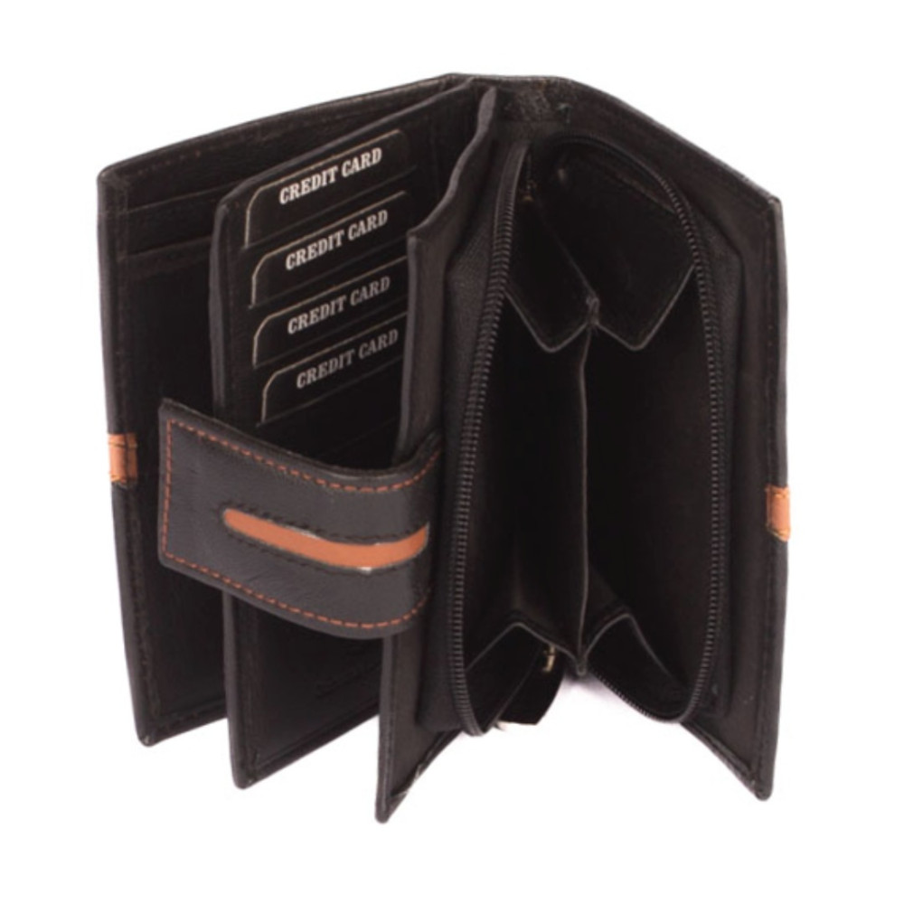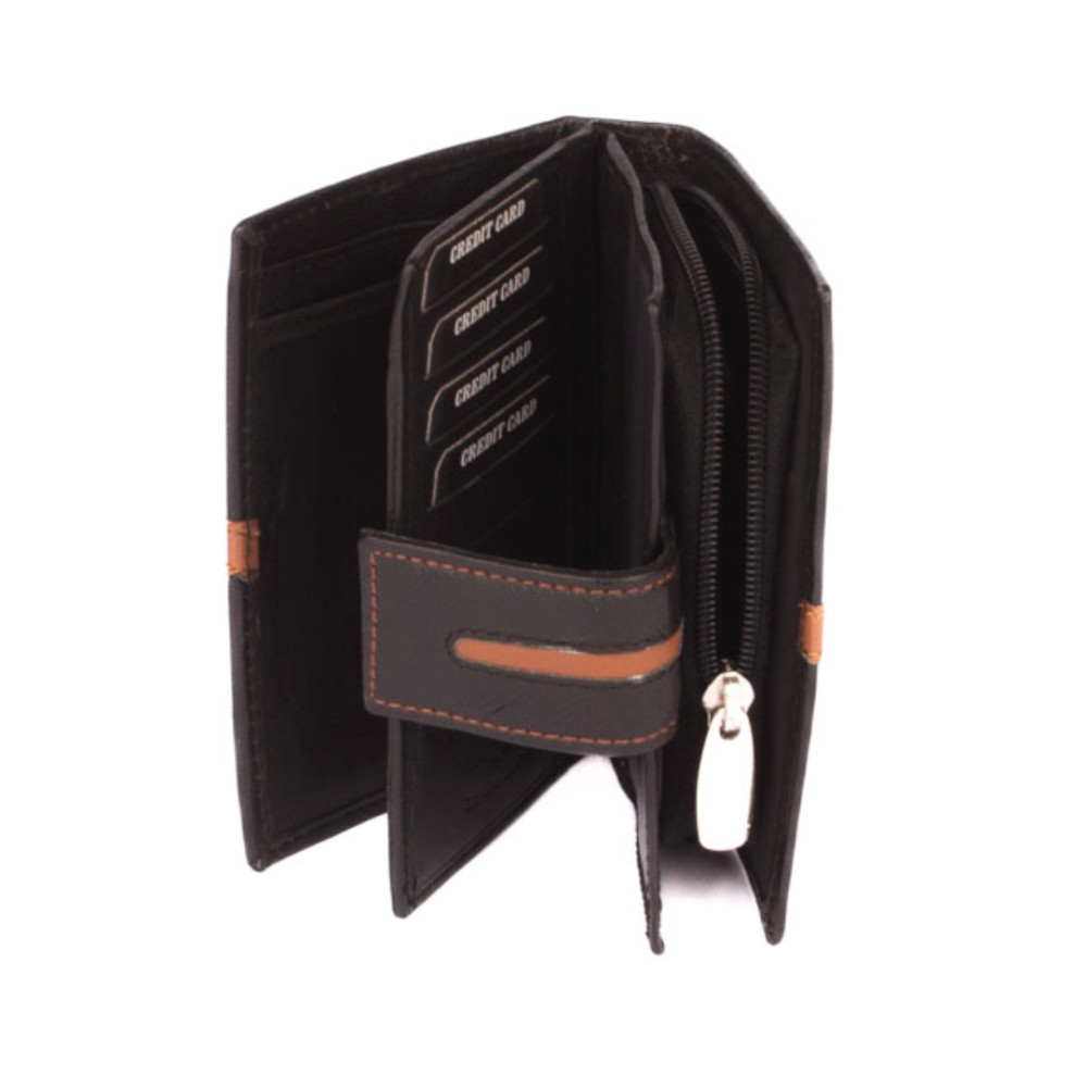 Malá dámská peněženka na zip je rozdělena na dvě části. První část se uzavírá přezkou s pevným drukem. Do této části pohodlně uložíte vaše bankovky. Platební karty uschováte do kapes po stranách a uvnitř peněženky, dvě z kapes jsou průhledné a můžete ji využít například na fotografie vašich blízkých. V této části peněženky jsou také tenké kapsy na vaše tajnosti. Do druhé části peněženky s uzavíráním na zip si můžete dávat třeba drobné mince. Mincovník je rozdělený na dvě poloviny. Peněženka je vyrobena z pravé kůže černé barvy a je dodávána bez dárkové krabičky.