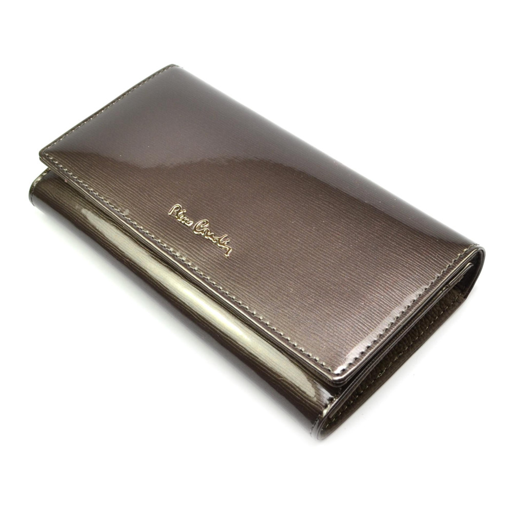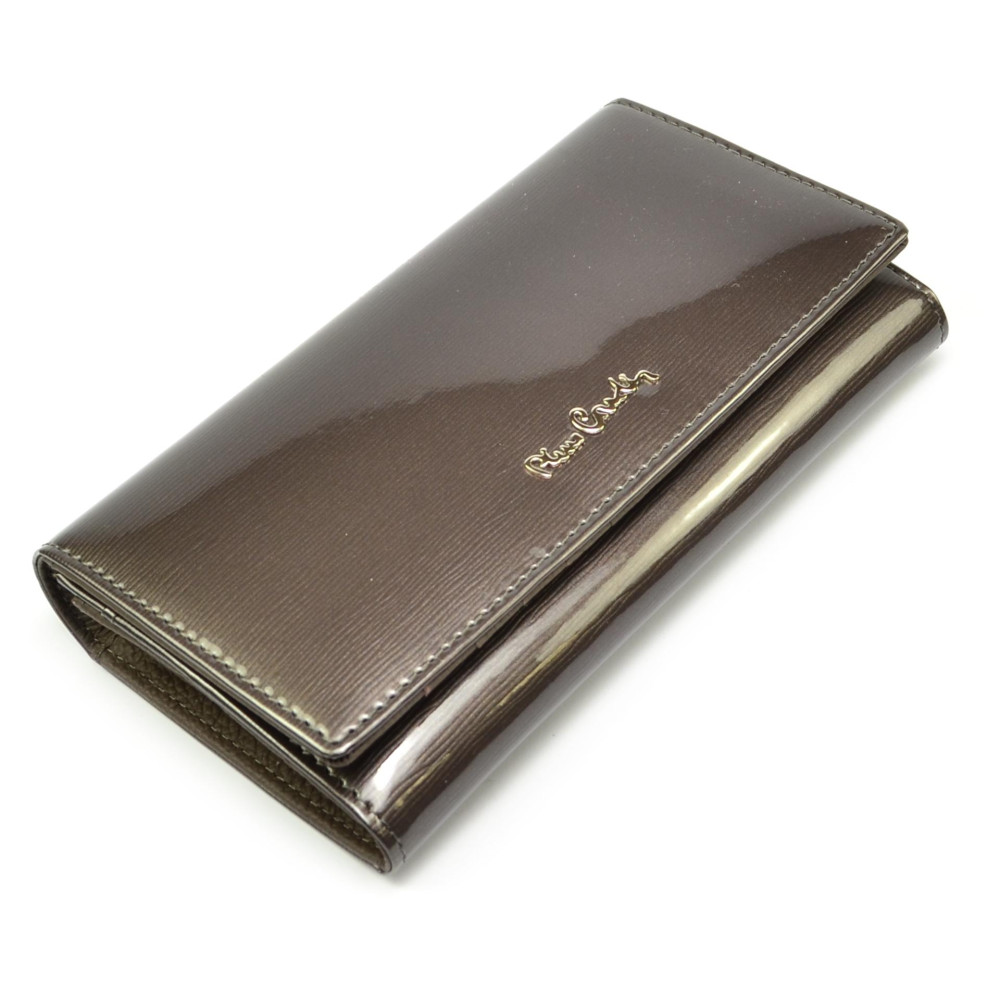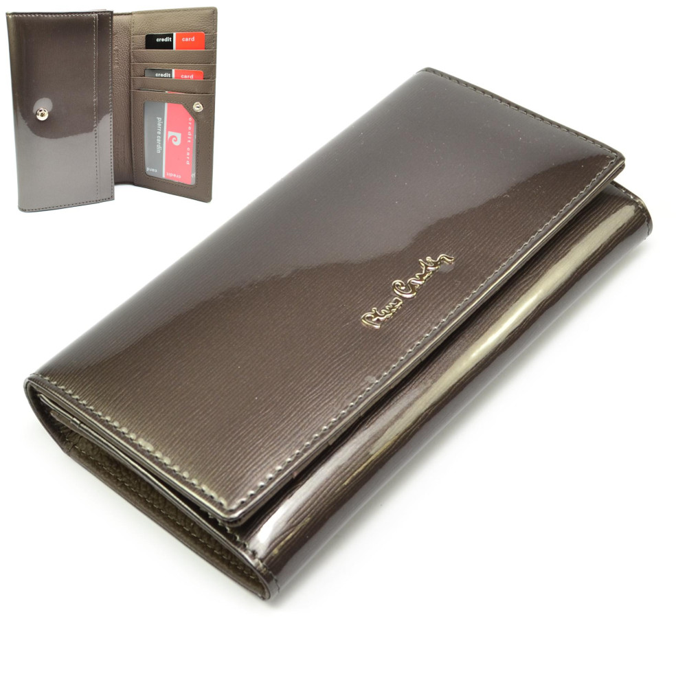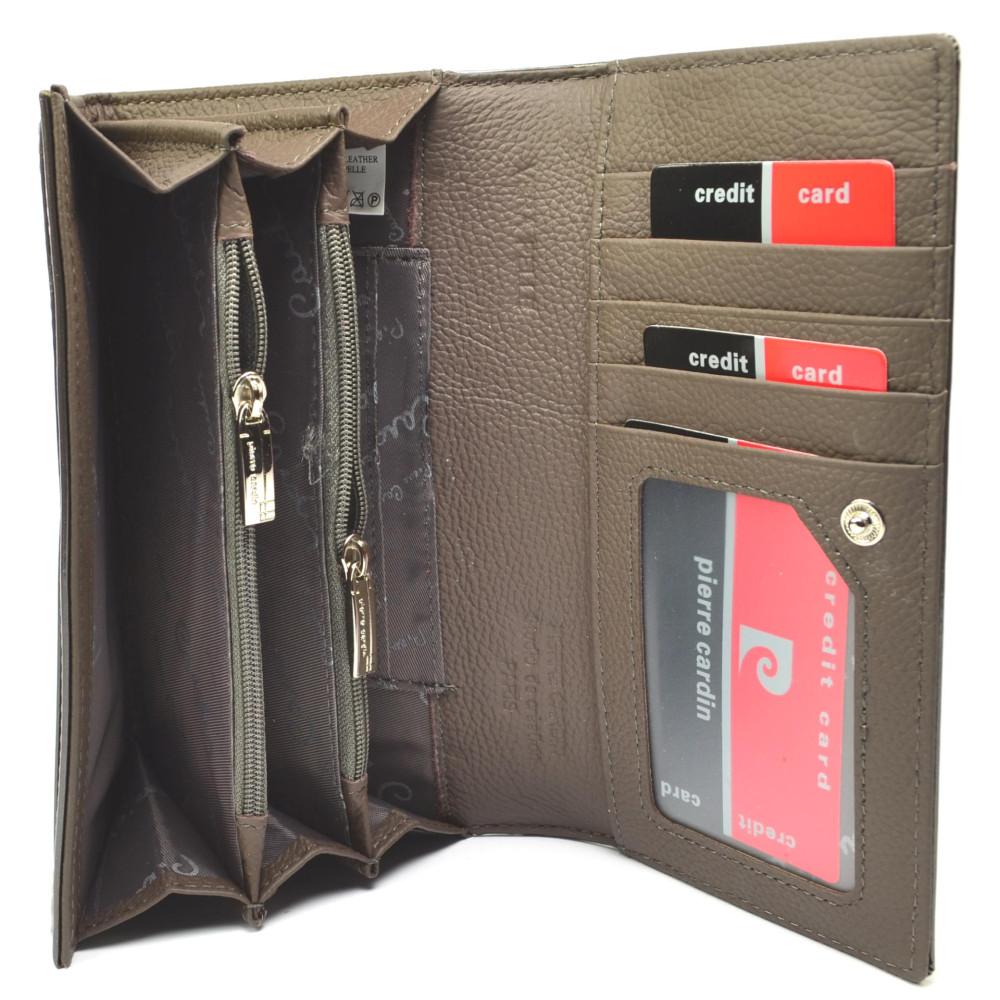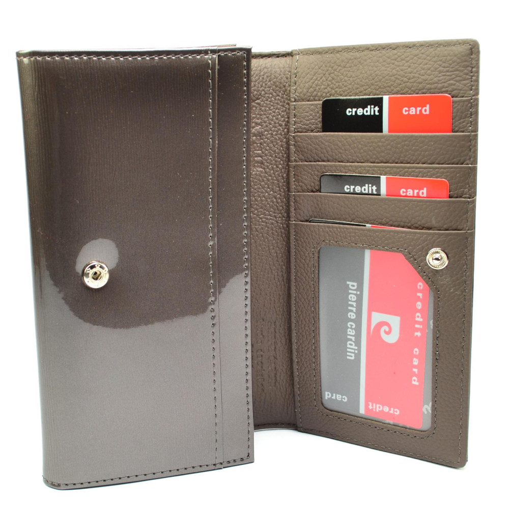 Moderní dámská peněženka velká v nádherné šedo hnědé barvě. Peněženka se uzavírá klopou s pevným drukem. Po otevření klopy jsou přístupné všechny kapsy v peněžence. V klopě jsou další kapsy na karty. Uvnitř velké dámské peněženky dvě menší kapsy na zip, které lze použít jako mincovník. Dámská peněženka velká je vyrobená z pravé kůže. Značka peněženky je Pierre Cardine.