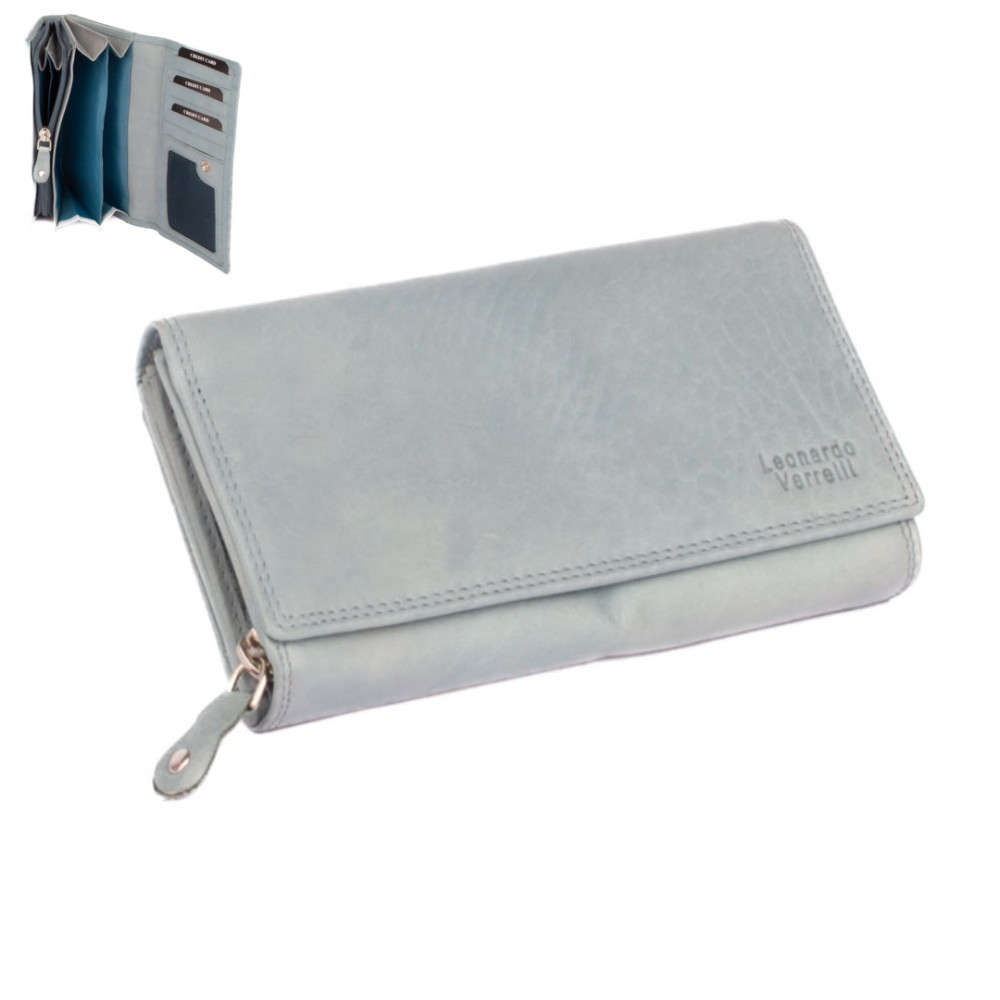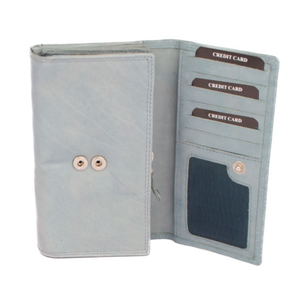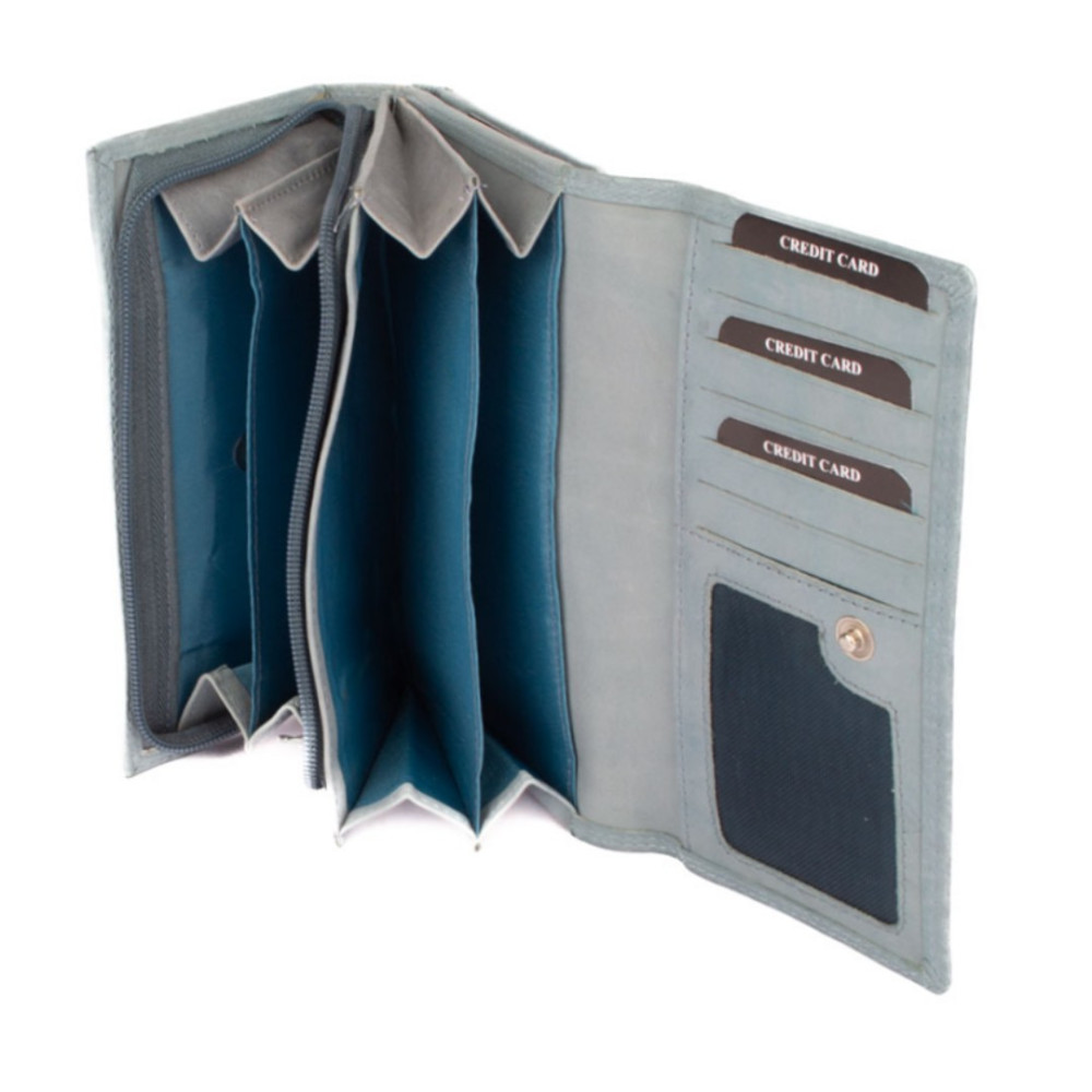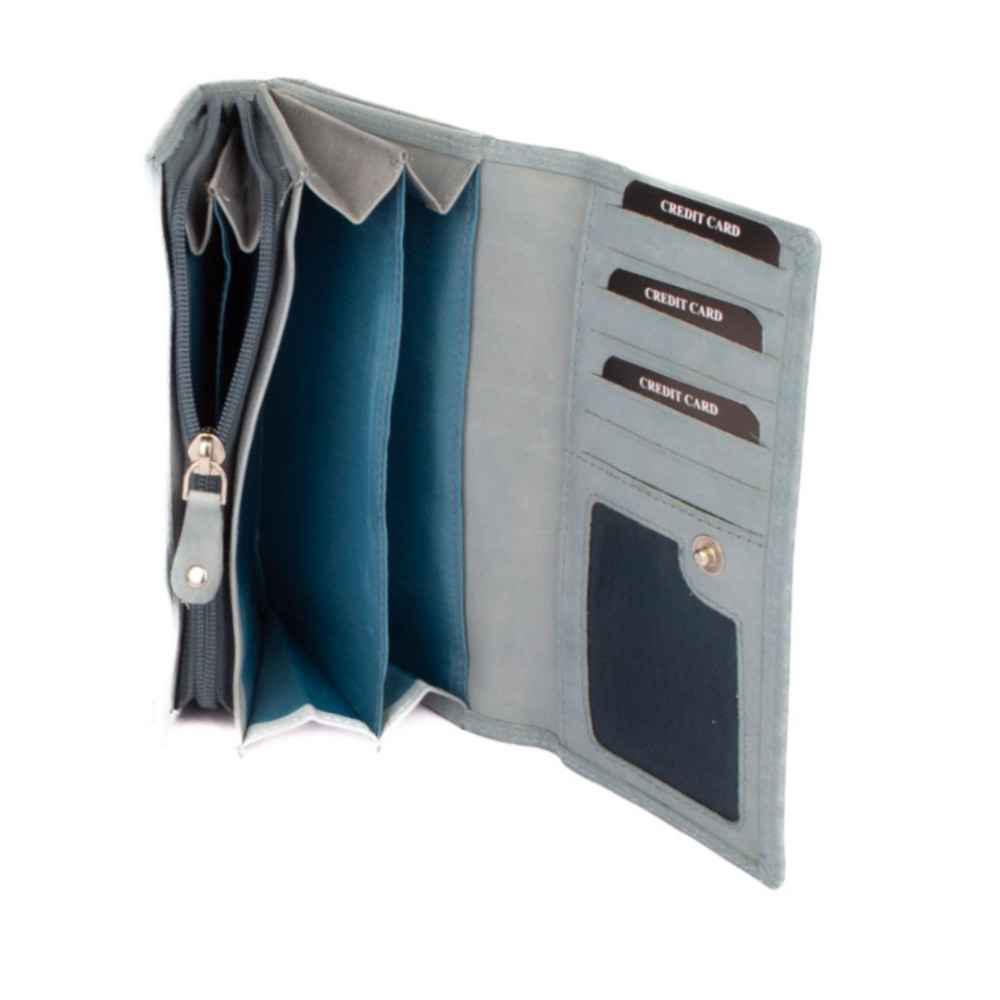 Dámská světlá peněženka je rozdělená na dvě poloviny. Jedna polovina se uzavírá klopou s pevným drukem. Po jejím otevření je přístupných několik kapes na platební a jiné karty, jedna z nich je průhledná. Vedle jsou dvě kapsy na bankovky. Všechny české bankovky je nutné přeložit před vložením. Vedle je kapsa na zip přes celou peněženku s velkým jezdcem pro pohodlné otevírání. Uvnitř jsou dvě velké kapsy na mince. Uplatnění najdete určitě i pro pár tenkých kapes, třeba na nějaké tajné papírky. Druhá polovina peněženky se uzavírá přezkou s pevným drukem. Po jejím otevření se přístupné další kapsy na karty, jedna je průhledná. Peněženka je vyrobená z pravé kůže s ornamenty jemných zrn, má pastelově modrou barvu a je dodávána bez dárkové krabičky. Dámská světlá peněženka je také vybavena RFID ochranou proti nechtěnému čtení karet.
