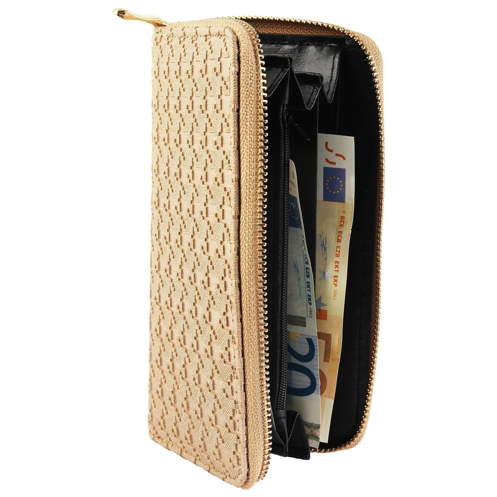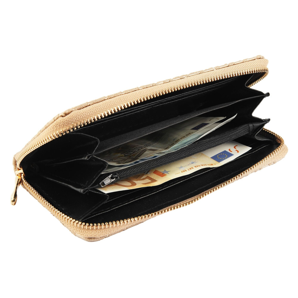 Peněženka je opatřená jednou velkou kapsou se zipem, s velkým jezdcem. Uvnitř velké kapsy naleznete tři větší kapsy určené pro ukládání bankovek a jednu kapsou umístěnou mezi nimi, opatřenou zipem. Jedná se o mincovník. Na bočních stranách peněženky jsou umístěné kapsy určené pro ukládání karet. Těch je celkem osm. Poslední část peněženky představují dvě kapsy tenké. Peněženka patří mezi větší modely. Její rozměry jsou 19 x 10 x 2 cm.