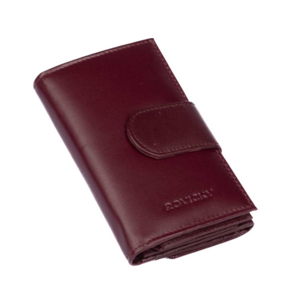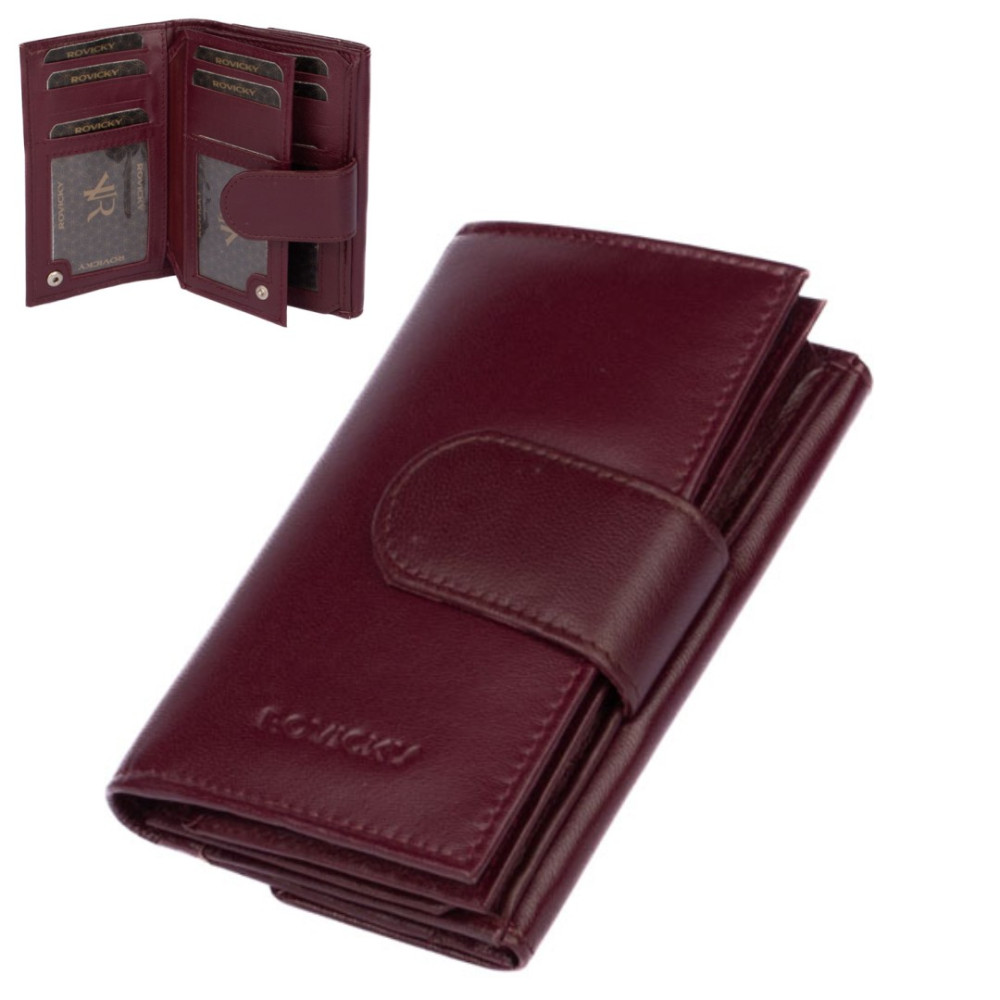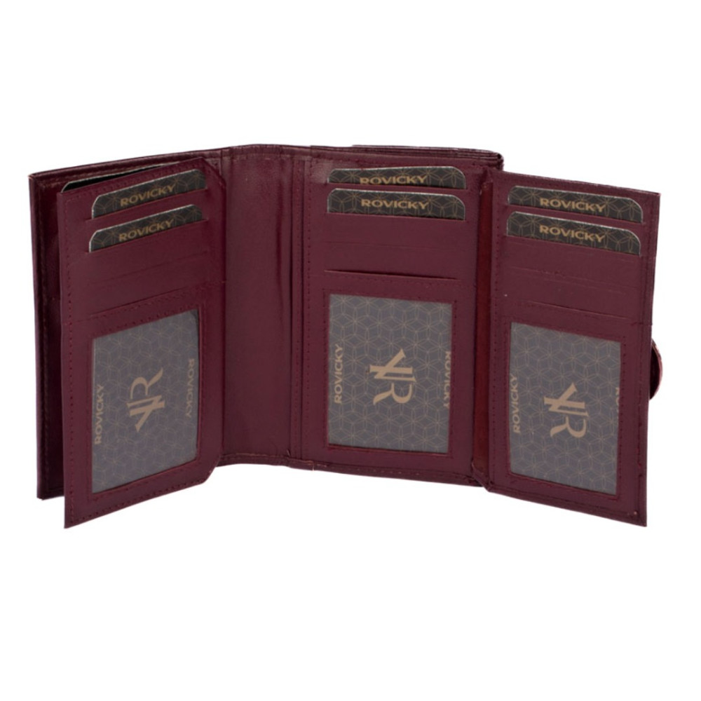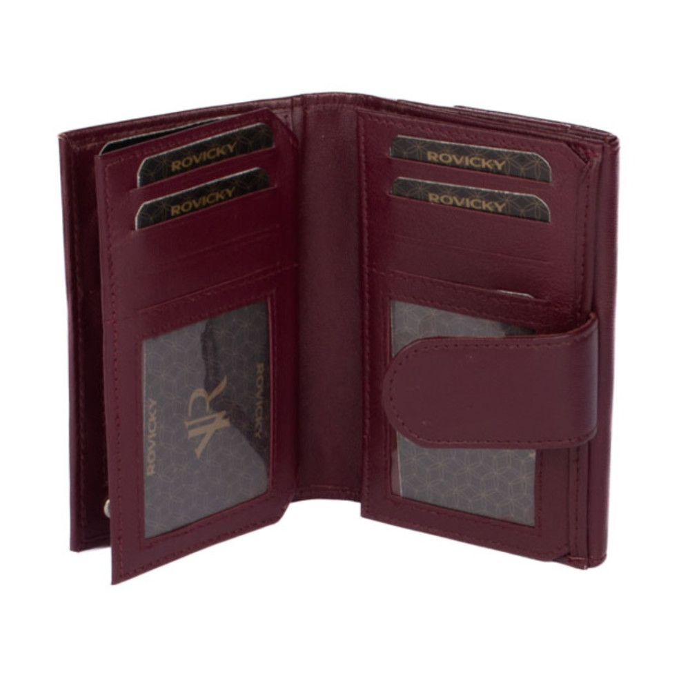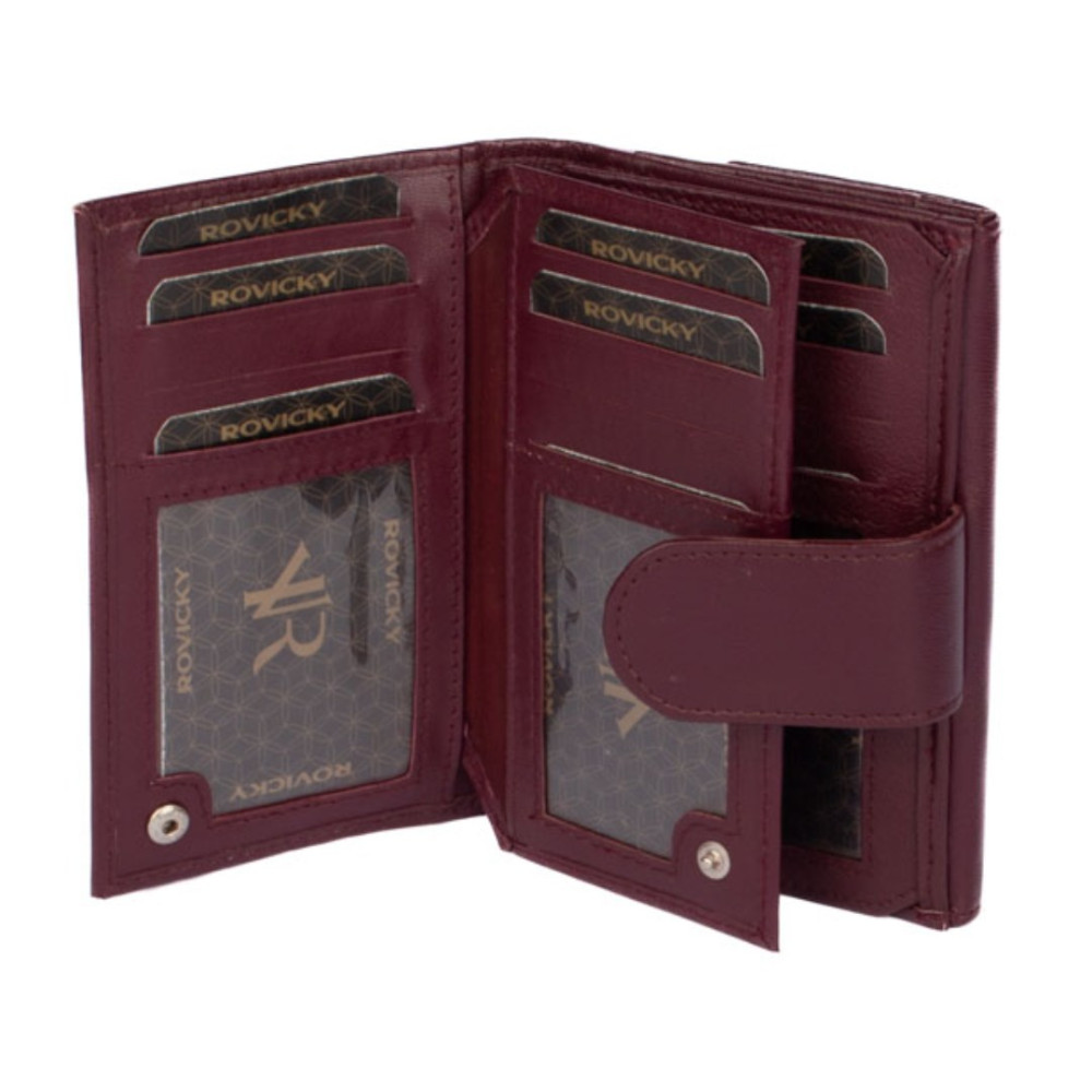 Fialová kožená dámská peněženka s přezkou z pravé kůže je rozdělena na dvě poloviny. První polovina dámské peněženky se uzavírá přezkou s pevným drukem. Druk lze zapnout do dvou poloh, podle zaplnění peněženky. Po otevření této části jsou přístupné všechny kapsy na karty a doklady v několika dalších klopách. Několik kapes na karty je průhledných. V klopách za kapsami jsou další tenké kapsy. Fialová kožená dámská peněženka s přezkou má v druhé polovině peněženky jednu velkou kapsu rozdělenou na několik menších. Tato část peněženky se uzavírá klopou s pevným drukem. Netradičně je v klopě umístěn držák na žeton do košíku. V peněžence nejsou klasické velké kapsy na bankovky, ale pár bankovek pohodlně uložíte do tenkých kapes v peněžence nebo do kapes pod klopou. Tato Fialová kožená dámská peněženka s přezkou je vyrobena z pravé kůže tmavě fialové barvy a je značky Rovicky. Peněženka je dodávána v dárkové krabičce s logem výrobce.