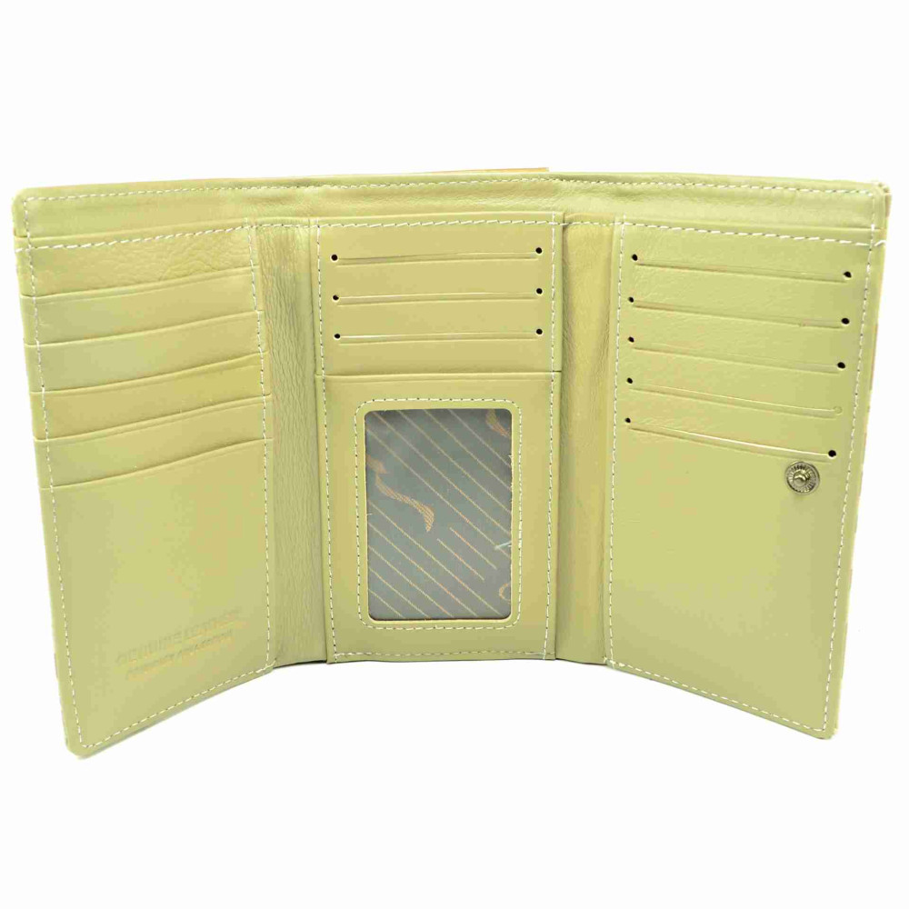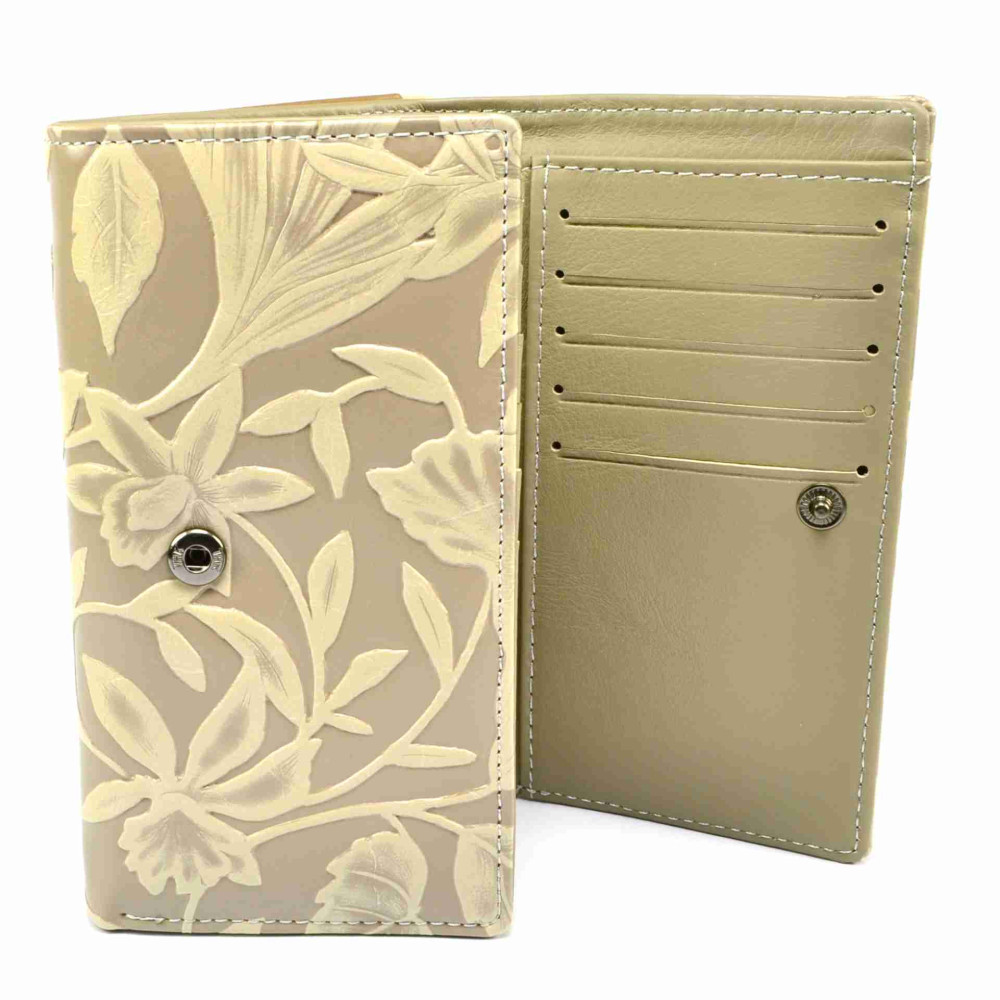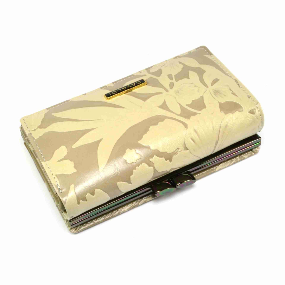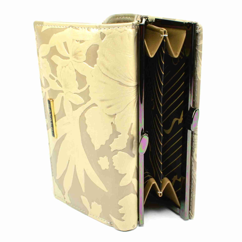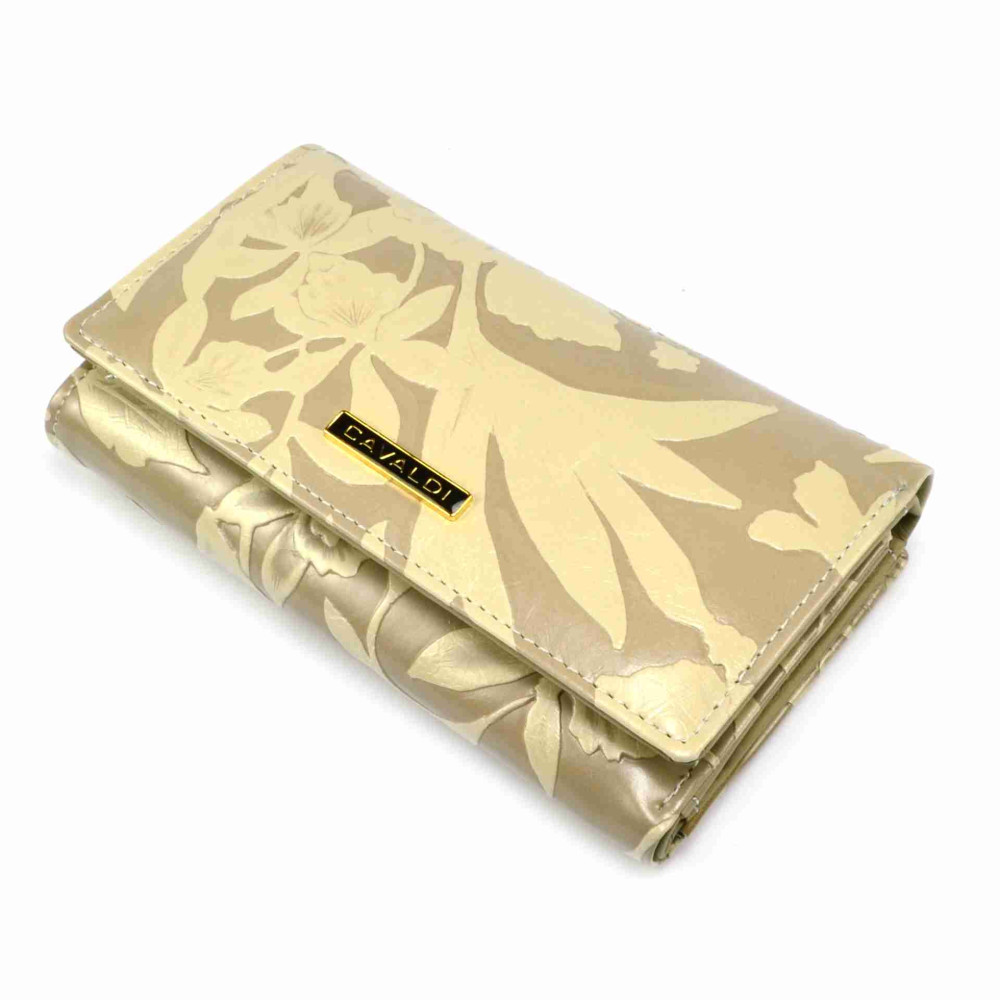 Hnědá dámská peněženka kožená s motivem květin je vyrobená z pravé a umělé kůže. Pravá kůže je uvnitř peněženky a umělá, na povrchu fóliovaná, pro delší životnost barev je z venku. Peněženka má uvnitř klasické členění. Pod velkou klopou s pevným drukem, která dámskou peněženku zavírá, je velká kapsa na bankovky, kapsy na karty a průhledná kapsa na karty. Rámový mincovník je přístupný zvenku a uvnitř mincovníku jsou dvě kapsy. Hnědá dámská peněženka kožená je značky 4U Cavaldi. Každá peněženka má trošku jiný motiv (různé počty květin, listí).