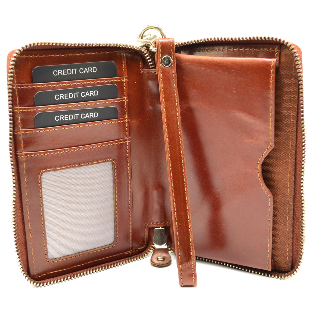 Hnědá peněženka kožená dámská se uzavírá zipem s velkým jezdcem pro pohodlné otevírání. Otevřením kožené peněženky se dostanete ke všem kapsám uvnitř peněženky. V dámské peněžence je také kapsa například na mobilní telefon (rozměr kapsy je cca 13x7cm). Na zadní straně peněženky je kapsa na zip. Peněženka má odnímatelné poutko pro pohodlné nošení bez kabelky. Hnědá peněženka kožená dámská je vyrobena z tmavě hnědé kůže s je značky Rovicky.