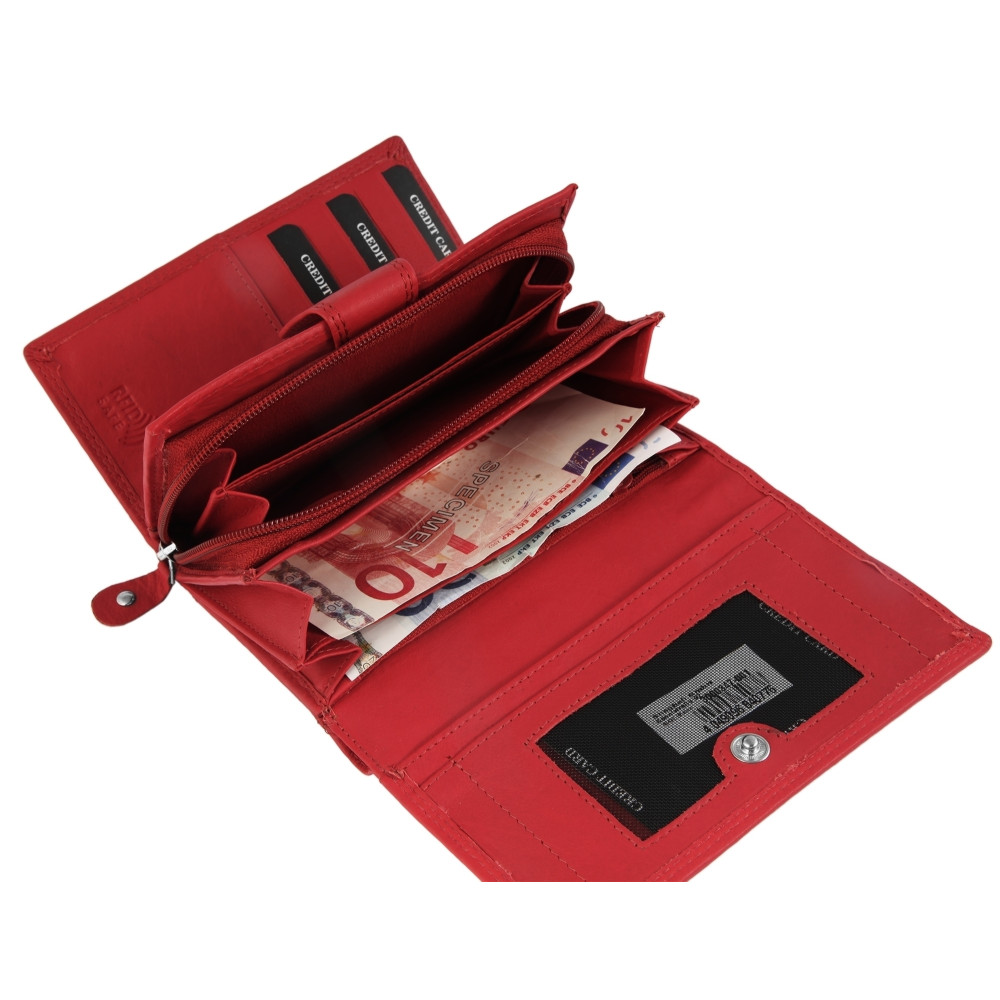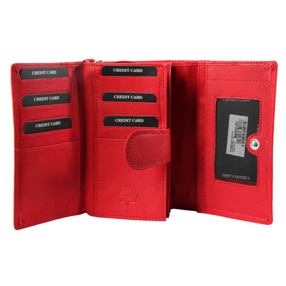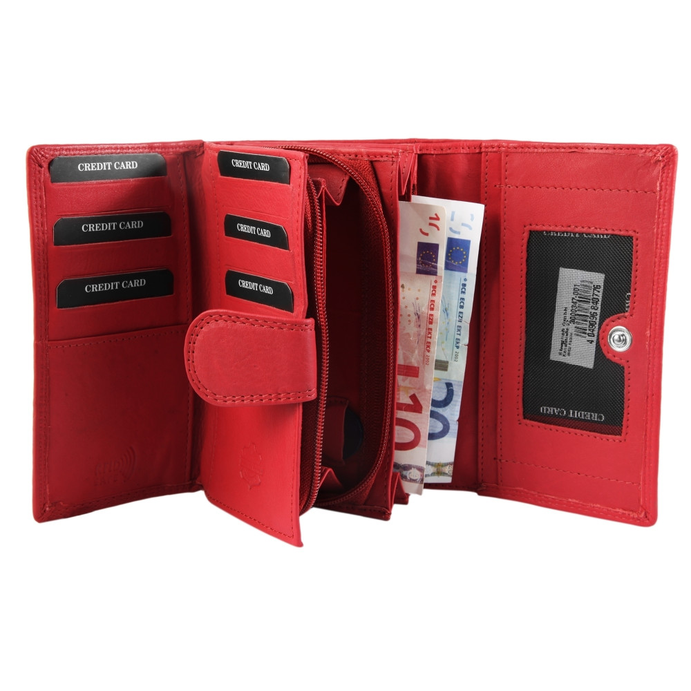 Kožená barevná luxusní peněženka je vyrobená z pravé kůže, světle červené barvy. Uvnitř je peněženka netradičně dorzdělena na tři části. po otevření klopy peněženky jsou přístupné kapsy na karty a bankovky. V další části je mincovník s velkým ezdcem pro pohodlné otevírání. Kapsy v mincovníku jsou prošité až na dno, takže už žádné troušení mincí se konat nebude. Poslední část peněženky je uzavřená přezkou s pevným drukem a jsou pod ní spousty kapes na karty. Na zadní straně peněženky je kapsa uzavíratelná zipem. Peněženka je vyrobena z jemné měkké kůže a je značky Leonardo Verrelli.