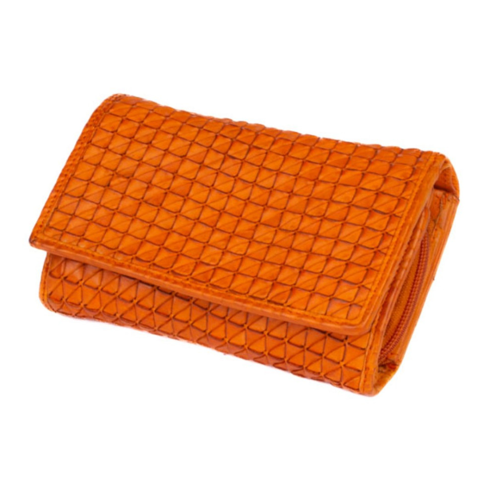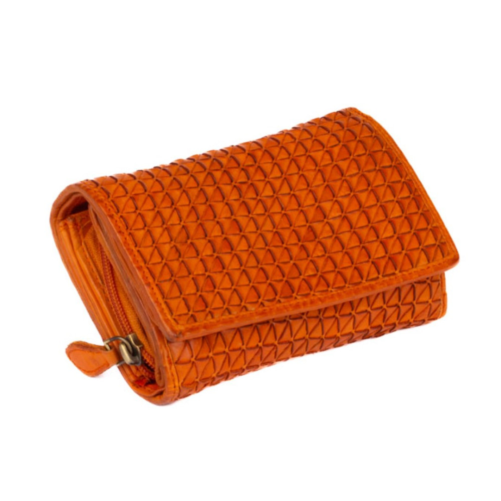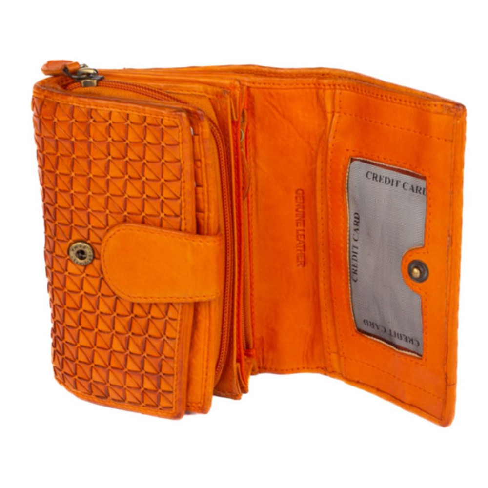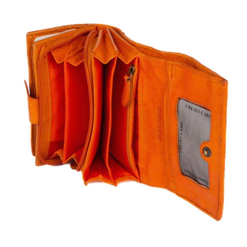 Kožená dámská peněženka barevná v nádherné oranžové barvě. Kožená dámská peněženka barevná je rozdělena na dvě části a zavírá se klopou s pevným drukem. Po otevření klopy jsou ihned přístupné tenké kapsy, dvě menší kapsy uvnitř peněženky a velká kapsa na bankovky v klopě i peněžence. V prostřední části peněženky je mincovník, který se uzavírá zipem s velkým jezdcem pro pohodlné otevírání. Pod vnitřní přezkou s pevným drukem jsou všechny kapsy na karty ukryty tak, aby byly v bezpečí. Peněženka je vyrobena z pravé kůže a vypadá jako by byla šitá z malých čtverečků. Peněženka je oranžové barvy a je zabalena v dárkové krabičce.