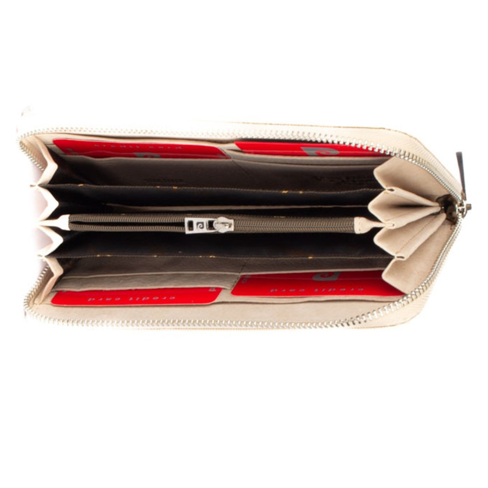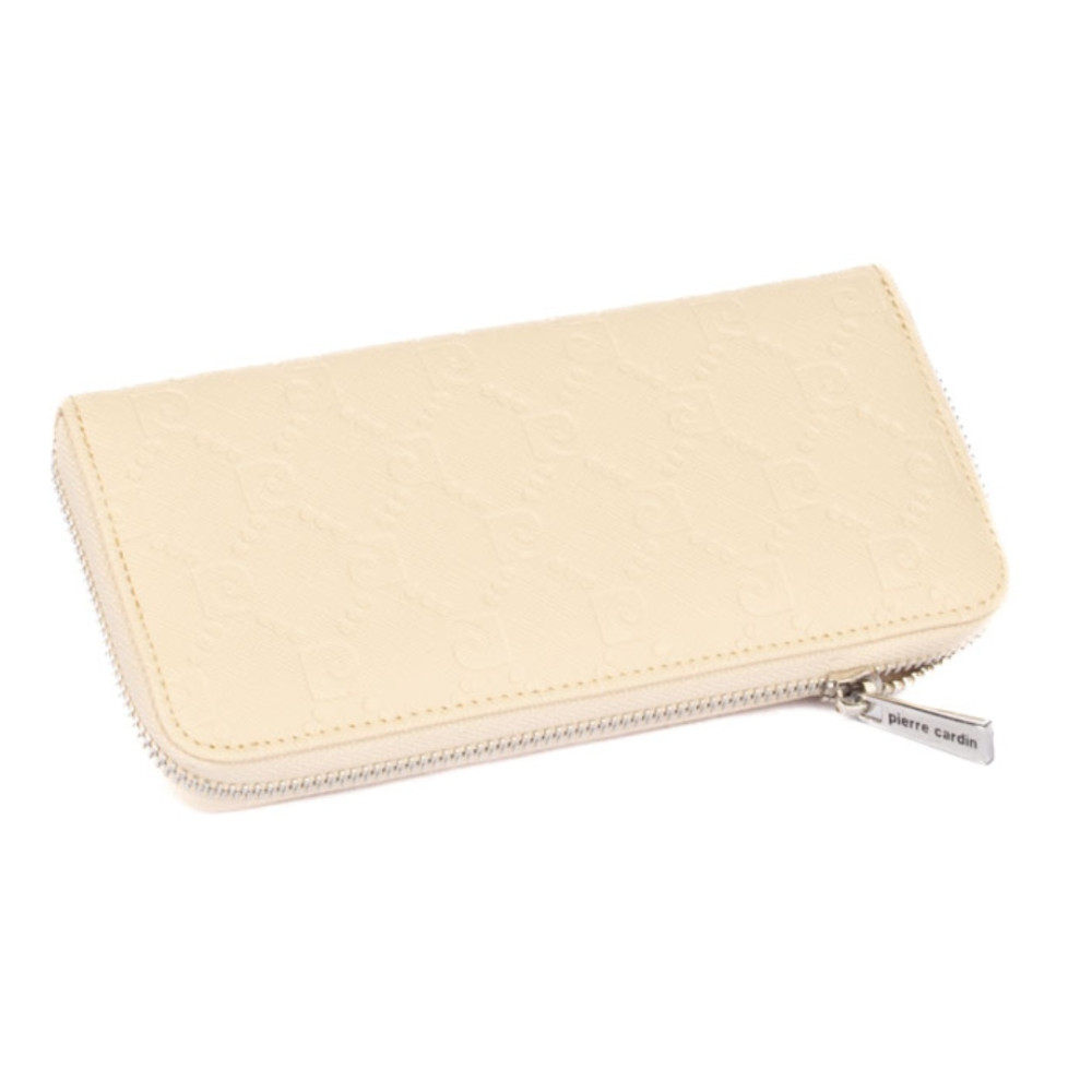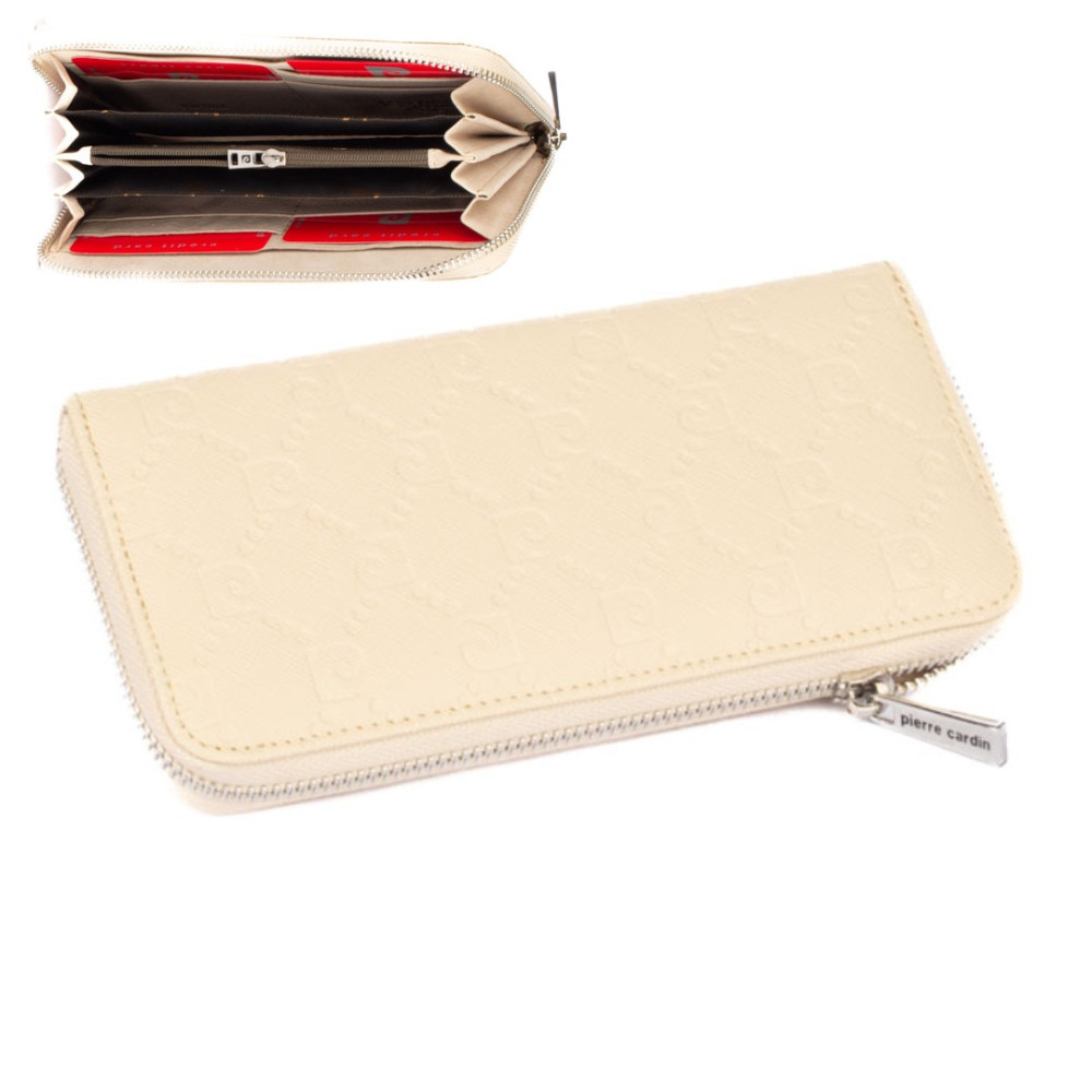 Kožená peněženka dámská s ornamenty a praktickým uzavíráním masivním zipem. Tato kožená dámská peněženka má dostatek kapes na bankovky a ostatní papírky, platební a jiné karty. Samozřejmostí peněženky je velký mincovník, který se uzavírá dalším zipem. Kožená peněženka dámská je vyrobená z umělé kůže krémové barvy zvenku a pravé kůže zevnitř. Peněženka je z kolekce Pierre Cardin.