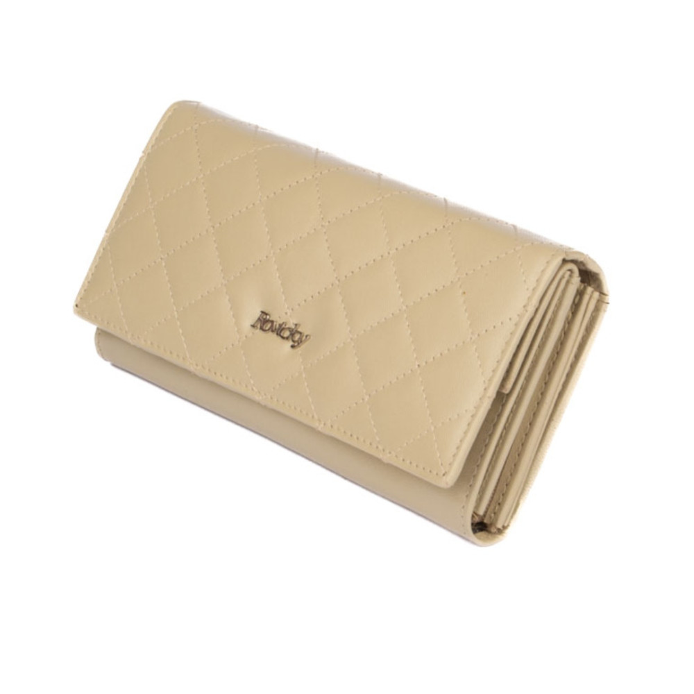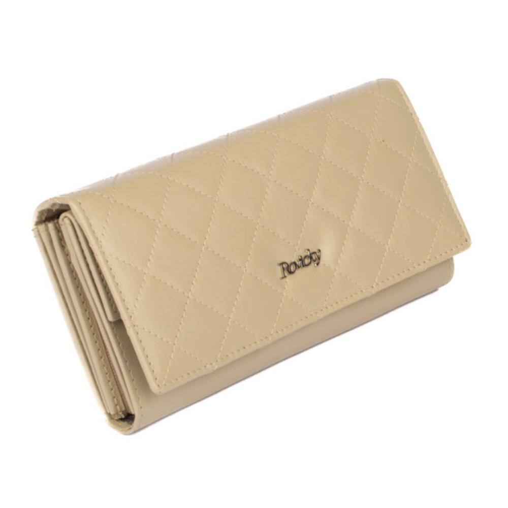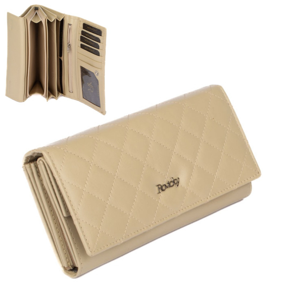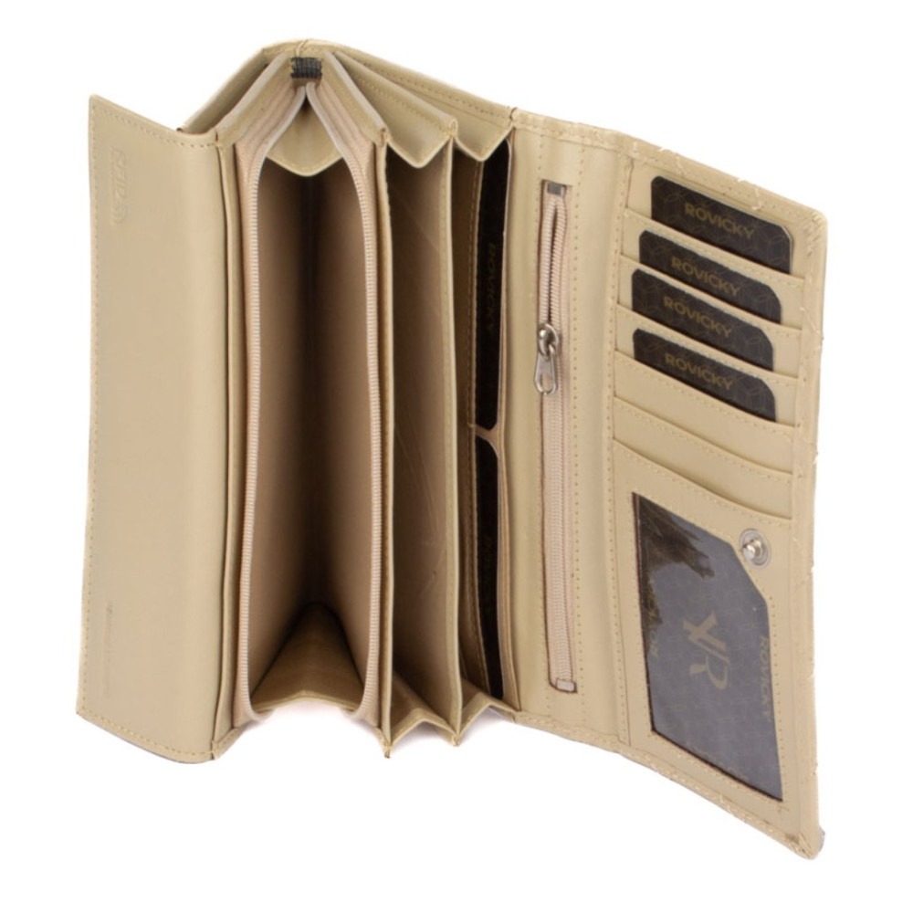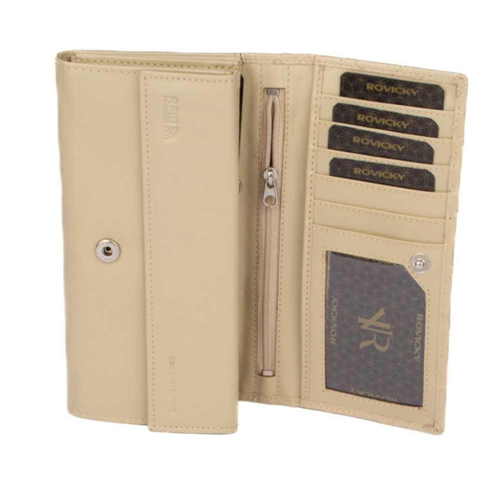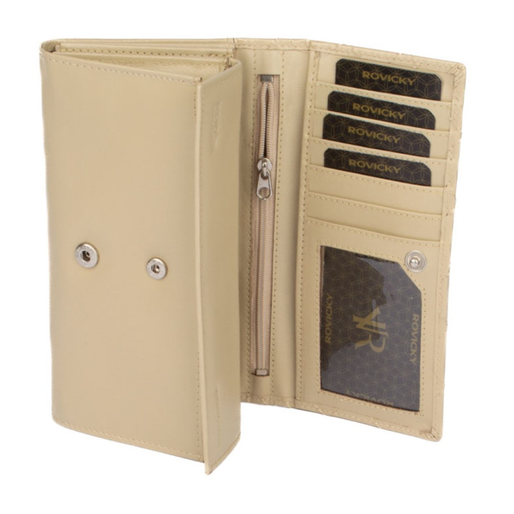 Luxusní dámská peněženka kožená je vyrobená z pravé kůže béžové barvy. Peněženka je prošívaná jemnou nití s moderními kosočtverci. Luxusní dámská peněženka kožená se uzavírá klopou s pevným drukem. Po otevření klopy jsou v pravé části peněženky hned přístupné kapsy na karty, jedna z nich je průhledná. V druhé části peněženky je další klopa s menší kapsou přes celou peněženku. Uvnitř peněženky jsou velké kapsy na bankovky přes celou peněženku, tenké kapsy a jedna tenká kapsa na zip. Mincovník se uzavírá zipem a je prošitý až na dno kapsy, takže žádné drobné nebudete nikde trousit. Luxusní dámská peněženka kožená je vyrobena z pravé kůže béžové barvy, je značky Rovicky a je dodávána v dárkové krabičce s logem výrobce.