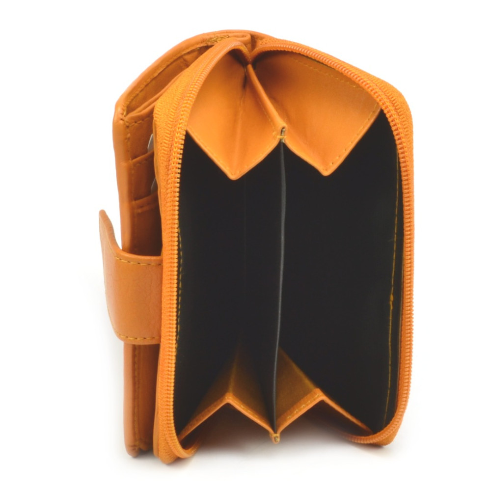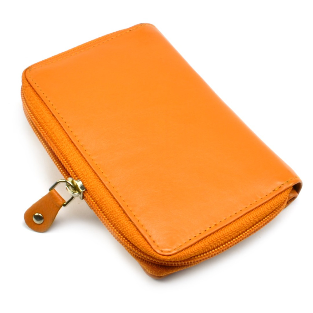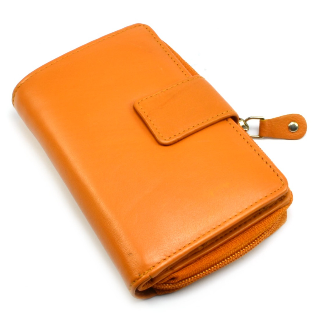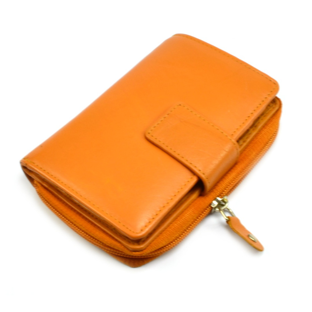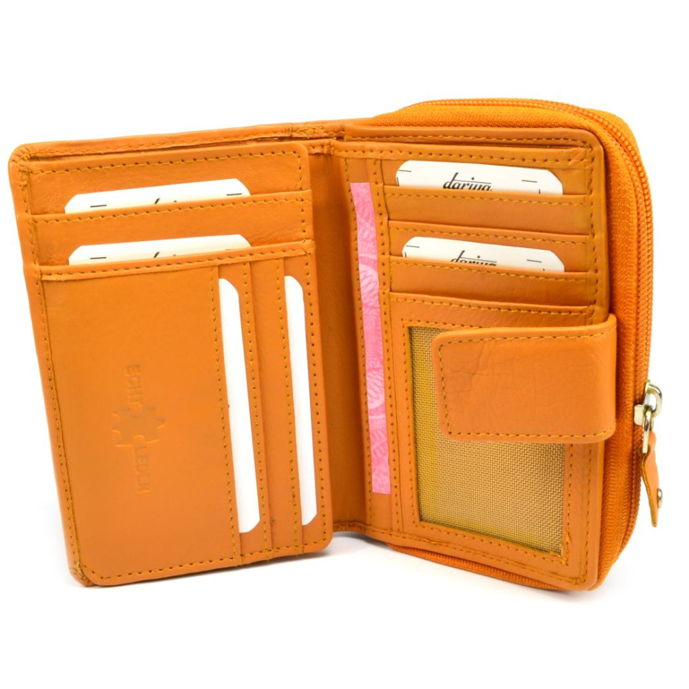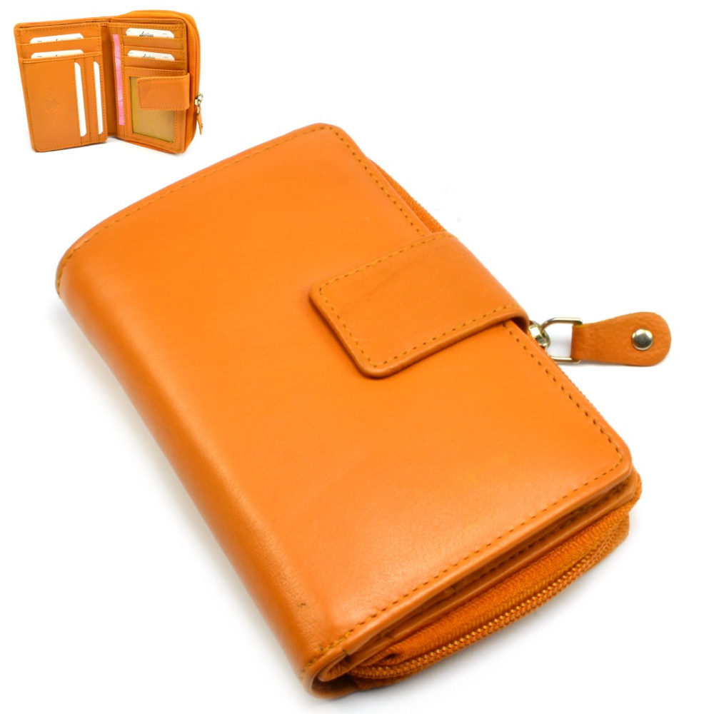 Malá peněženka oranžová vyrobená z pravé měkoučké kůže se uzavírá přezkou s pevným drukem. Po otevření přezky je přístupná část peněženky s kapsami na karty a doklady, některé kapsy jsou průhledné. Kapsy na bankovky jsou samozřejmostí stejně jako tenké kapsy na vaše tajnosti. Druhá část peněženky se uzavírá zipem a je v ní mincovník, rozdělený na dvě kapsy.