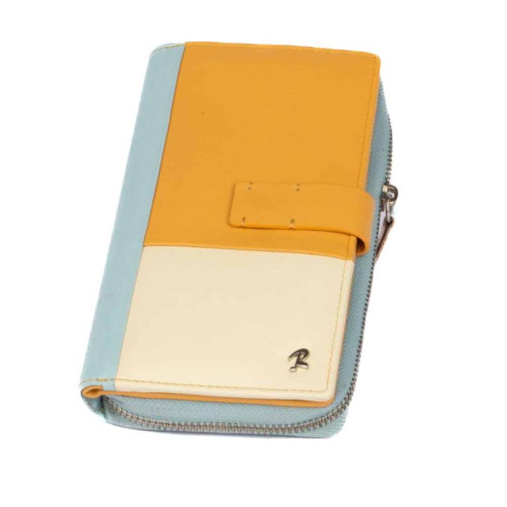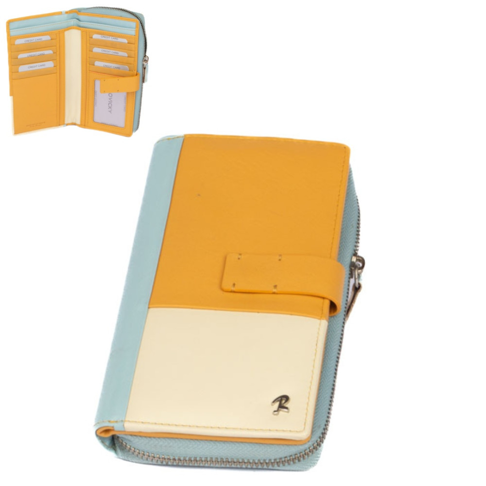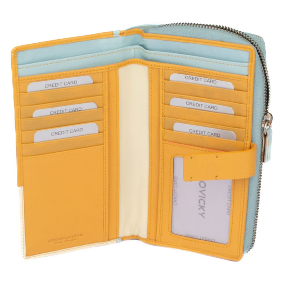 Peněženka barevná dámská v barevné kombinaci světle modré a béžové barvy je vyrobená z měkoučké pravé kůže. Peněženka má v jedné polovině jednu velkou kapsu na zip, která je přístupná bez nutnosti otevřít peněženku. Kapsa je dělená na tři kapsy. Do jedné velké kapsy lze dát i mobil velikosti cca 15,5 x 7,5 cm. Další kapsu, tenkou na zip, lze využít jako mincovník na pár mincí. Druhá polovina peněženky se uzavírá přezkou s pevným drukem. Po otevření přezky jsou přístupné velké kapsy na bankovky přes celou peněženku a spousta kapes na platební karty. Jedna kapsa je průhledná. Peněženka barevná dámská je značky Rovicky a je dodávána v dárkové krabičce s logem výrobce.