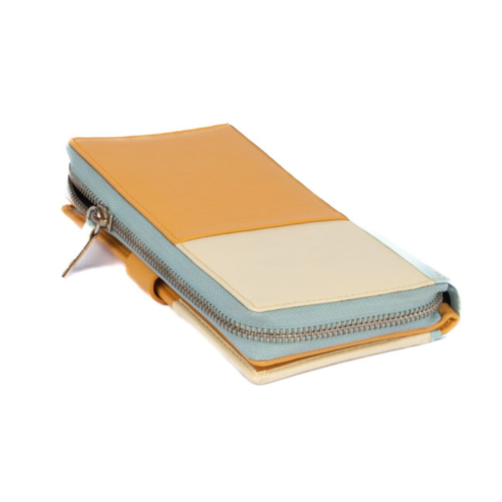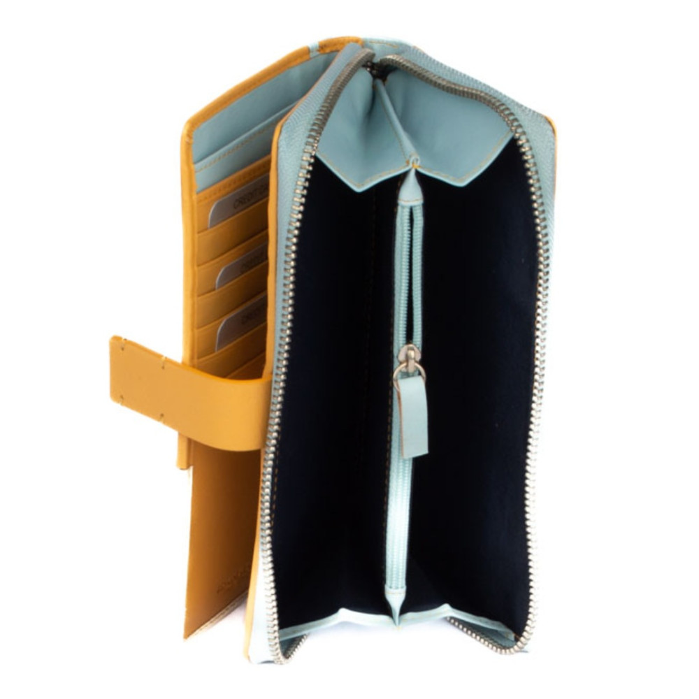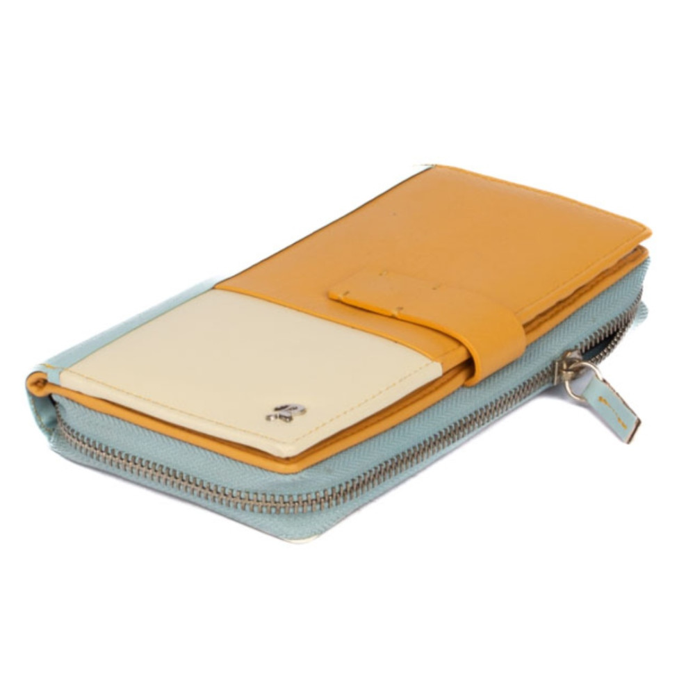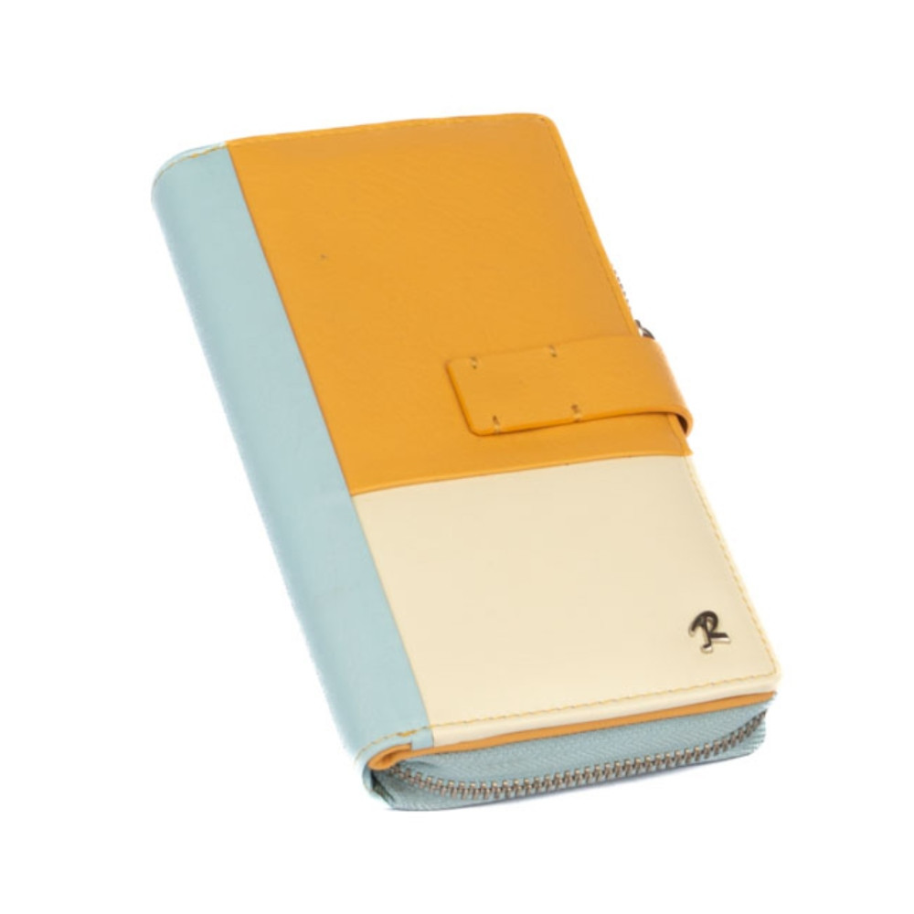 Peněženka barevná dámská v barevné kombinaci světle modré a béžové barvy je vyrobená z měkoučké pravé kůže. Peněženka má v jedné polovině jednu velkou kapsu na zip, která je přístupná bez nutnosti otevřít peněženku. Kapsa je dělená na tři kapsy. Do jedné velké kapsy lze dát i mobil velikosti cca 15,5 x 7,5 cm. Další kapsu, tenkou na zip, lze využít jako mincovník na pár mincí. Druhá polovina peněženky se uzavírá přezkou s pevným drukem. Po otevření přezky jsou přístupné velké kapsy na bankovky přes celou peněženku a spousta kapes na platební karty. Jedna kapsa je průhledná. Peněženka barevná dámská je značky Rovicky a je dodávána v dárkové krabičce s logem výrobce.