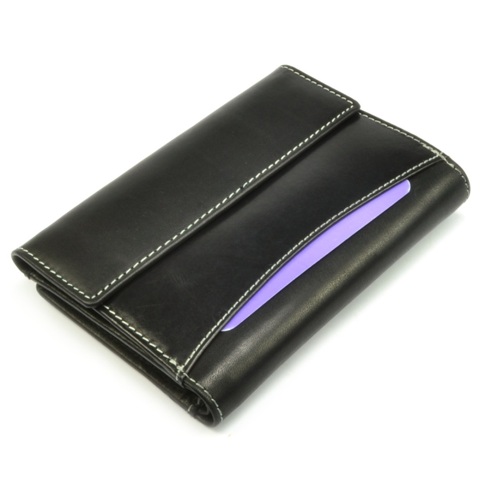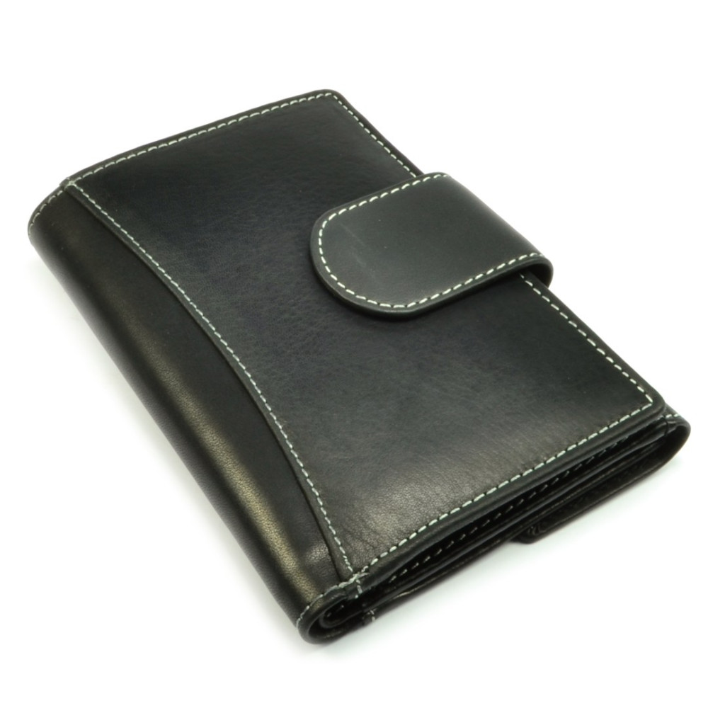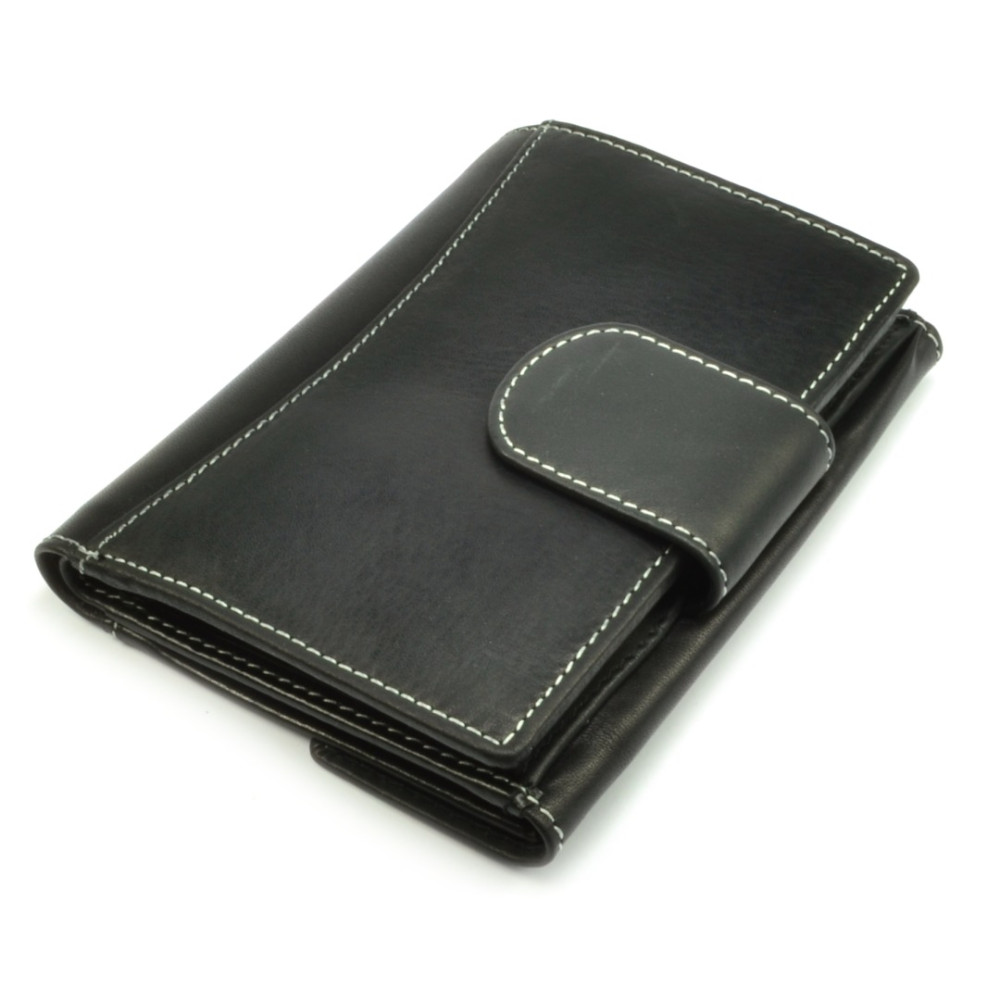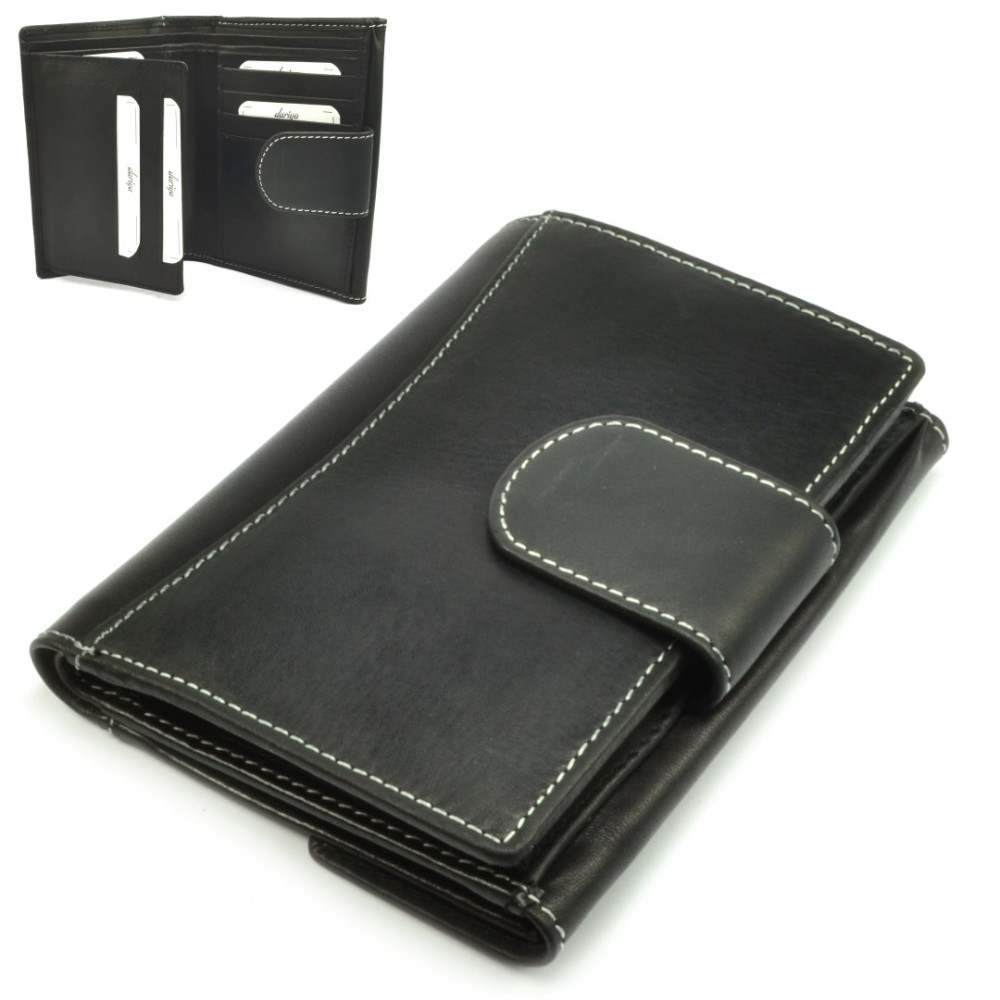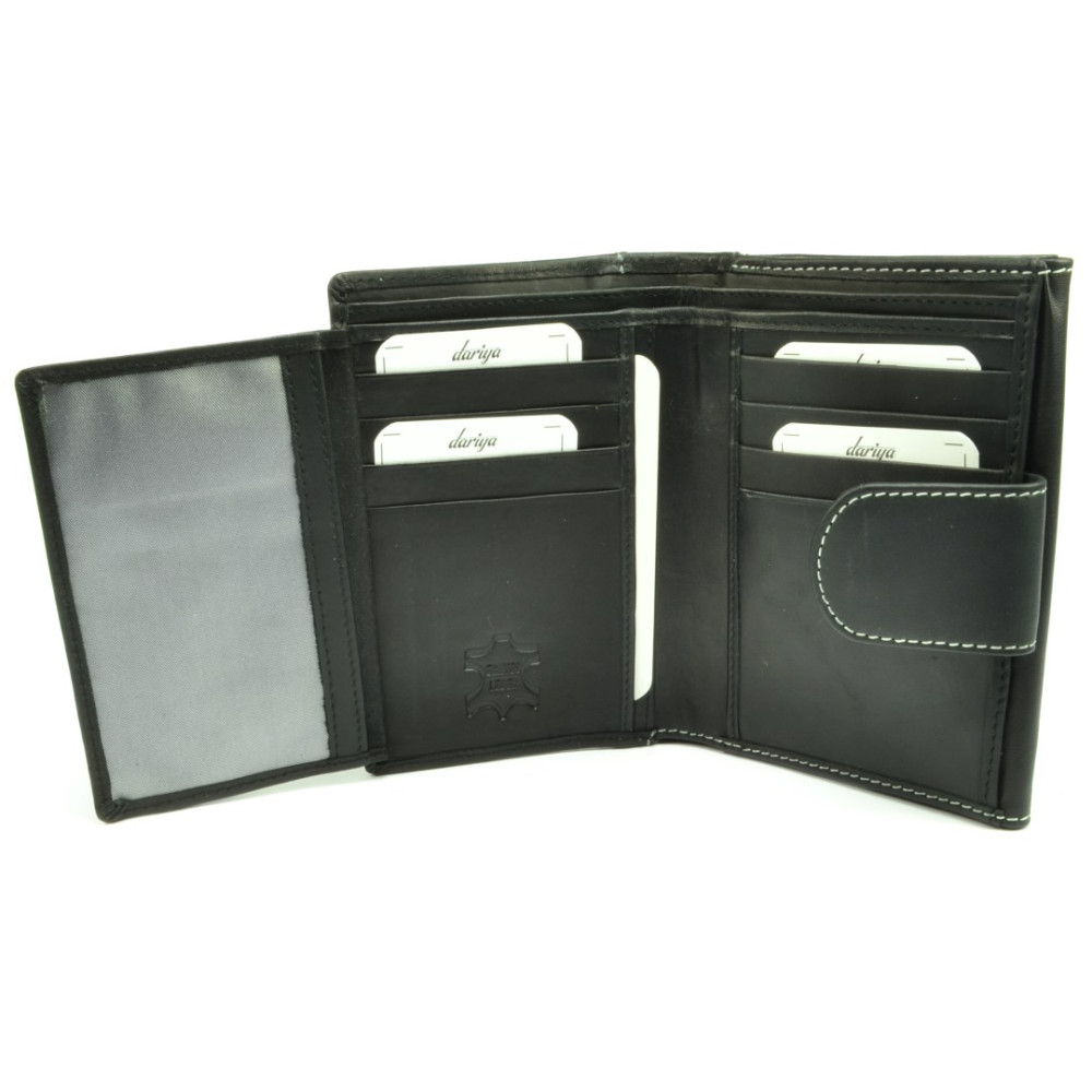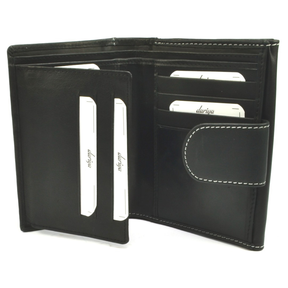 Velká peněženka dámská černá z pravé kůže a klopou i přezkou je rozdělená na dvě poloviny. Po otevření části z přezkou jsou přístupné kapsy na karty, doklady a bankovky. Ve druhé části peněženky, která se uzavírá klopou s pevným drukem je velká kapsa. Tuto kapsu můžete využít jako mincovník. Vedle klopy je tenká kapsa přístupná bez nutnosti otevřít peněženku. Peněženka dámská černá je značky Dariya Bags.