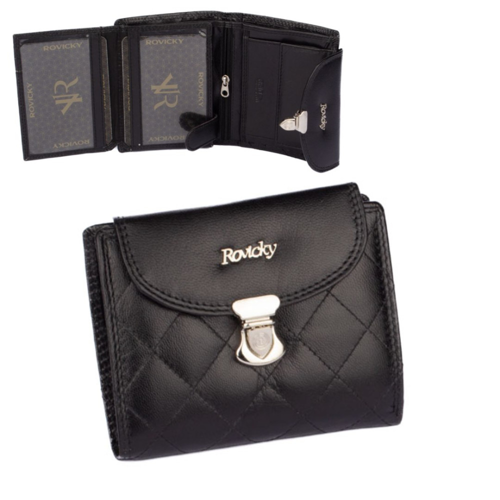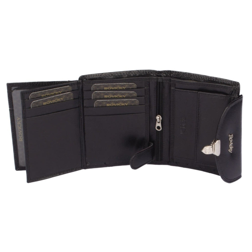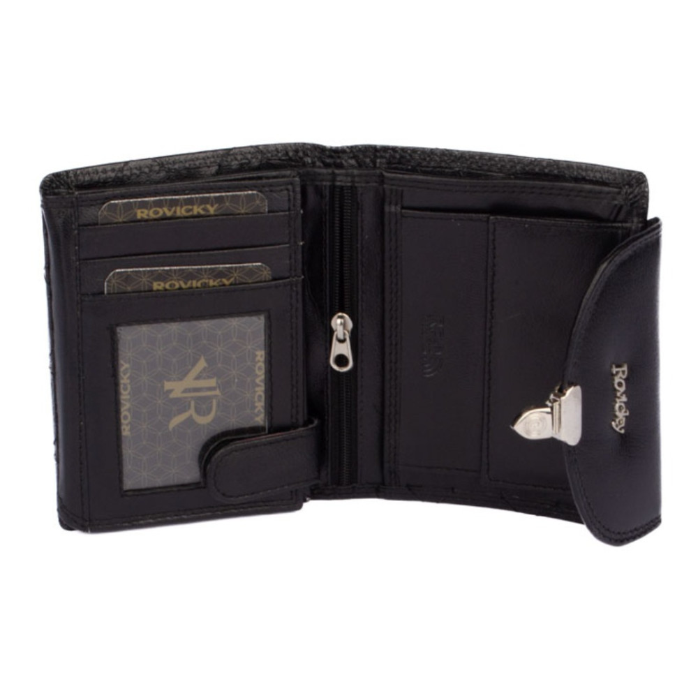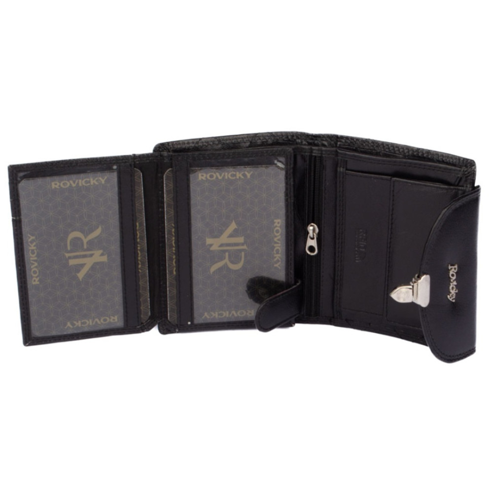 Kožená malá peněženka dámská černá se zapínáním na přední straně. Po otevření dámské peněženky je přístupný mincovník, uzavíratelný klopou s pevným drukem. V druhé části peněženky, která je zajištěna přezkou s drukem, jsou přístupné kapsy na karty, jedna z nich je průhledná. Samozřejmostí jsou dvě kapsy na bankovky. Uvnitř peněženky jsou tajné kapsy, jedna je se uzavírá na zip. Peněženka dámská černá se zapínáním je vyrobena z pravé kůže černé barvy a je z kolekce oblíbené značky Rovicky. Peněženku dostanete v dárkové krabičce.