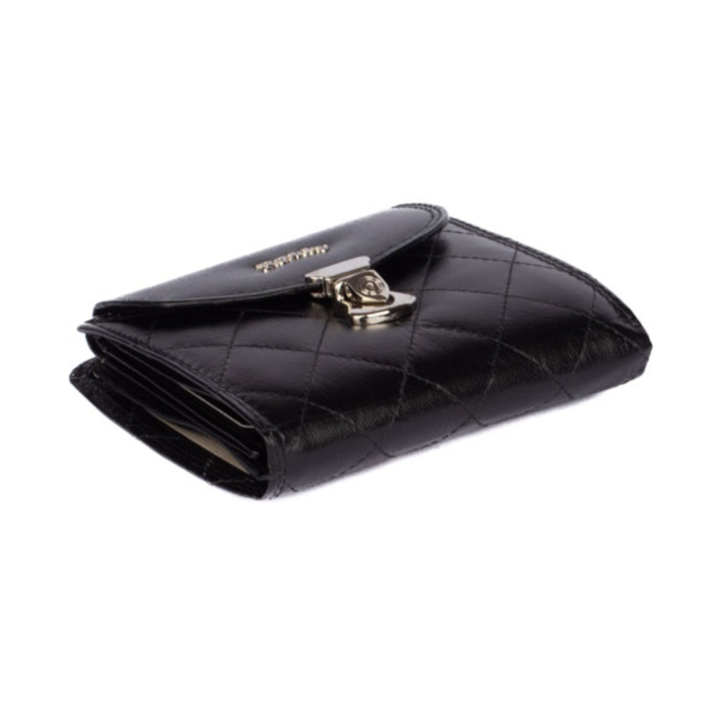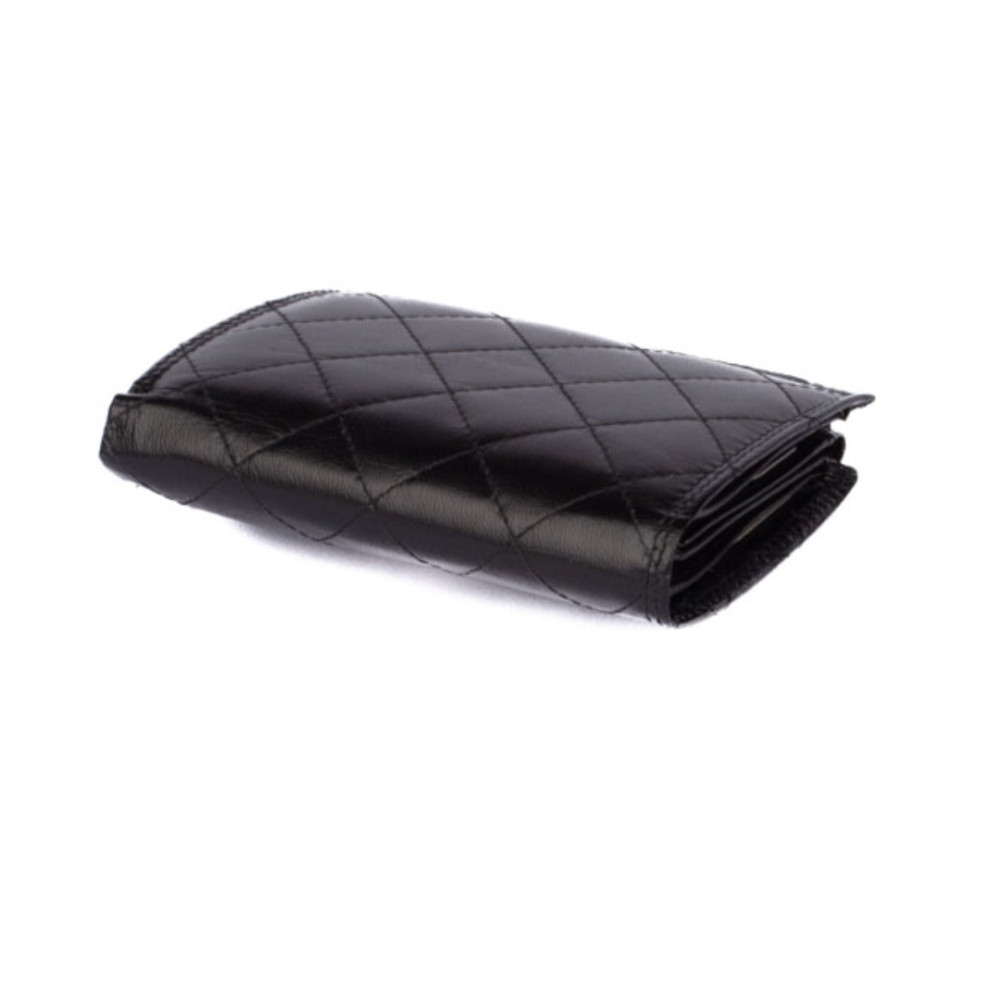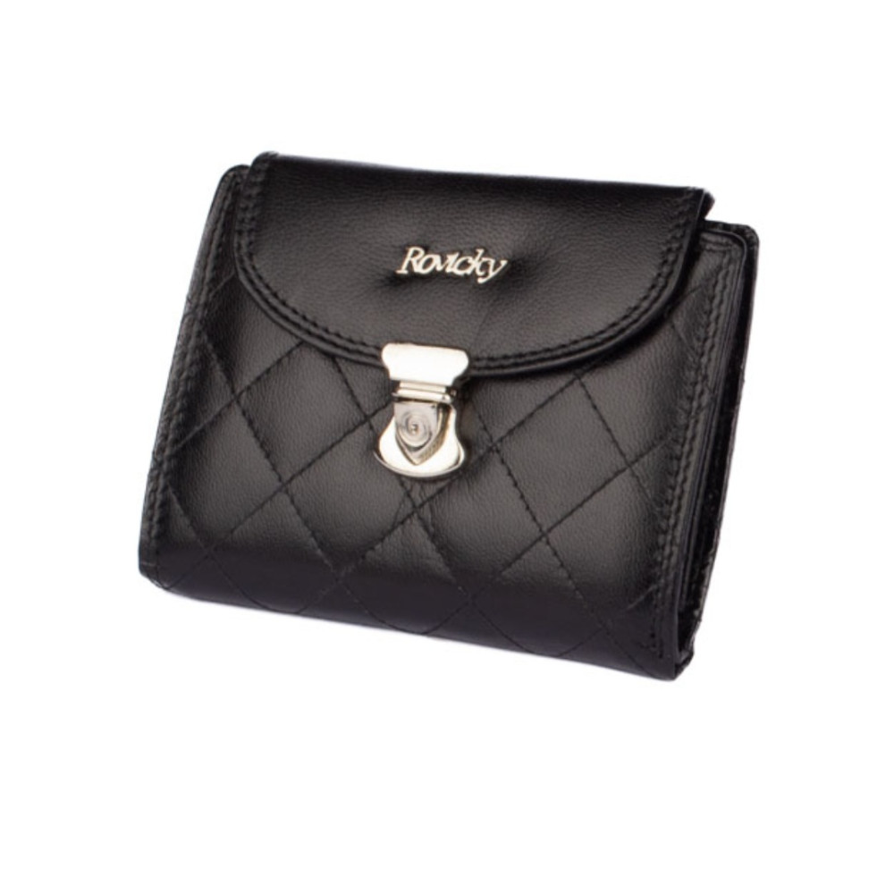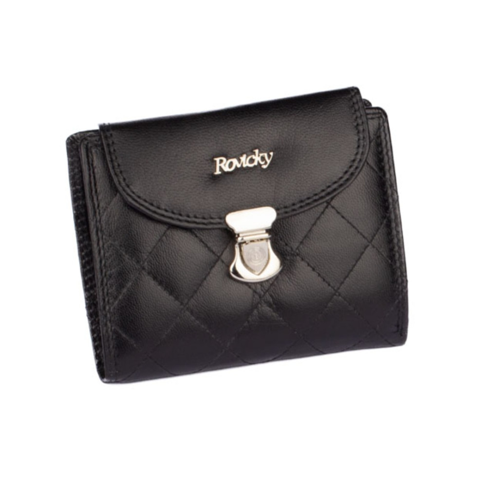 Kožená malá peněženka dámská černá se zapínáním na přední straně. Po otevření dámské peněženky je přístupný mincovník, uzavíratelný klopou s pevným drukem. V druhé části peněženky, která je zajištěna přezkou s drukem, jsou přístupné kapsy na karty, jedna z nich je průhledná. Samozřejmostí jsou dvě kapsy na bankovky. Uvnitř peněženky jsou tajné kapsy, jedna je se uzavírá na zip. Peněženka dámská černá se zapínáním je vyrobena z pravé kůže černé barvy a je z kolekce oblíbené značky Rovicky. Peněženku dostanete v dárkové krabičce.