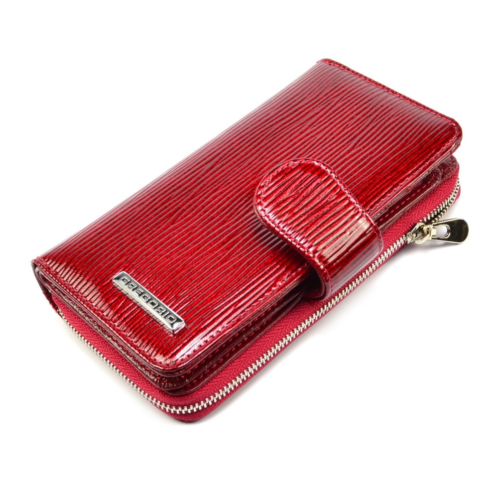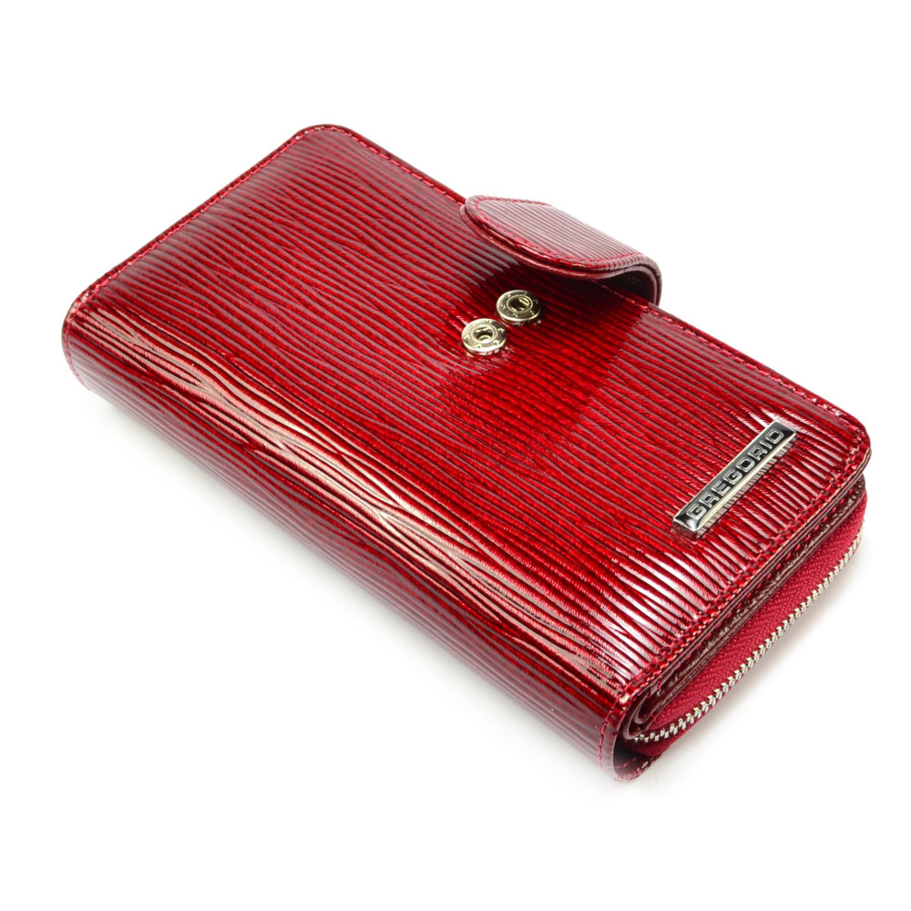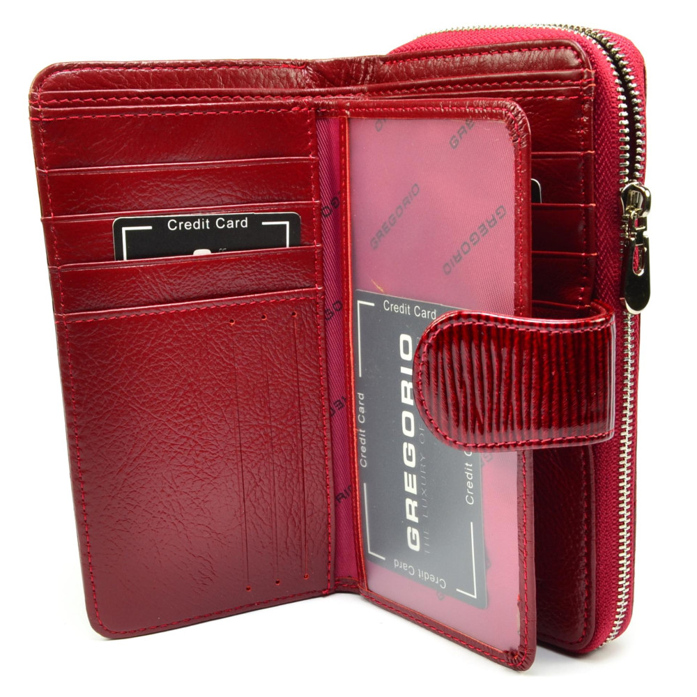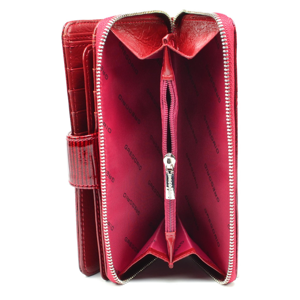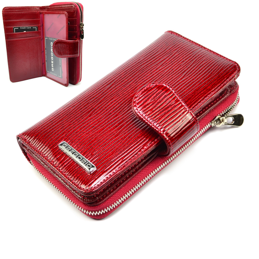 Peněženka dámská červená se zapínáním je rozdělena na dvě části. V první části červené peněženky jsou kapsy na platební a jiné karty, bankovky a doklady. Druhá část dámské peněženky se uzavírá skutečně pevným zipem s velkým jezdcem. Zde jsou dvě velké kapsy a jedna další na zip. Tuto část lze využít jako mincovník. Peněženka dámská červená se zapínáním je vyrobena z pravé kůže tmavě červené barvy a je značky Gregorio. Peněženky červené barvy jsou stálicí v módním světe. Pořiďte si také jednu.