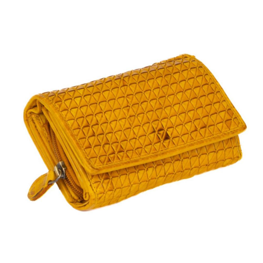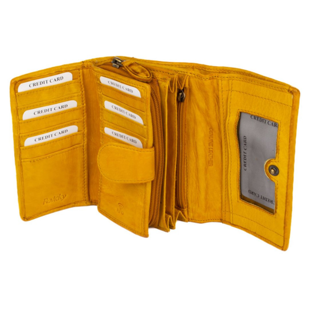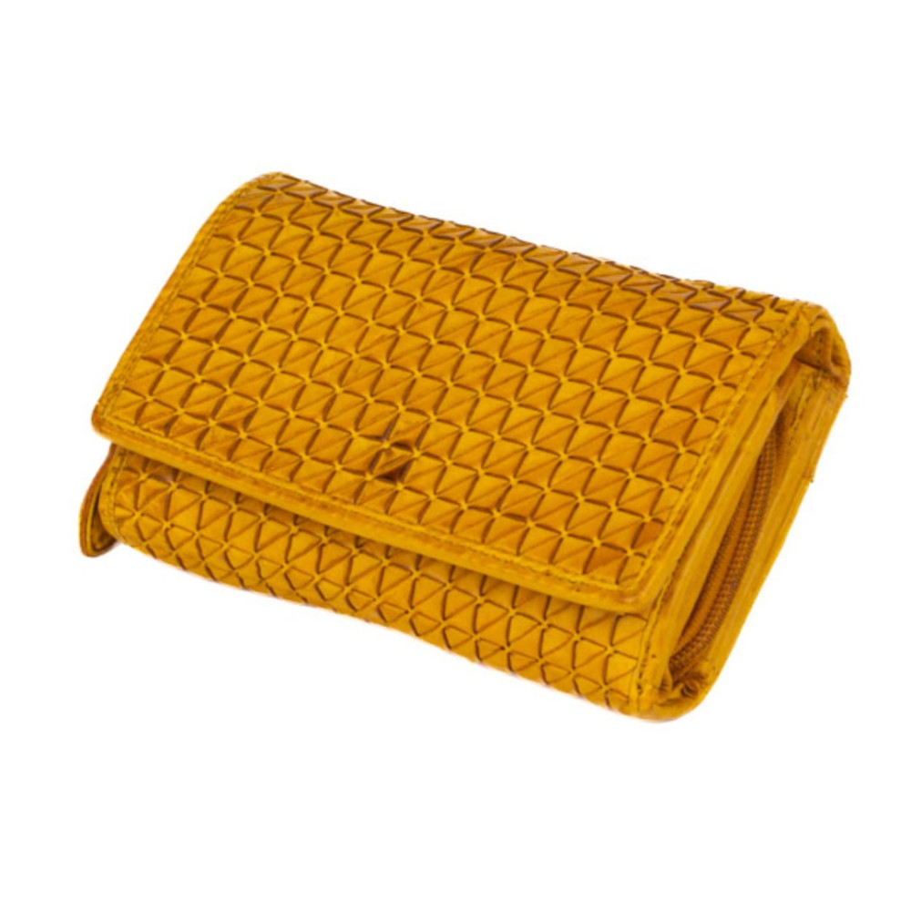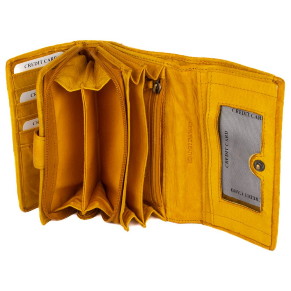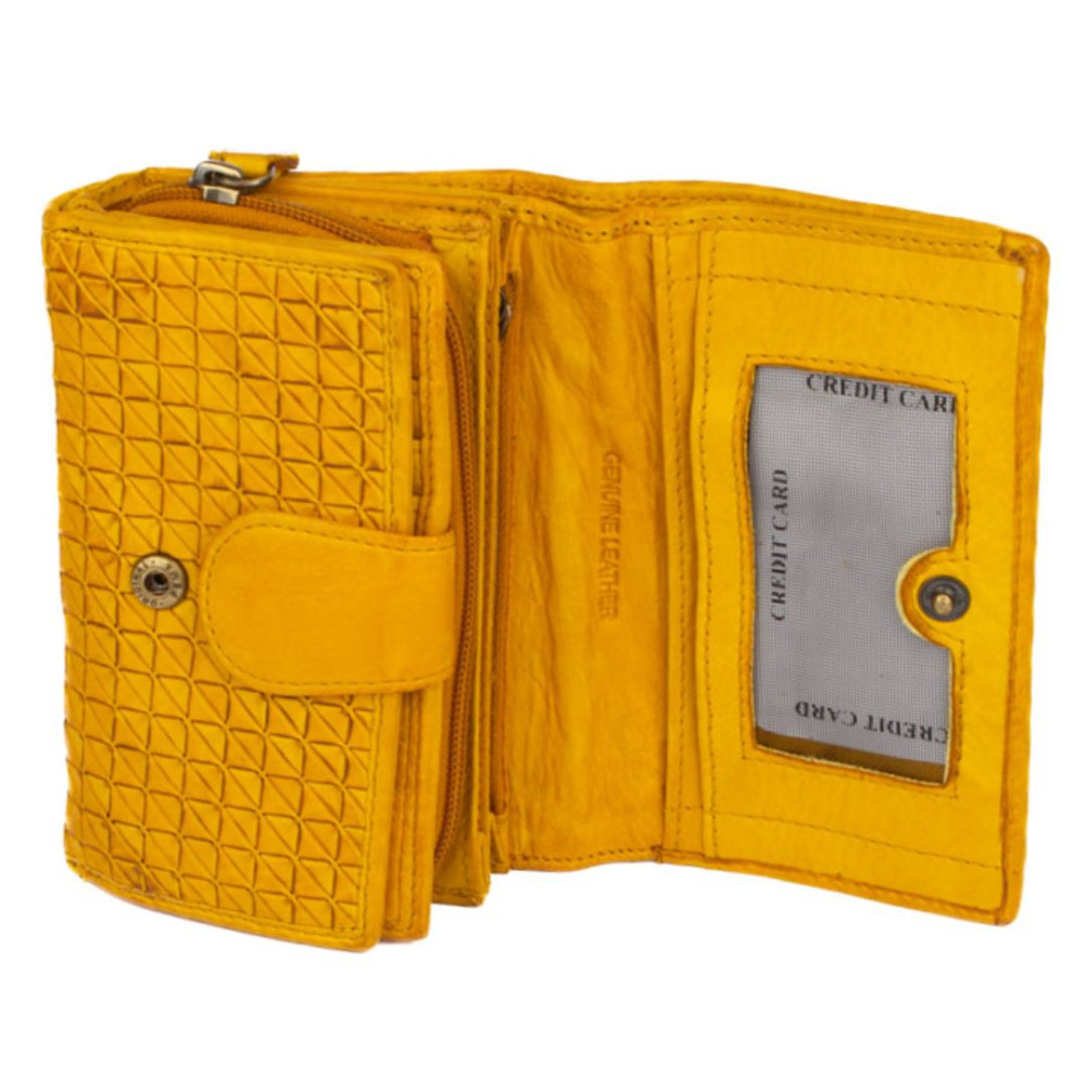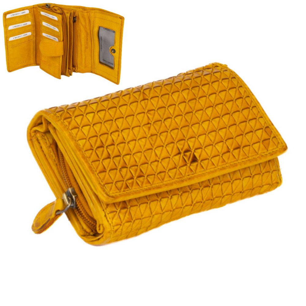Peněženka dámská kožená v nádherné hořčičně žluté barvě. Peněženka dámská kožená je rozdělena na dvě části a zavírá se klopou s pevným drukem. Po otevření klopy jsou ihned přístupné tenké kapsy, dvě menší kapsy uvnitř peněženky a velká kapsa na bankovky v klopě i peněžence. V prostřední části peněženky je mincovník, který se uzavírá zipem s velkým jezdcem pro pohodlné otevírání. Pod vnitřní přezkou s pevným drukem jsou všechny kapsy na karty ukryty tak, aby byly v bezpečí. Peněženka je vyrobena z pravé kůže a vypadá jako by byla šitá z malých čtverečků. Peněženka je žluté hořčičné barvy a je zabalena v dárkové krabičce.