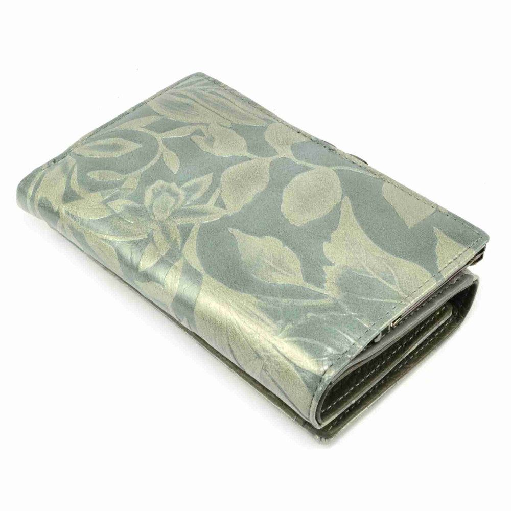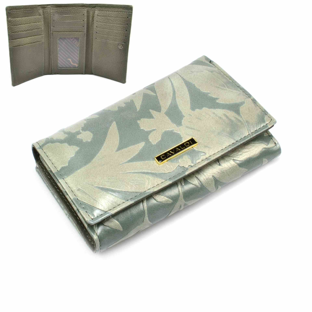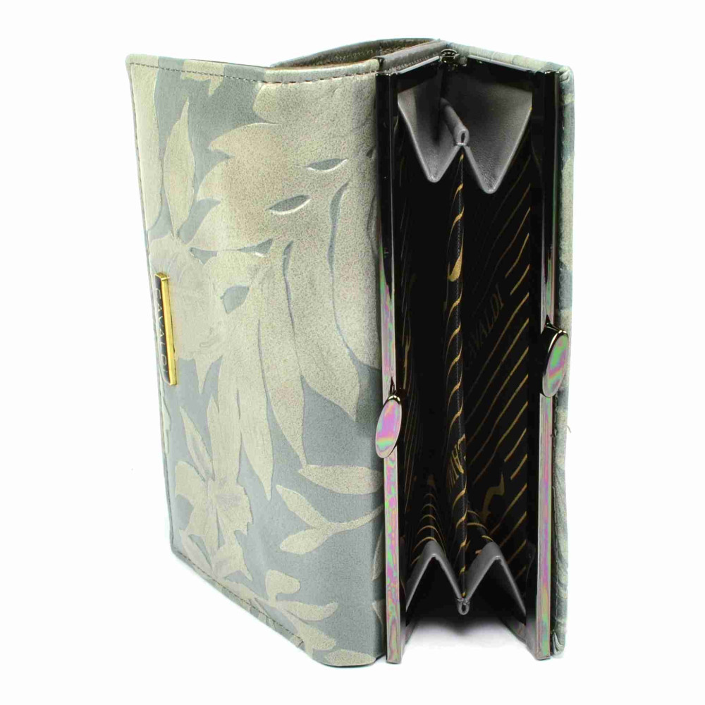 Moderní peněženka dámská moderní z pravé a umělé kůže (pravá kůže je uvnitř) šedé barvy, na povrchu foliované. Tato dámská peněženka se uzavírá klopou s pevným drukem. Pod klopou jsou hned přístupné všechny kapsy na platební karty, jedna kapsa je průhledná. Po otevření celé dámské peněženky můžete bankovky a jiné papírky skládat do kapes. Další tenká vnitřní kapsa se uzavírá zipem. Mincovník peněženky je rámový, přístupná zvenku a se dvěma kapsami na zip. Peněženka dámská moderní je vyrobena z umělé a parvé kůže a je značky 4U Cavaldi. Každá peněženka má trošku jiný motiv (různé počty květin, listí - viz. obrázek).