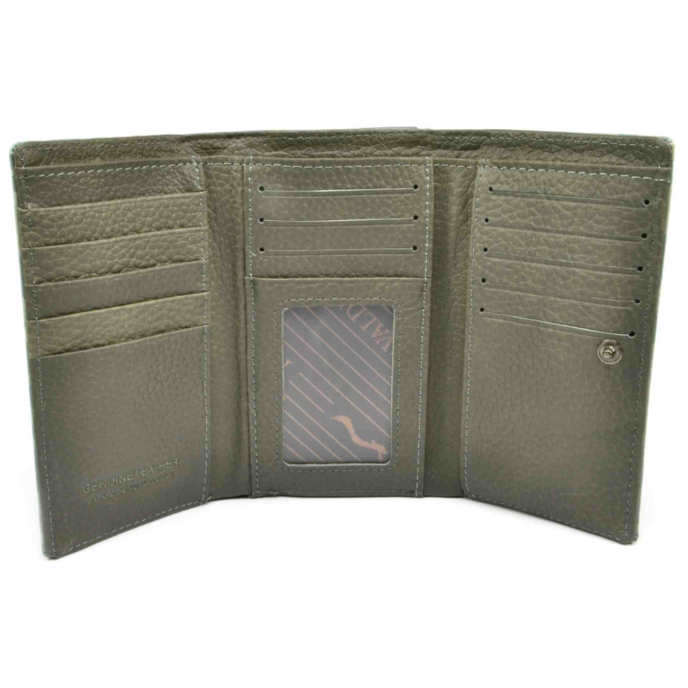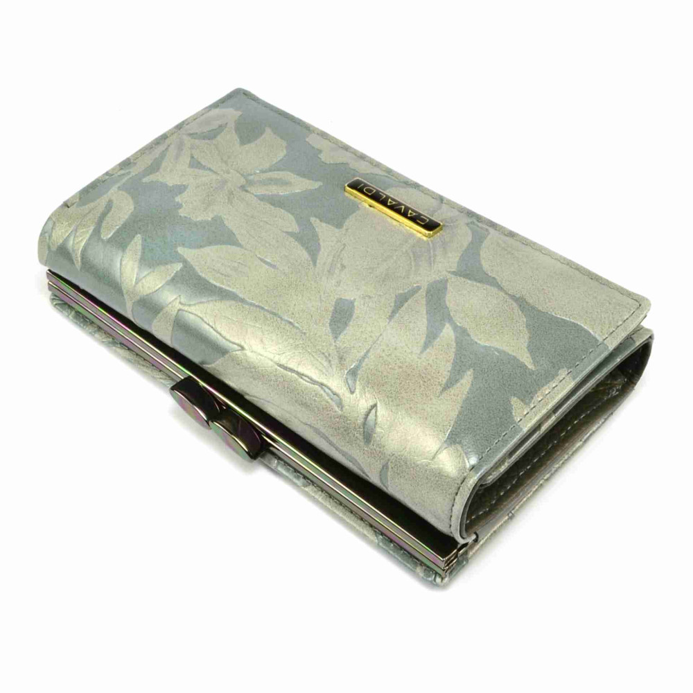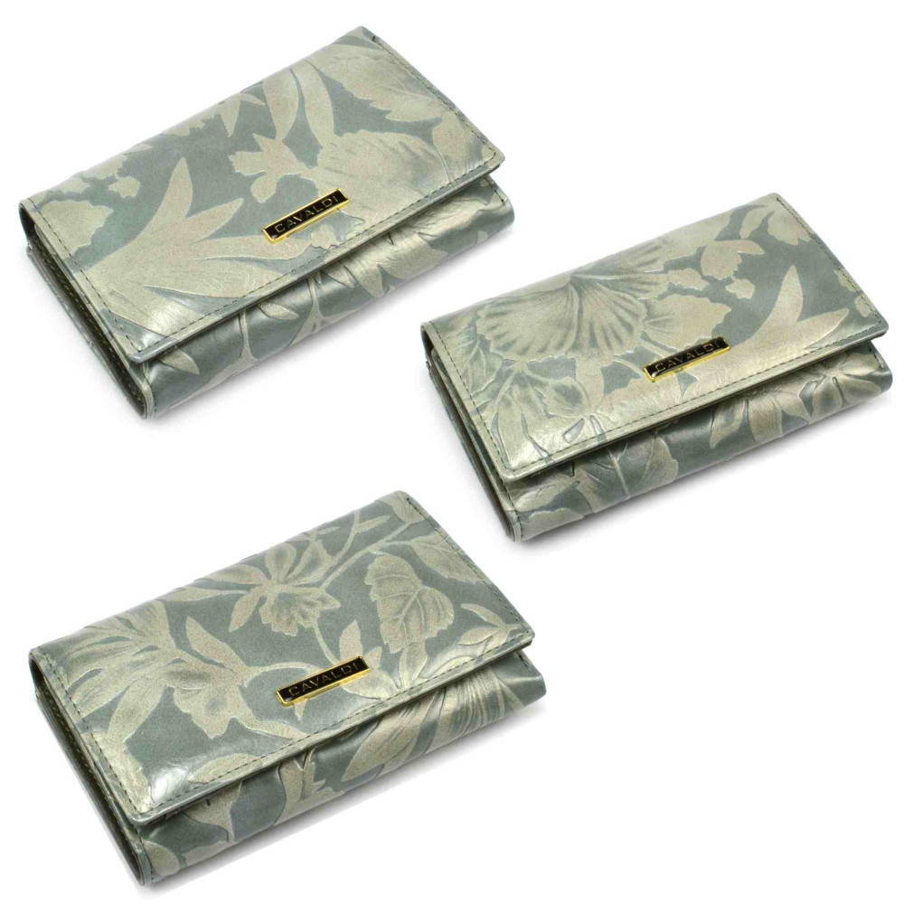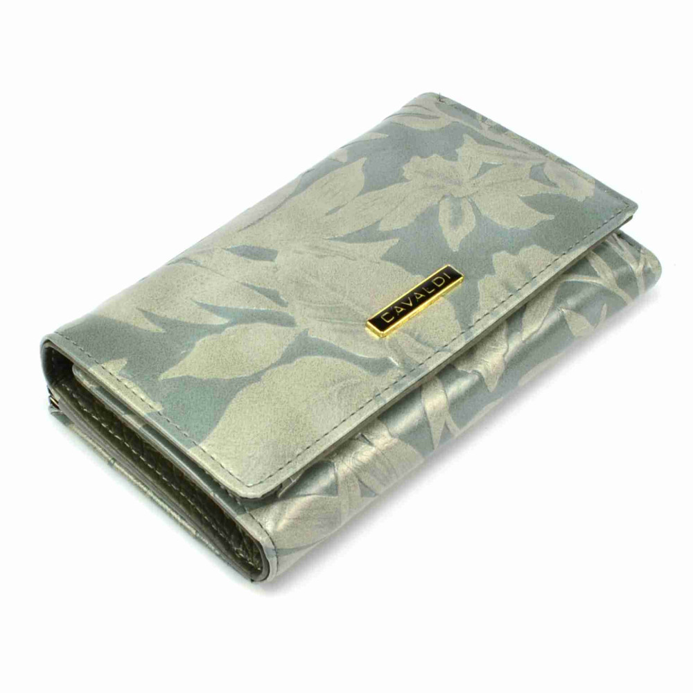 Moderní peněženka dámská moderní z pravé a umělé kůže (pravá kůže je uvnitř) šedé barvy, na povrchu foliované. Tato dámská peněženka se uzavírá klopou s pevným drukem. Pod klopou jsou hned přístupné všechny kapsy na platební karty, jedna kapsa je průhledná. Po otevření celé dámské peněženky můžete bankovky a jiné papírky skládat do kapes. Další tenká vnitřní kapsa se uzavírá zipem. Mincovník peněženky je rámový, přístupná zvenku a se dvěma kapsami na zip. Peněženka dámská moderní je vyrobena z umělé a parvé kůže a je značky 4U Cavaldi. Každá peněženka má trošku jiný motiv (různé počty květin, listí - viz. obrázek).