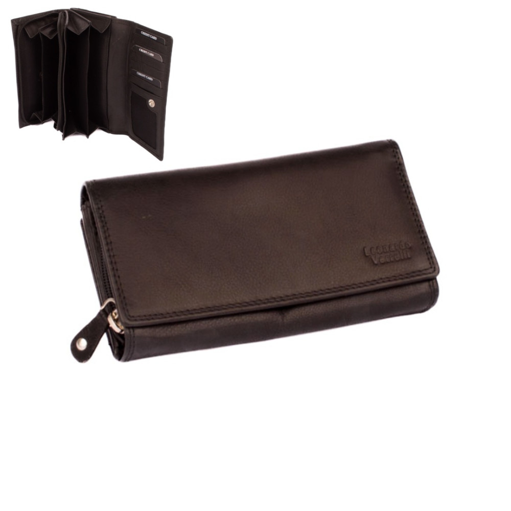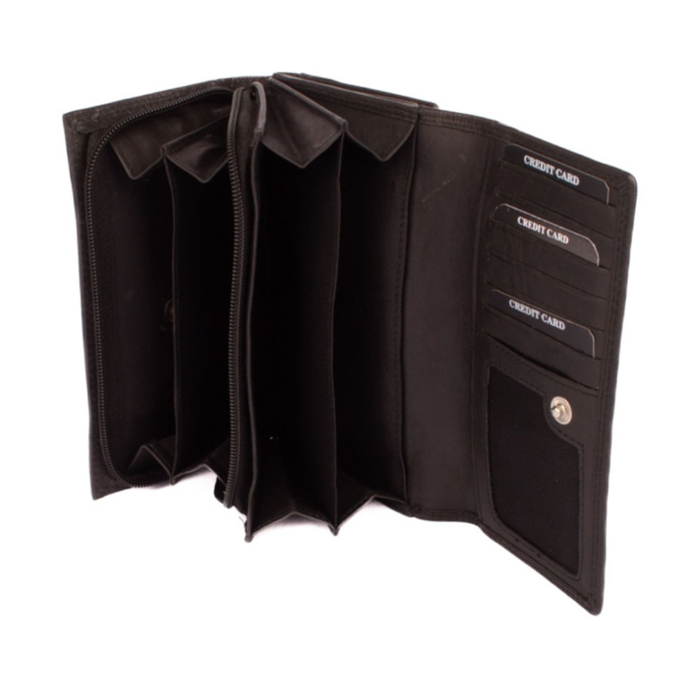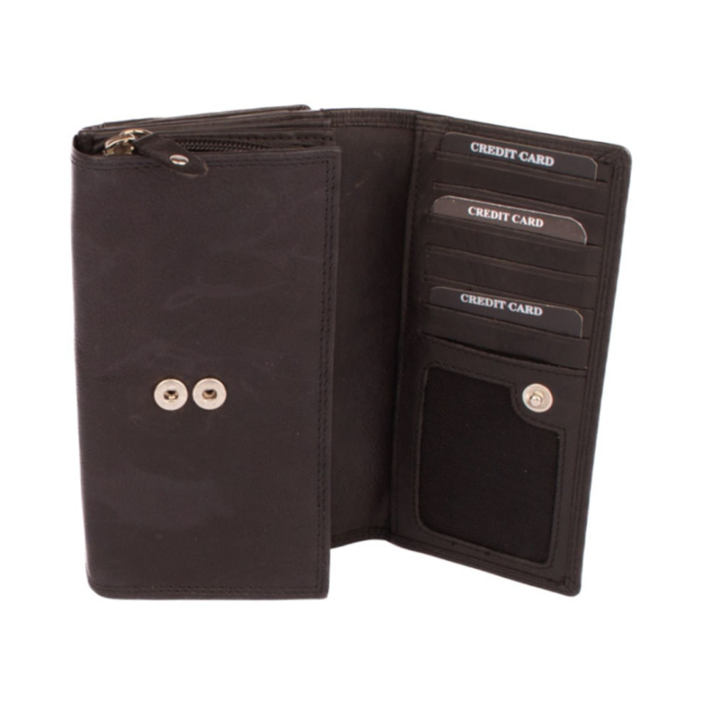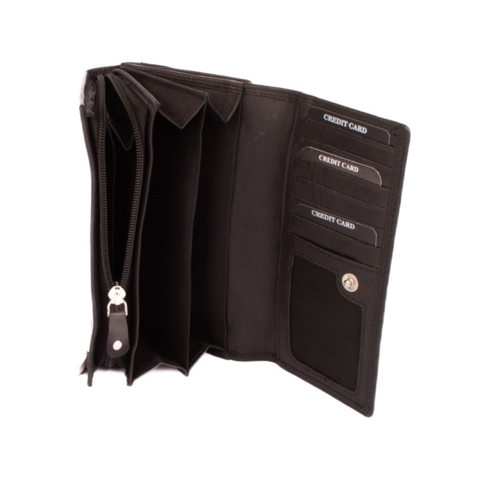 Peněženka velká dámská černá je rozdělená na dvě poloviny. Jedna polovina se uzavírá klopou s pevným drukem. Po jejím otevření je přístupných několik kapes na platební a jiné karty, jedna z nich je průhledná. Vedle jsou dvě kapsy na bankovky. Všechny české bankovky je nutné přeložit před vložením. Vedle je kapsa na zip přes celou peněženku s velkým jezdcem pro pohodlné otevírání. Uvnitř jsou dvě velké kapsy na mince. Uplatnění najdete určitě i pro pár tenkých kapes, třeba na nějaké tajné papírky. Druhá polovina peněženky se uzavírá přezkou s pevným drukem. Po jejím otevření se přístupné další kapsy na karty, jedna je průhledná. Peněženka je vyrobená z pravé kůže s ornamenty jemných zrn, má černou barvu a je dodávána bez dárkové krabičky. Peněženka velká dámská černá je také vybavena RFID ochranou proti nechtěnému čtení karet.