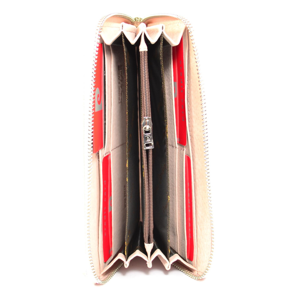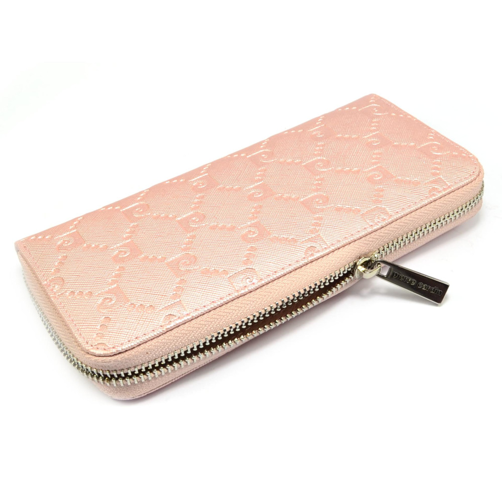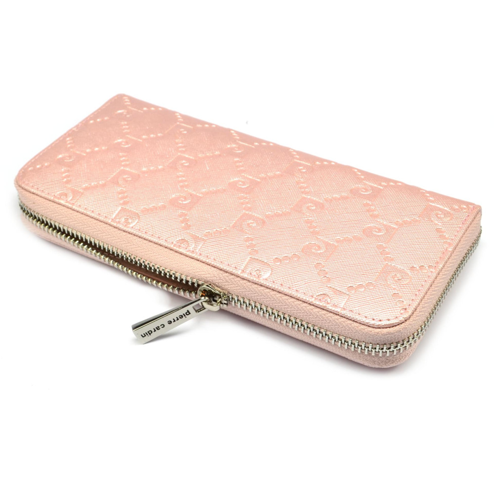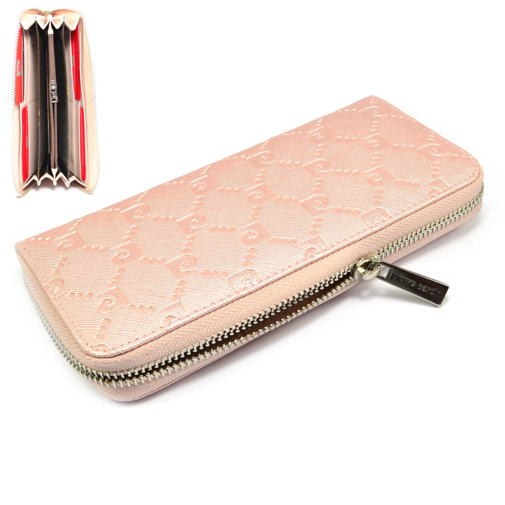 Kožená růžová peněženka dámská s ornamenty má praktické zavíráním masivním zipem s velkým jezdcem pro pohodlné otevírání. Tato růžová dámská peněženka má dostatek kapes na bankovky a ostatní papírky, platební a jiné karty. Samozřejmostí dámské peněženky je mincovník, který se uzavírá dalším zipem. Růžová peněženka dámská je vyrobená z pravé kůže světle růžové barvy. Peněženka je z kolekce Pierre Cardin.