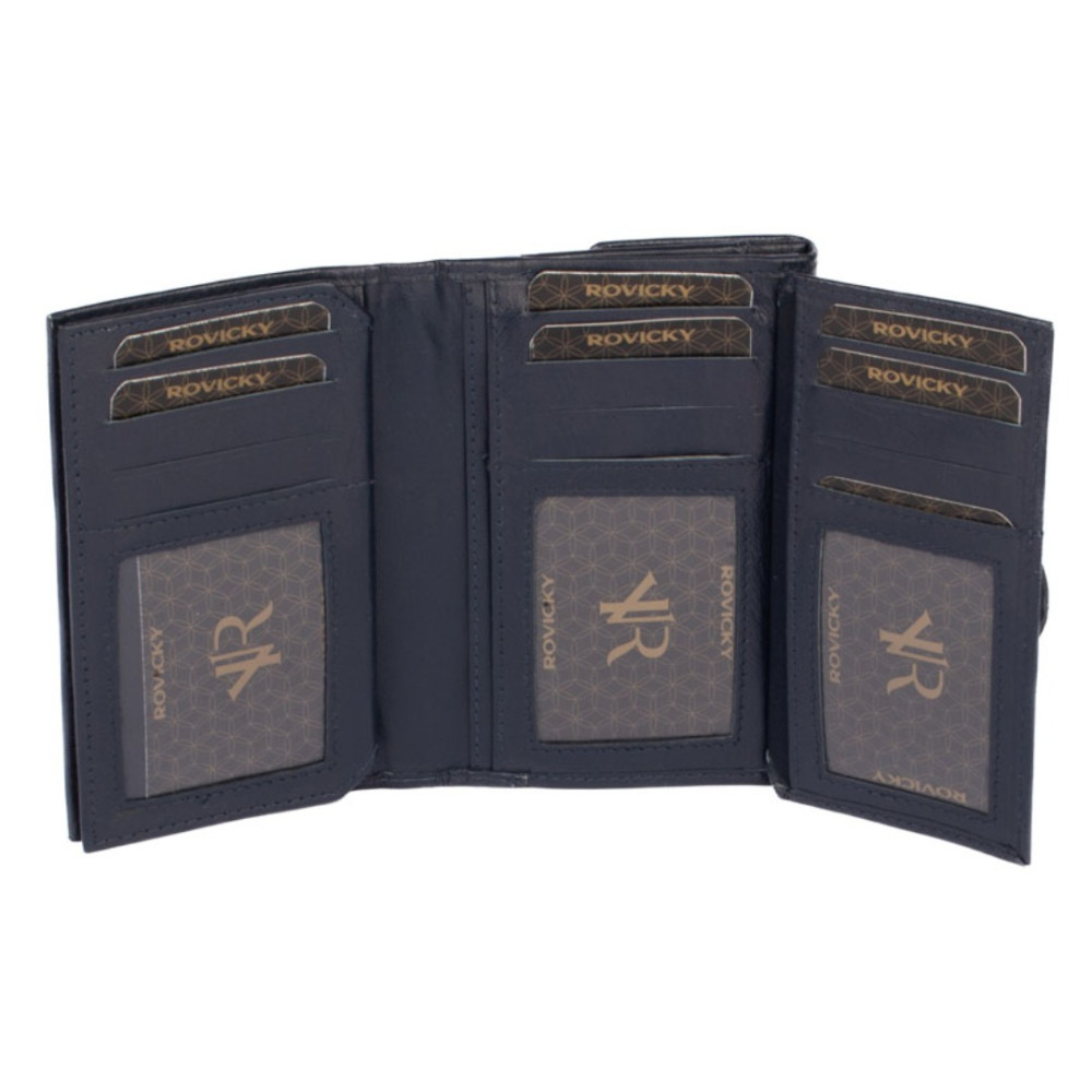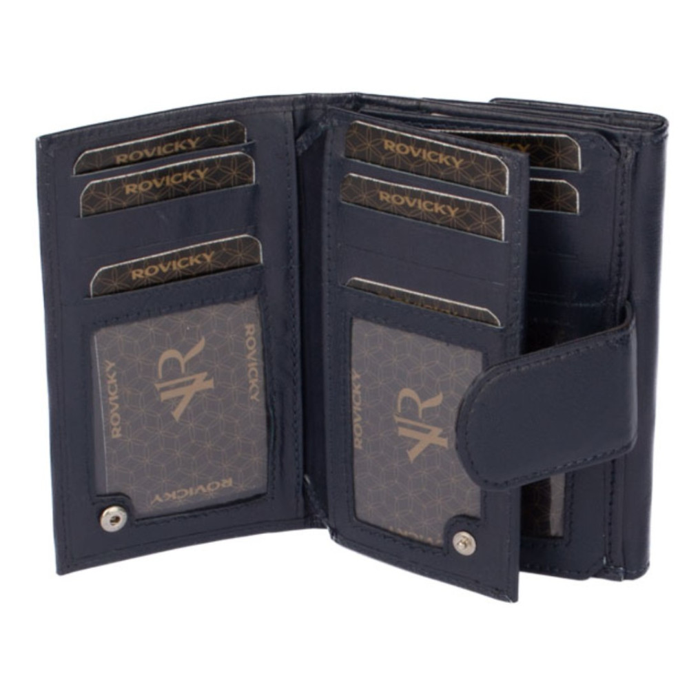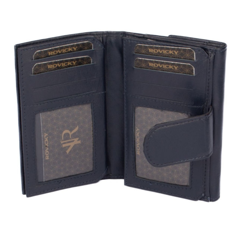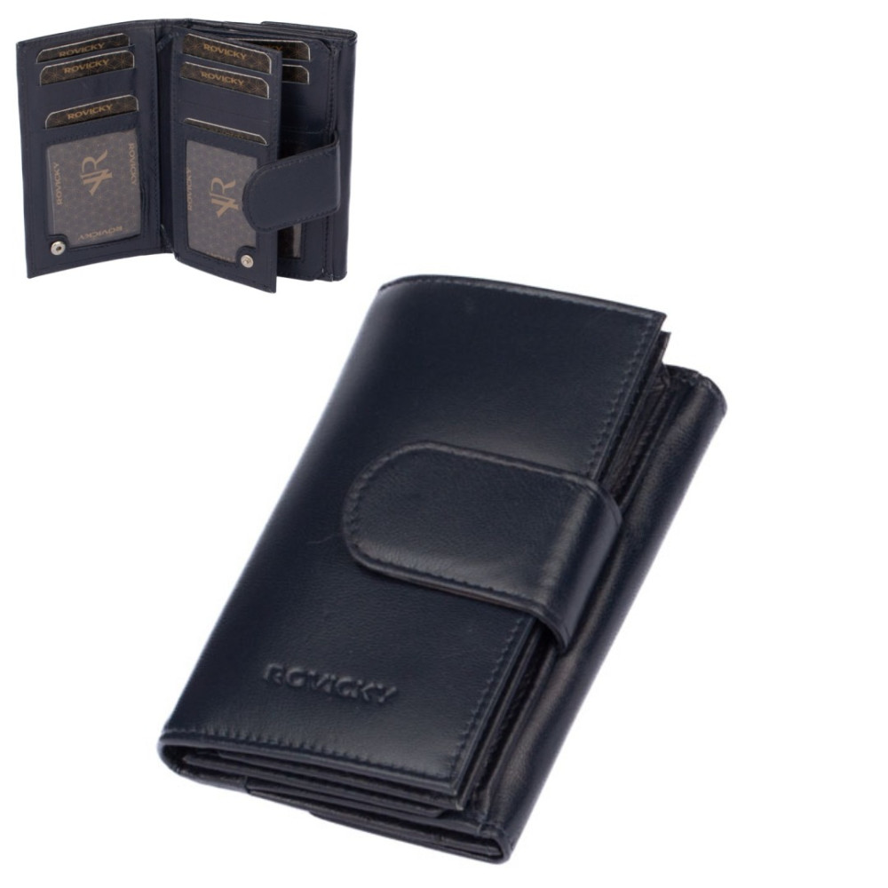 Stylová dámská peněženka modrá z pravé kůže je rozdělena na dvě poloviny. První polovina dámské peněženky se uzavírá přezkou s pevným drukem. Druk lze zapnout do dvou poloh, podle zaplnění peněženky. Po otevření této části jsou přístupné všechny kapsy na karty a doklady v několika dalších klopách. Několik kapes na karty je průhledných. V klopách za kapsami jsou další tenké kapsy. Stylová dámská peněženka modrá má v druhé polovině peněženky jednu velkou kapsu rozdělenou na několik menších. Tato část peněženky se uzavírá klopou s pevným drukem. Netradičně je v klopě umístěn držák na žeton do košíku. V peněžence nejsou klasické velké kapsy na bankovky, ale pár bankovek pohodlně uložíte do tenkých kapes v peněžence nebo do kapes pod klopou. Tato stylová dámská peněženka modrá je vyrobena z pravé kůže temně modré barvy a je značky Rovicky. Peněženka je dodávána v dárkové krabičce s logem výrobce.