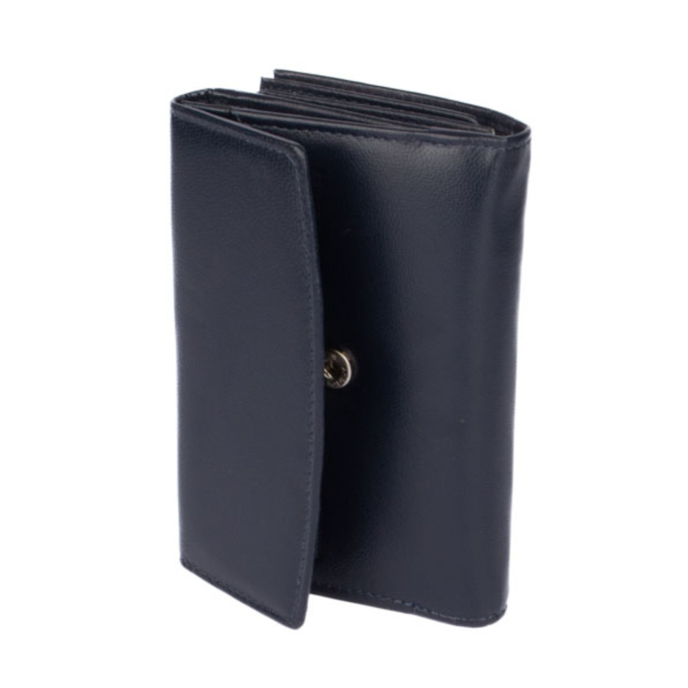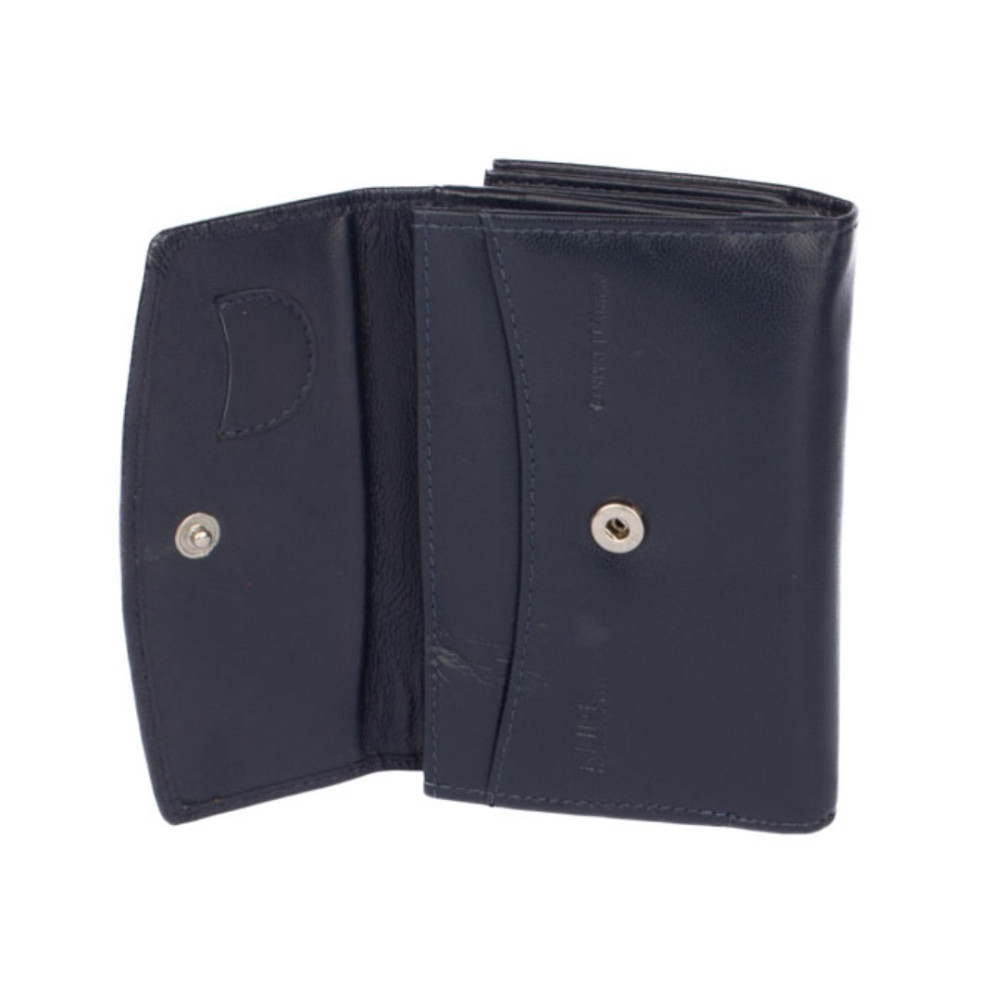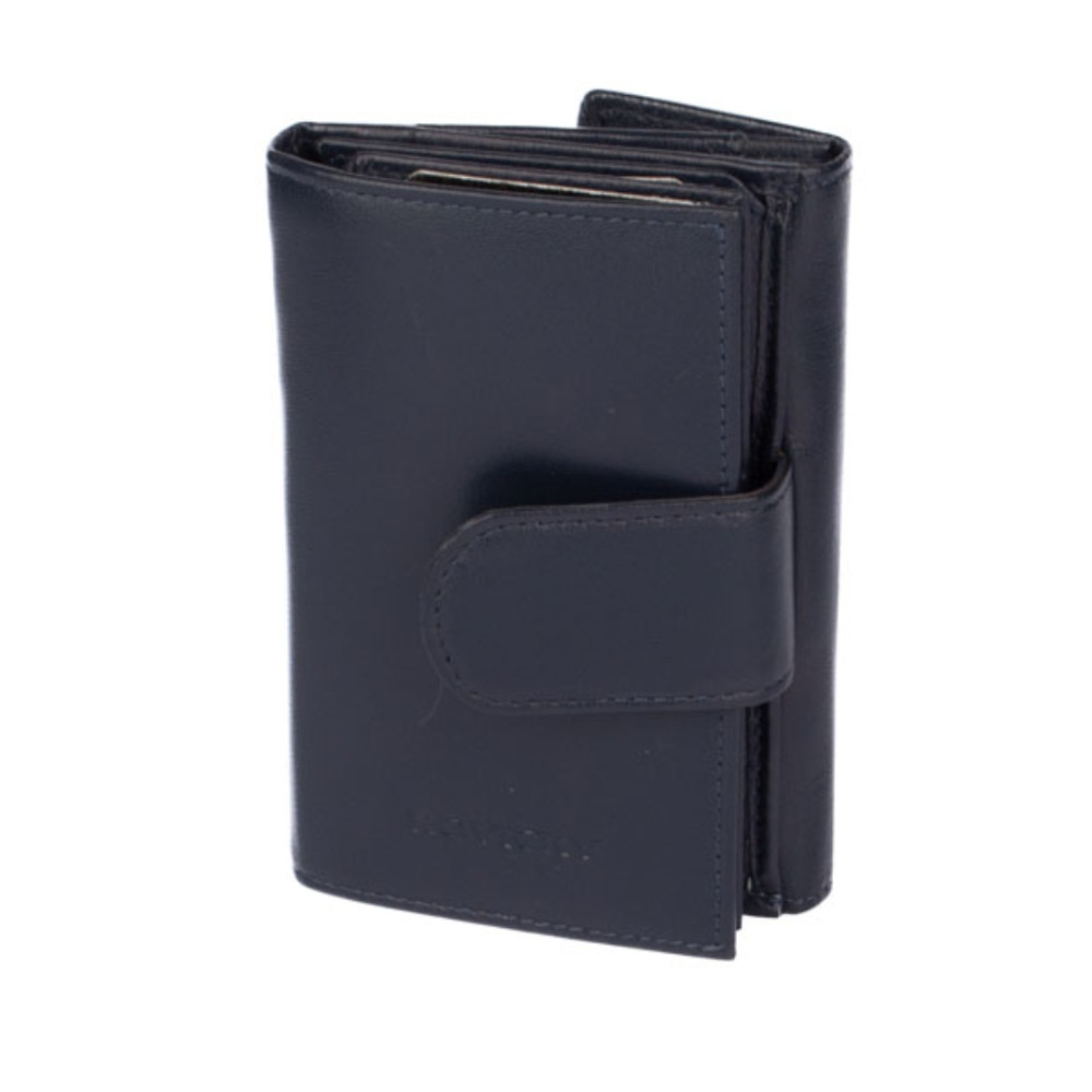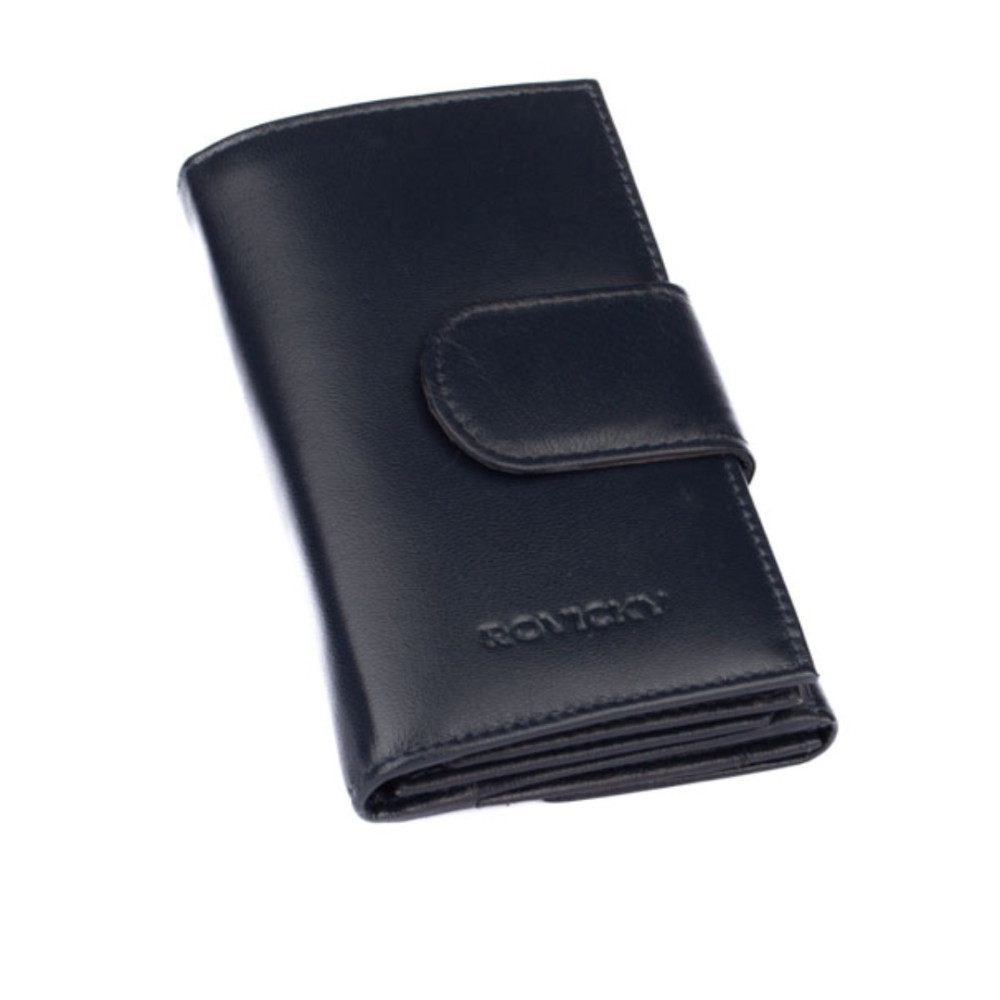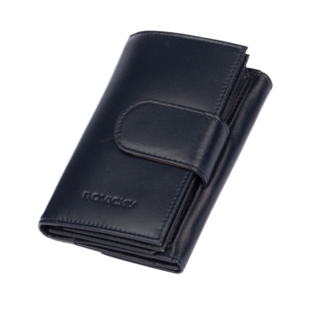 Stylová dámská peněženka modrá z pravé kůže je rozdělena na dvě poloviny. První polovina dámské peněženky se uzavírá přezkou s pevným drukem. Druk lze zapnout do dvou poloh, podle zaplnění peněženky. Po otevření této části jsou přístupné všechny kapsy na karty a doklady v několika dalších klopách. Několik kapes na karty je průhledných. V klopách za kapsami jsou další tenké kapsy. Stylová dámská peněženka modrá má v druhé polovině peněženky jednu velkou kapsu rozdělenou na několik menších. Tato část peněženky se uzavírá klopou s pevným drukem. Netradičně je v klopě umístěn držák na žeton do košíku. V peněžence nejsou klasické velké kapsy na bankovky, ale pár bankovek pohodlně uložíte do tenkých kapes v peněžence nebo do kapes pod klopou. Tato stylová dámská peněženka modrá je vyrobena z pravé kůže temně modré barvy a je značky Rovicky. Peněženka je dodávána v dárkové krabičce s logem výrobce.