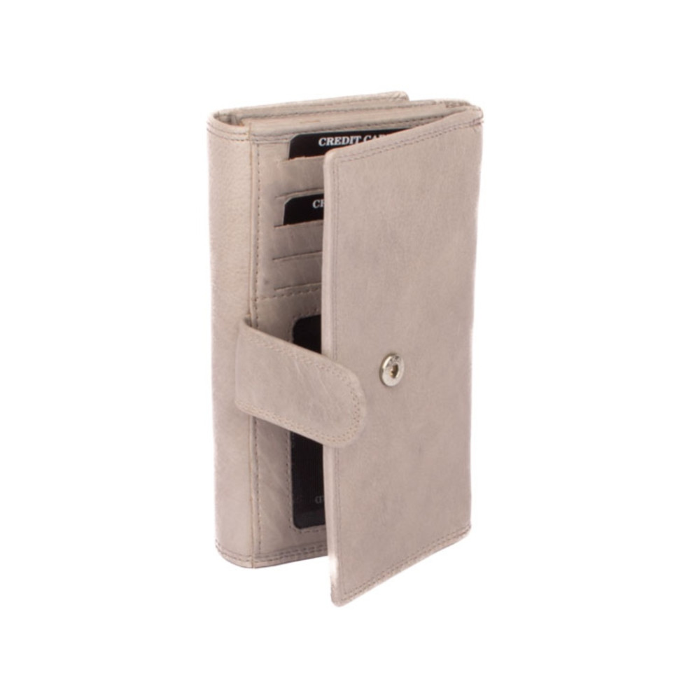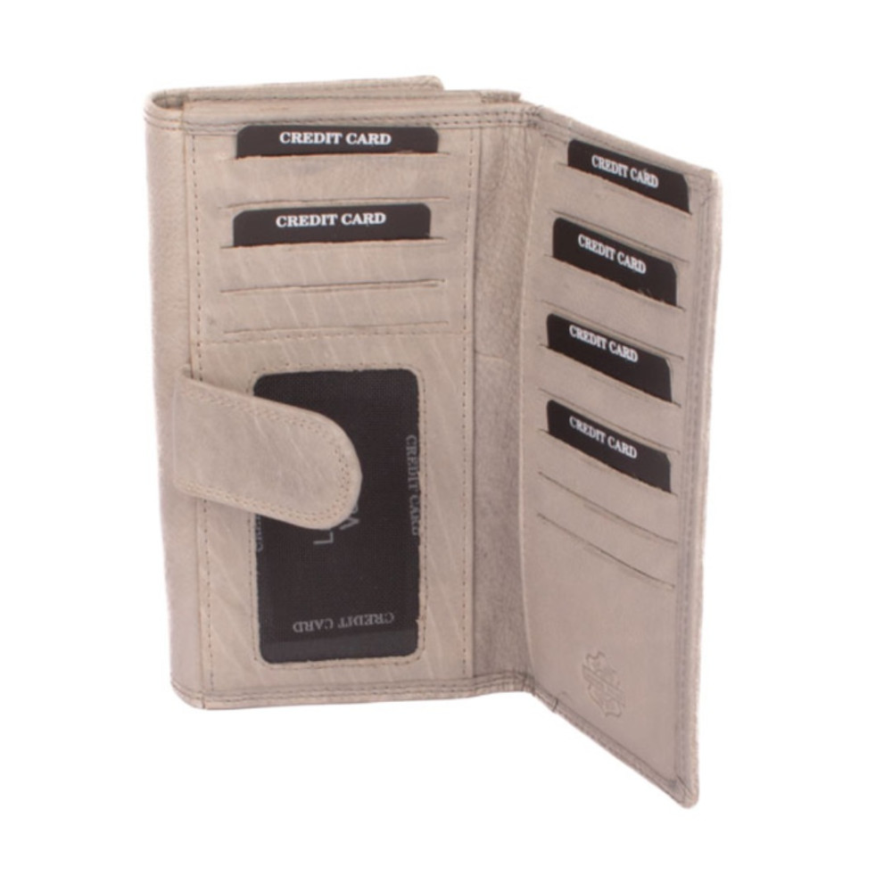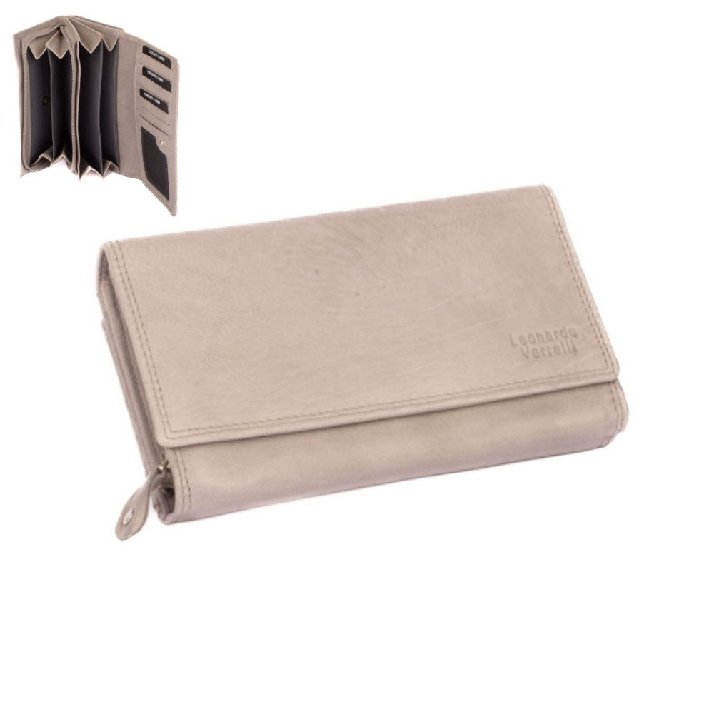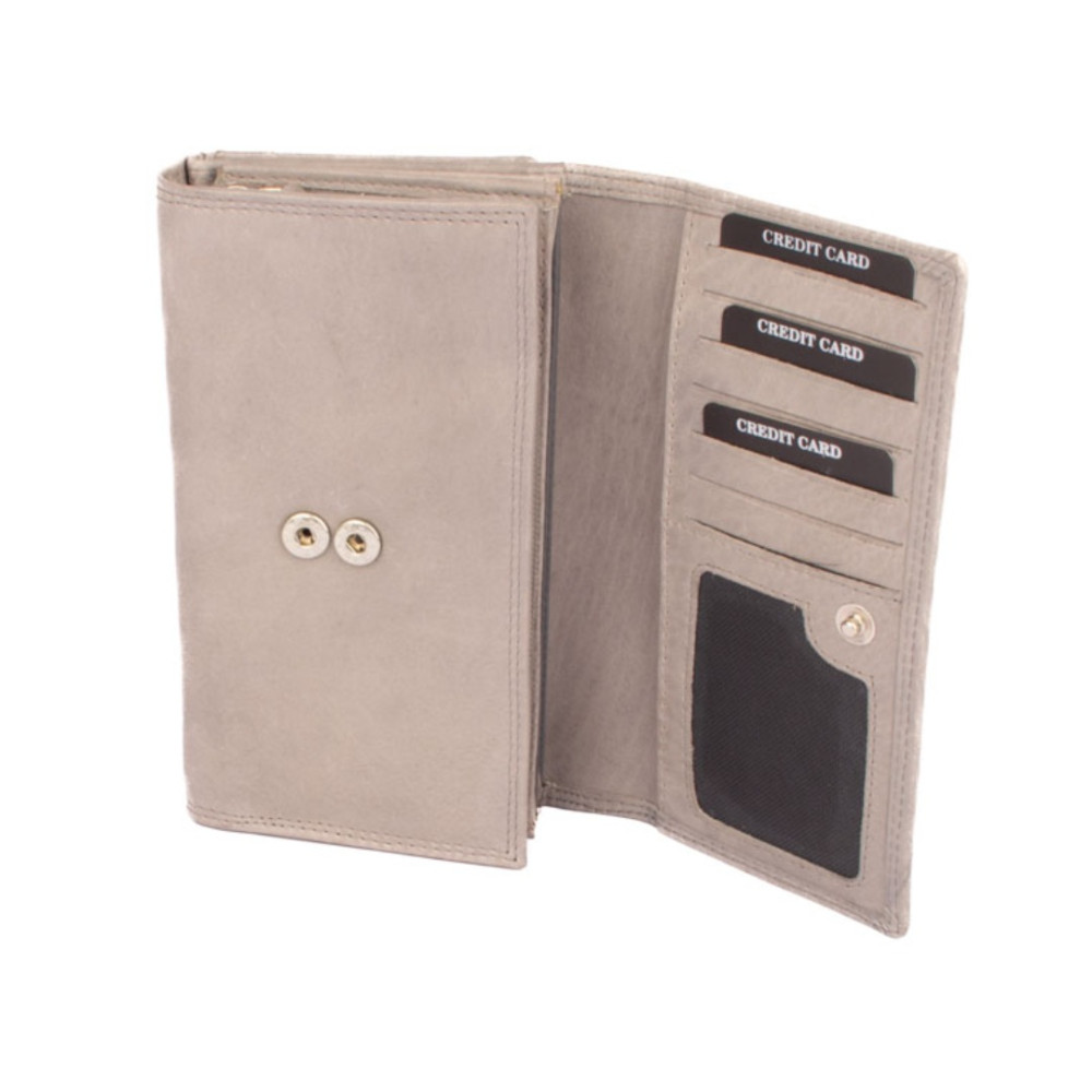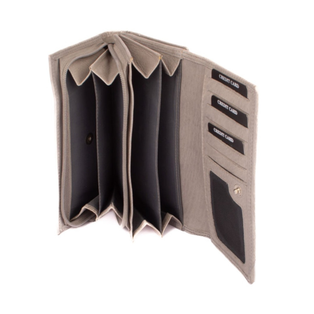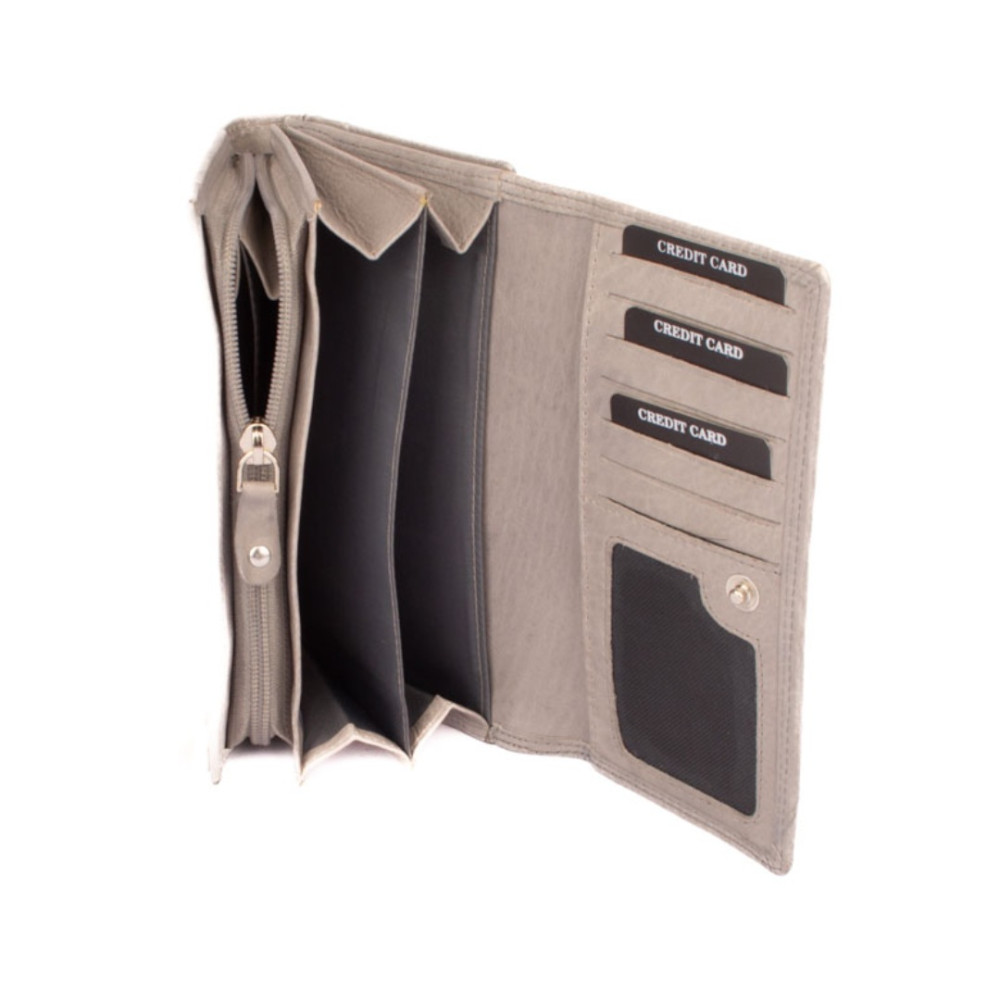 Šedá peněženka dámská je rozdělená na dvě poloviny. Jedna polovina se uzavírá klopou s pevným drukem. Po jejím otevření je přístupných několik kapes na platební a jiné karty, jedna z nich je průhledná. Vedle jsou dvě kapsy na bankovky. Všechny české bankovky je nutné přeložit před vložením. Vedle je kapsa na zip přes celou peněženku s velkým jezdcem pro pohodlné otevírání. Uvnitř jsou dvě velké kapsy na mince. Uplatnění najdete určitě i pro pár tenkých kapes, třeba na nějaké tajné papírky. Druhá polovina peněženky se uzavírá přezkou s pevným drukem. Po jejím otevření se přístupné další kapsy na karty, jedna je průhledná. Peněženka je vyrobená z pravé kůže s ornamenty jemných zrn, má šedou barvu a je dodávána bez dárkové krabičky. Šedá peněženka dámská je také vybavena RFID ochranou proti nechtěnému čtení karet.