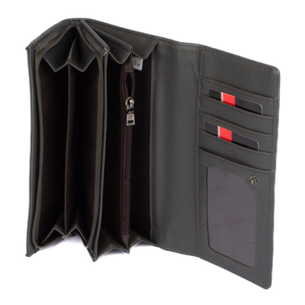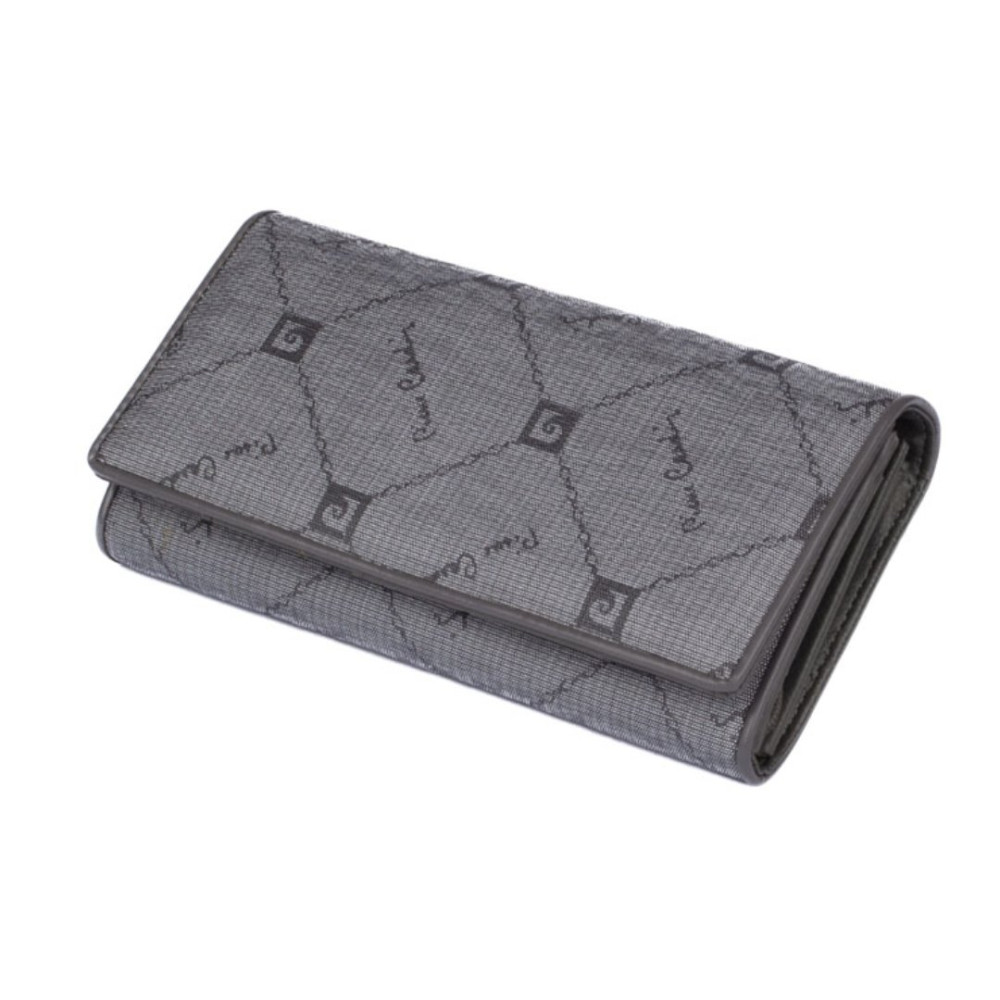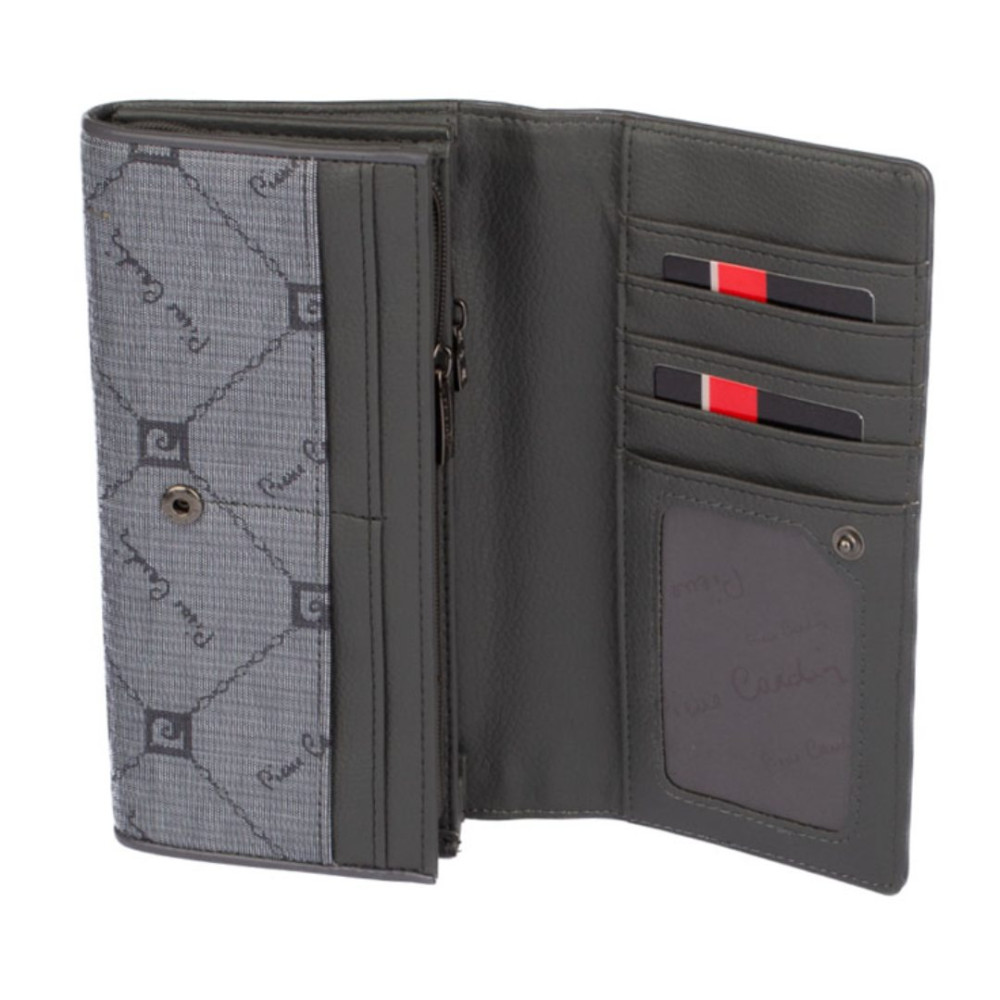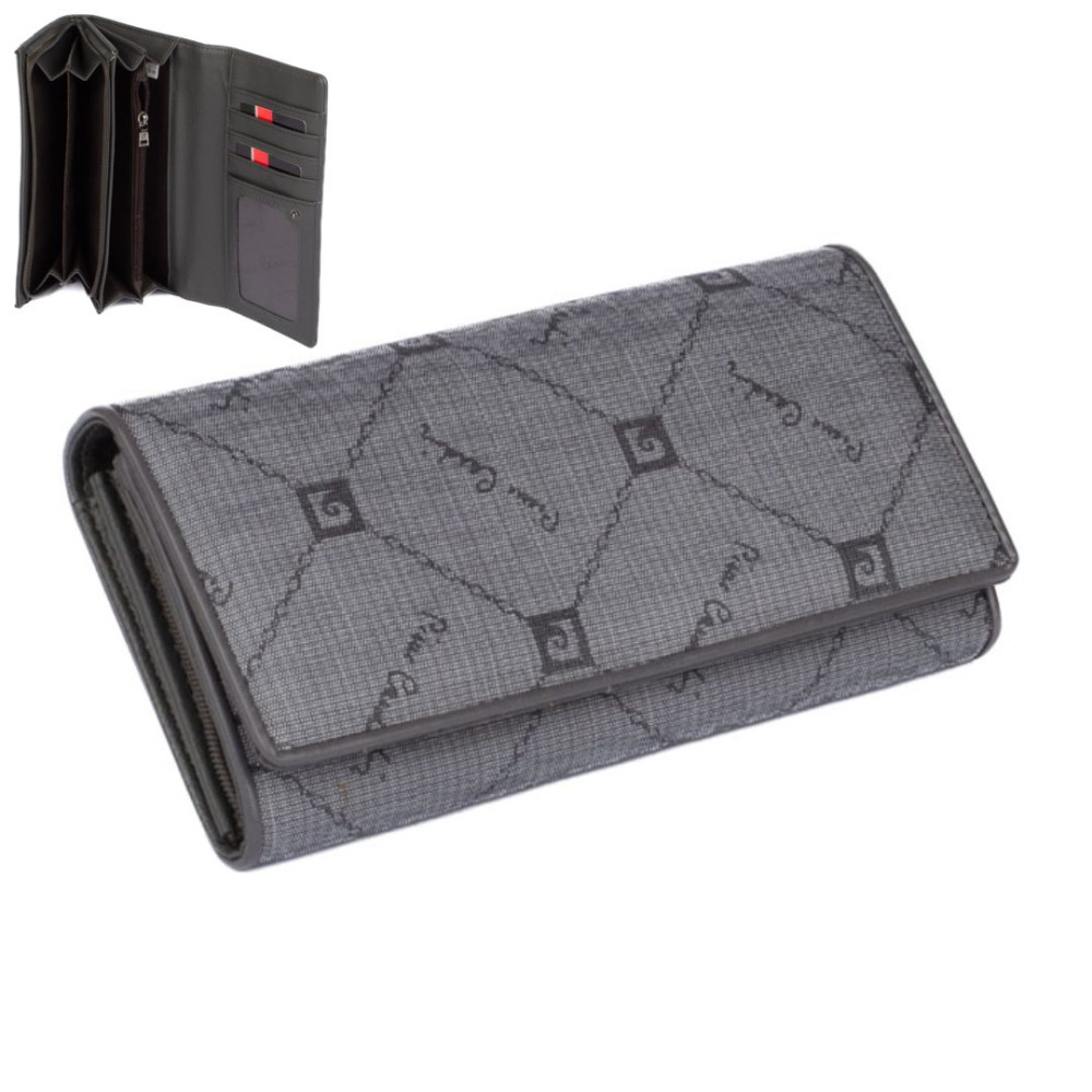 Trendy dámská peněženka z umělé kůže stříbrné barvy s ornamenty loga výrobce. Po otevření dámské peněženky jsou pohodlně přístupné všechny kapsy na bankovky a karty. Velký mincovník na zip je rozdělený na dvě kapsy. V peněžence je dostatek kapes na bankovky a další papírky. Trendy dámská peněženka je značky Pierre Cardin.