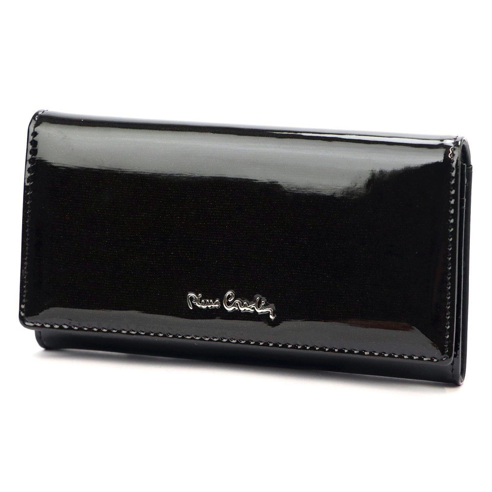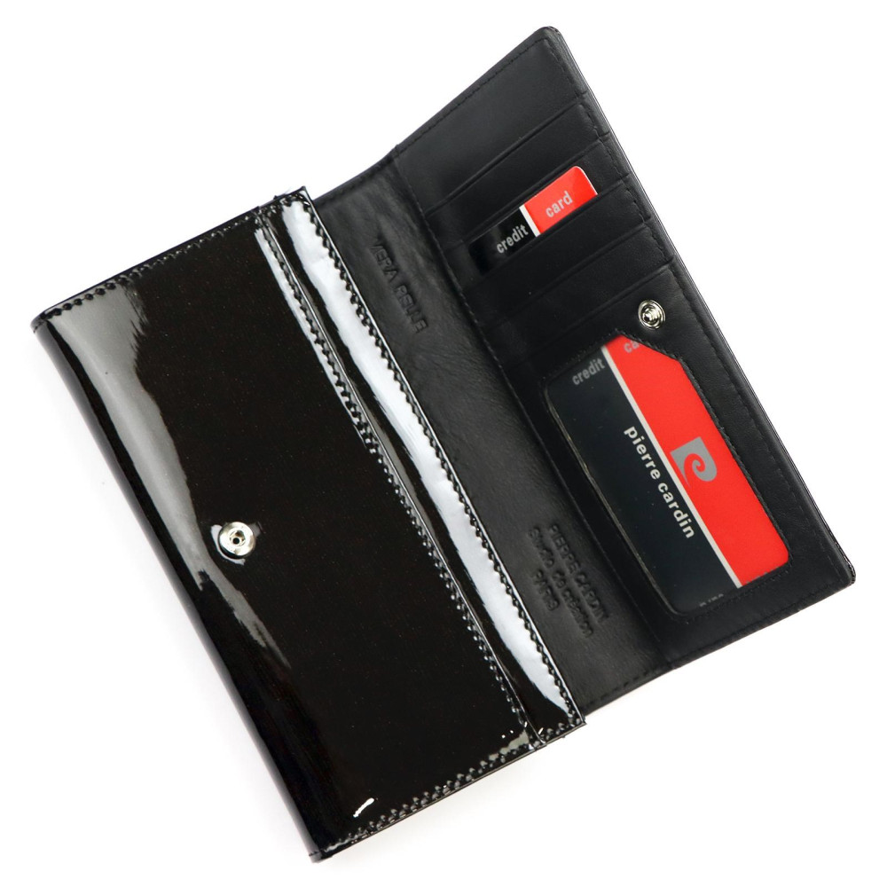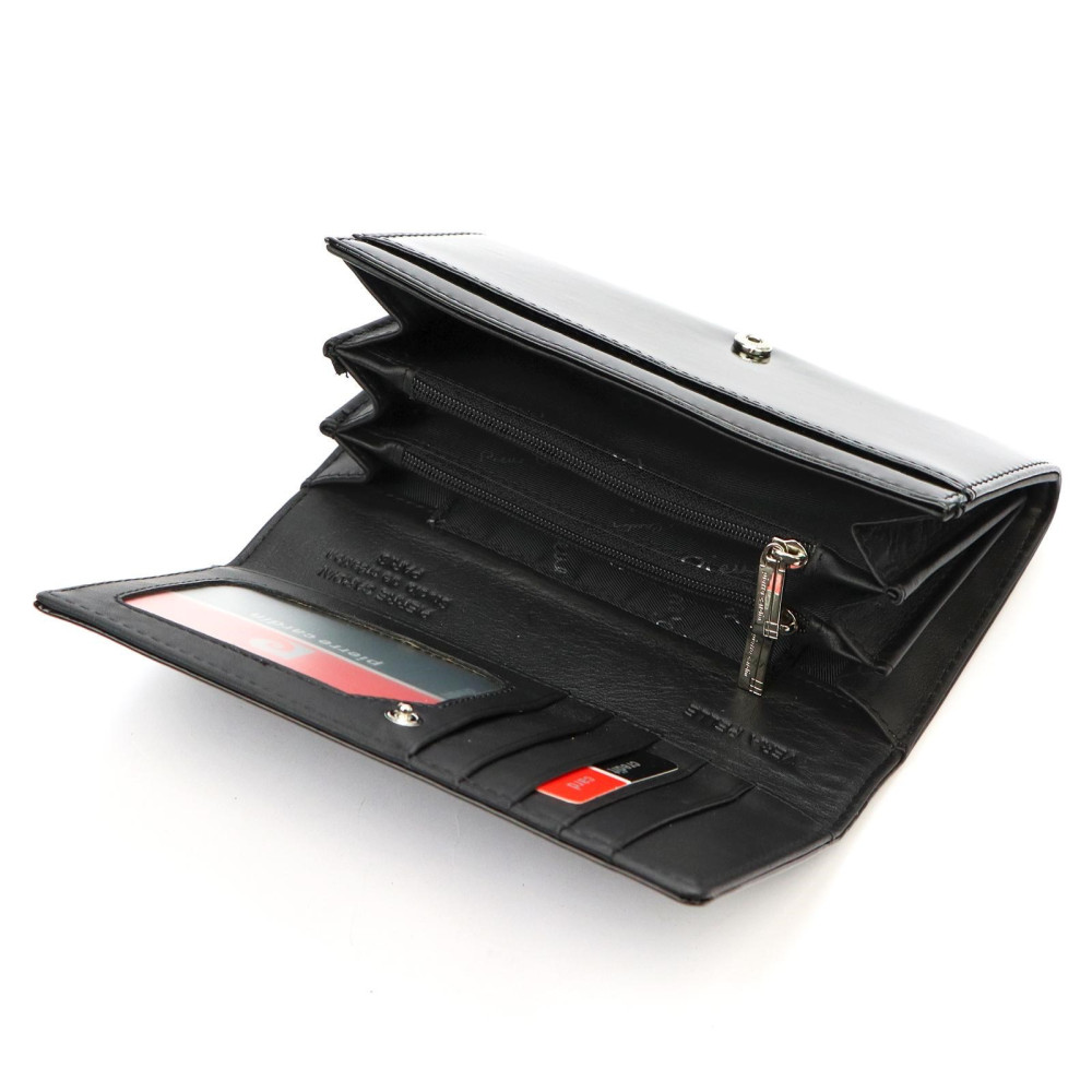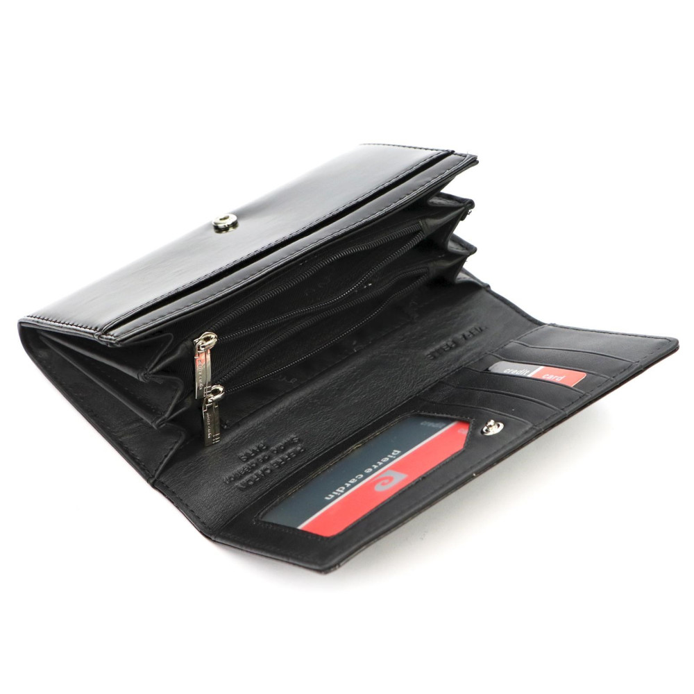 Velká kožená peněženka dámská luxusně zpracovaná s propracovanými detaily. Peněženka se uzavírá klopou s pevným drukem. Po otevření dámské peněženky se lehce dostanete ke všem kapsám na karty, bankovky a mincovníkům. Mincovníky má peněženka dva a zavírájí se zipem. Velká kožená peněženka dámská je z pravé kůže černé barvy, na povrchu je foliovaná pro lepší stálost barev. Peněženka je značky Pierre Cardin.