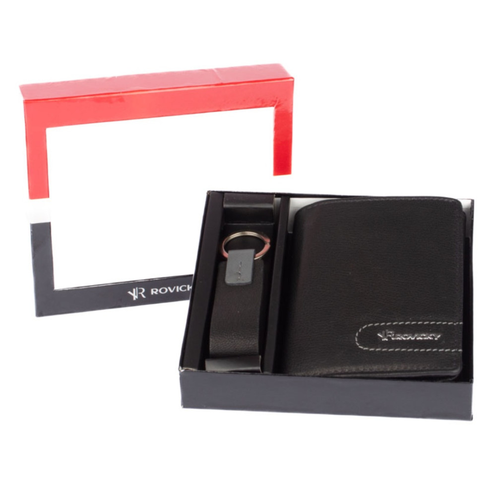 Dárková kazeta pro muže s peněženkou se skládá z kožené peněženky a kožené klíčenky. Sada je dodávána v dárkové kazetě. Pánská kožená peněženka má uvnitř klasické uspořádání. Najdete zde dostatek kapes na platební karty, průhledné kapsy na doklady i kapsy na bankovky. V peněžence je mincovník uzavíratelný klopou s pevným drukem.