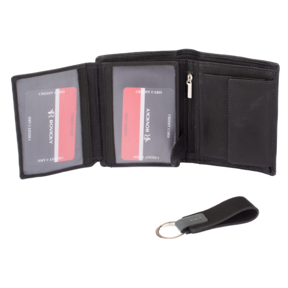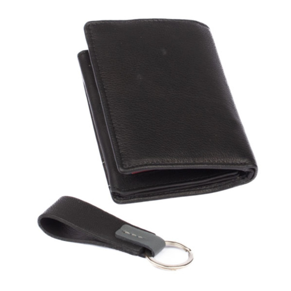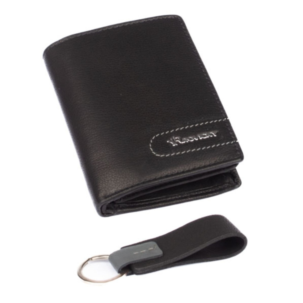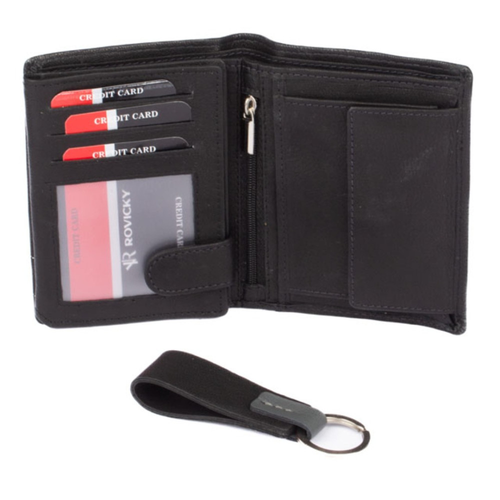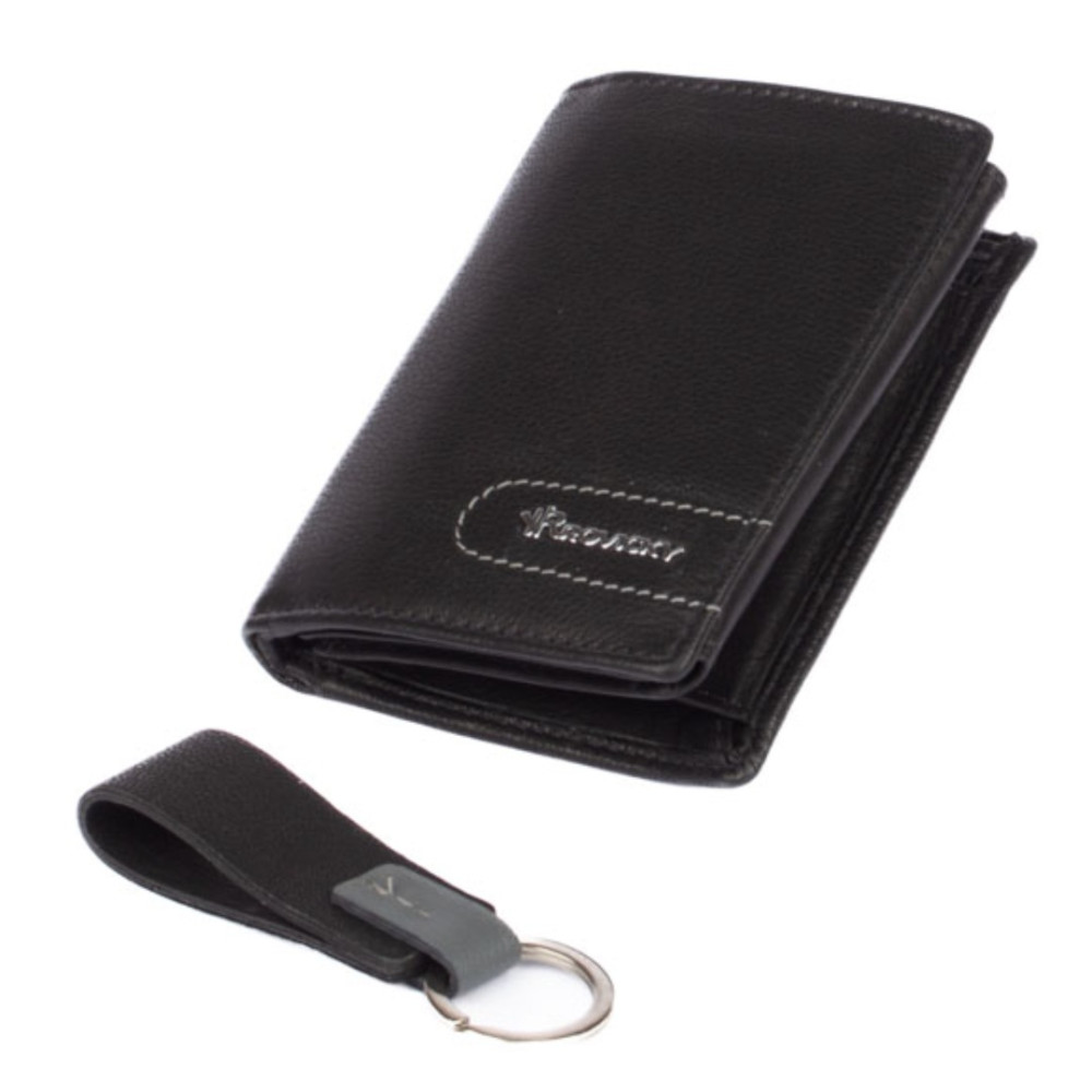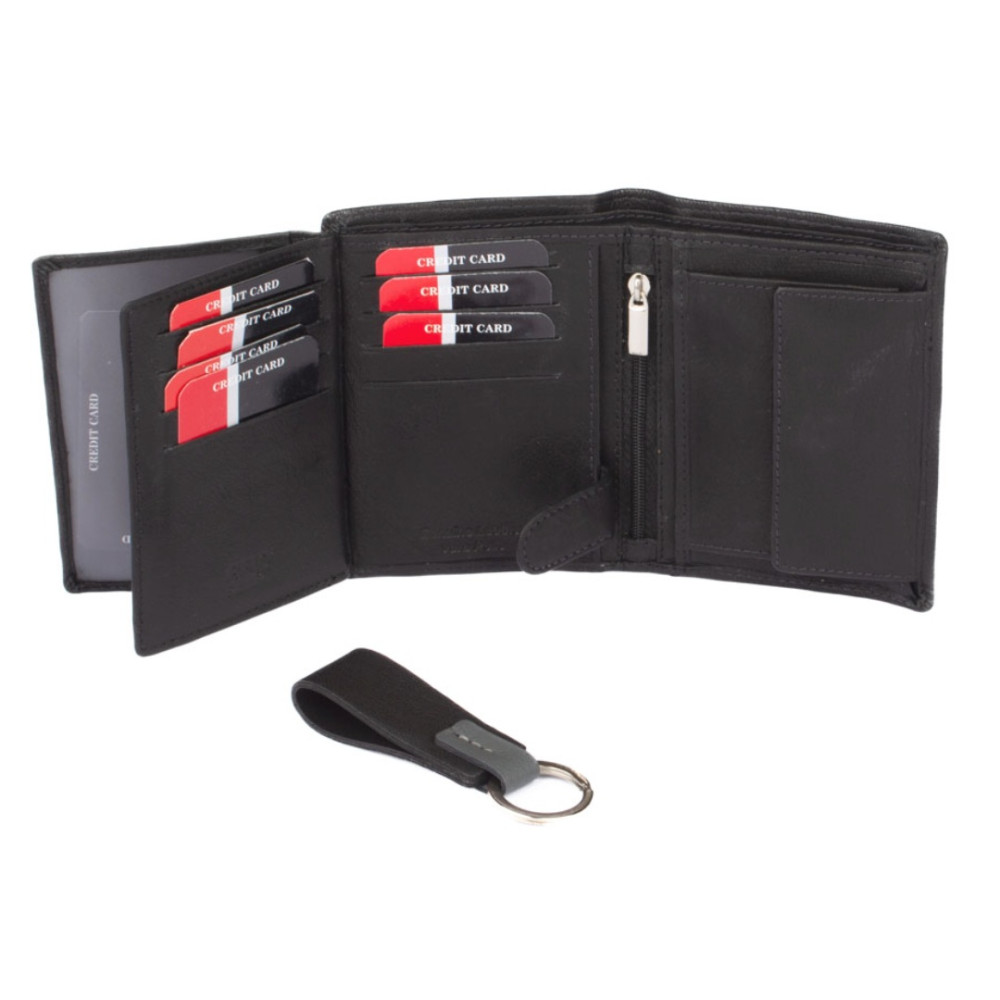 Peněženka tvoří sadu s praktickou klíčenkou. Ta je opatřená jedním kroužkem, na který snadno upevníte jeden nebo více klíčů. Klíčenka je vyrobená v kombinaci černé a šedé barvy a dokonale tak ladí s pánskou peněženkou.