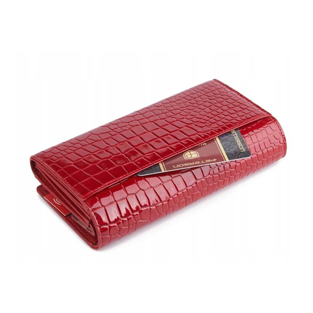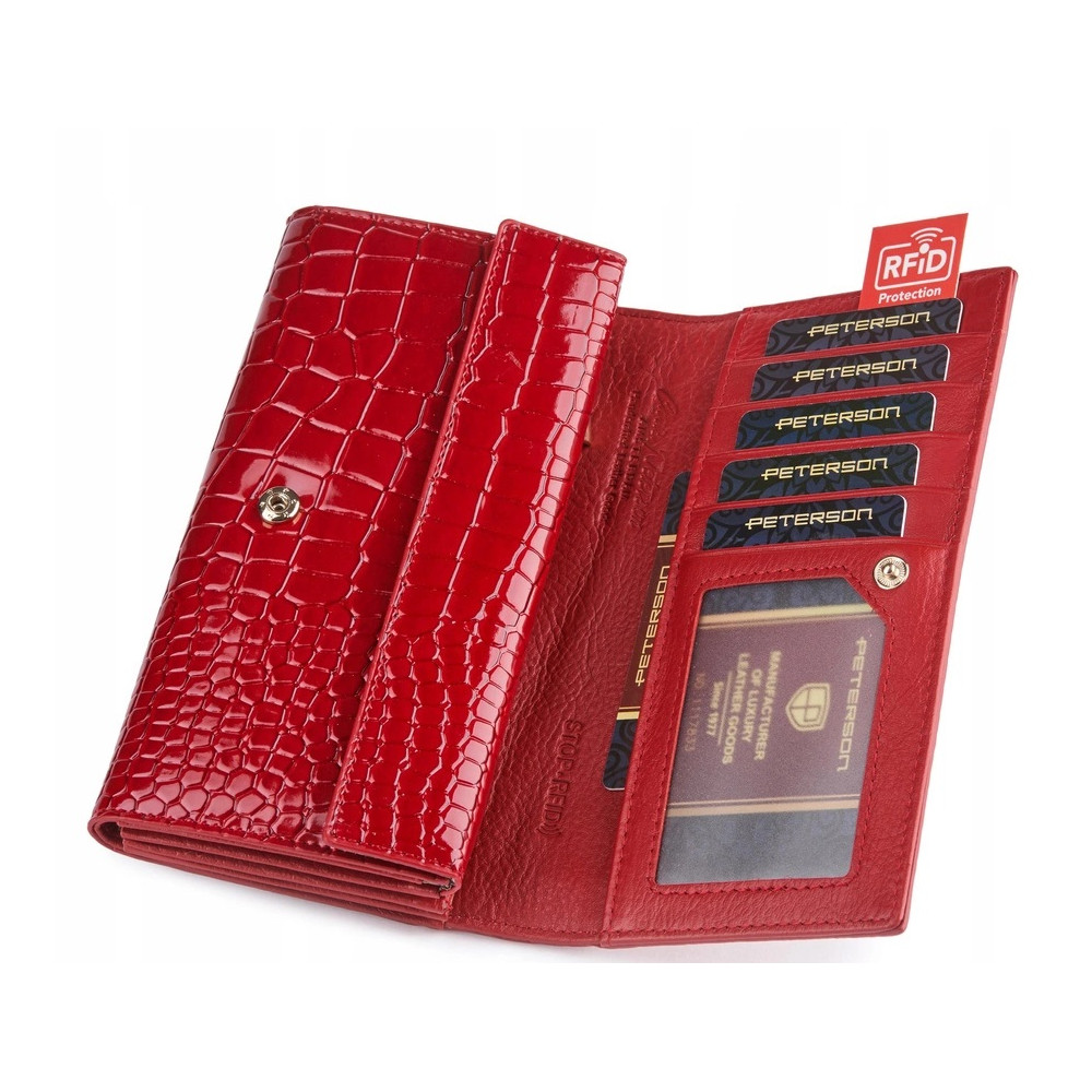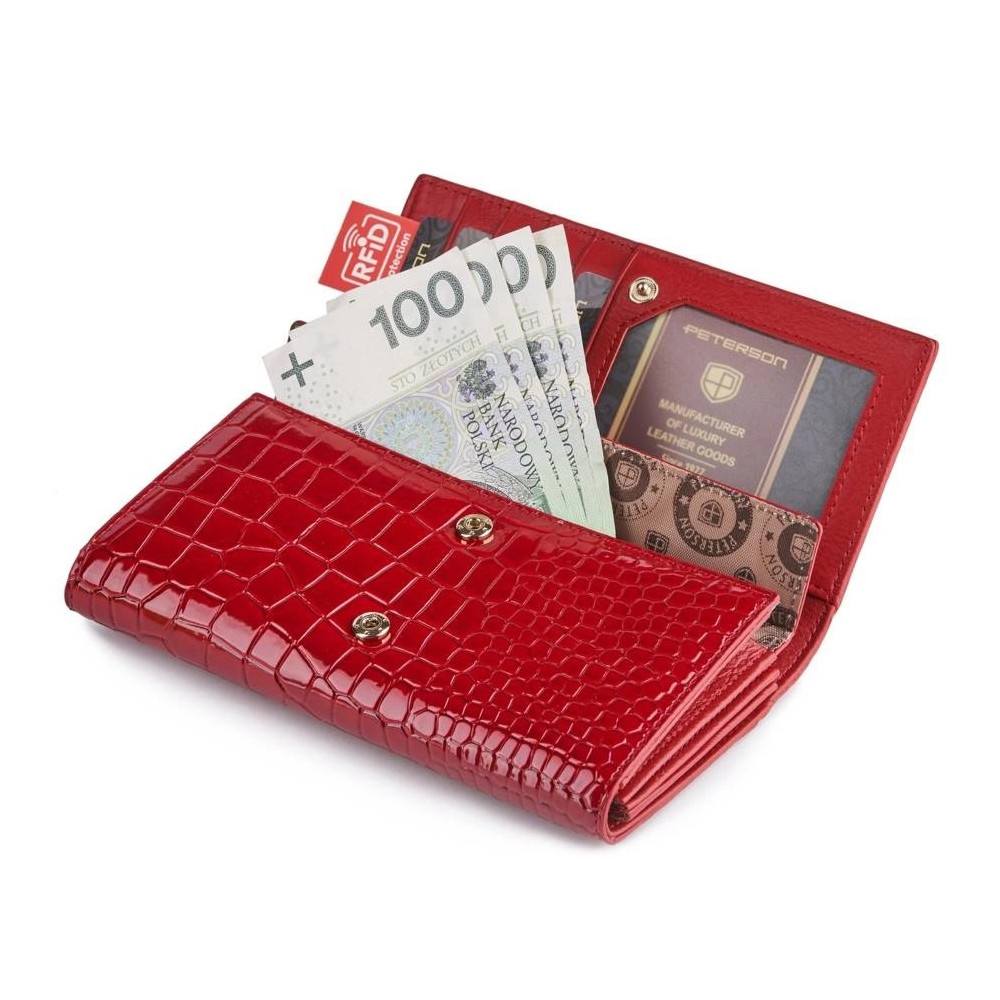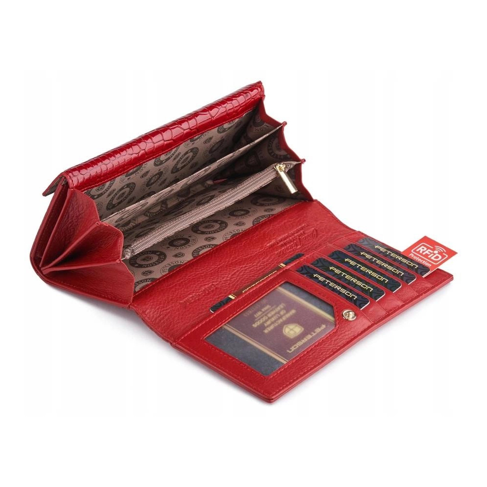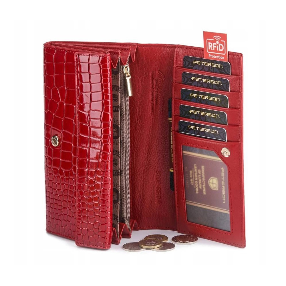 Dámská kožená peněženka se uzavírá klopou s pevným drukem. Pod klopou najdete dostatek kapes na platební karty, velké kapsy na bankovky a menší kapsu na zip. Velký mincovník má rámové uzavírání a je přístupný bez nutnosti otevřít peněženku. Peněženka je i pásek jsou vyrobeny z pravé kůže červené barvy.