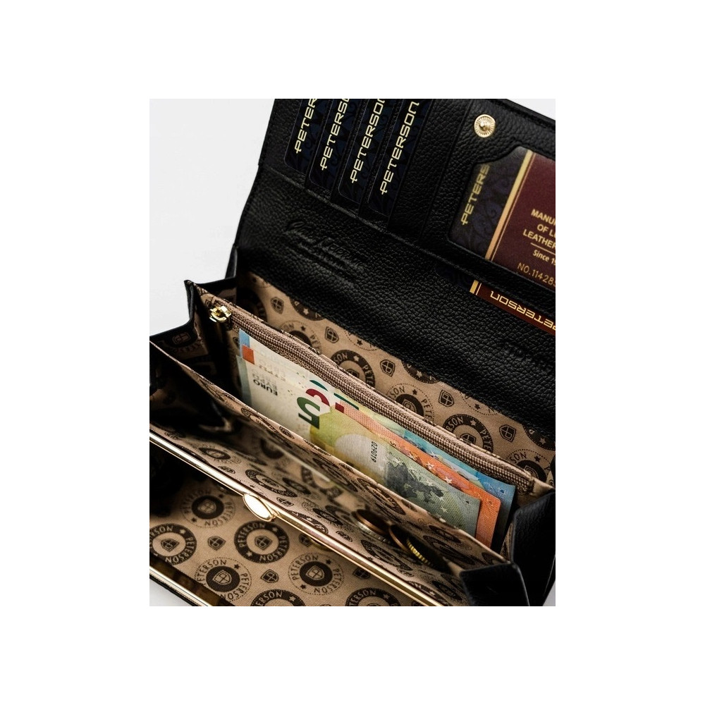 Dámská kožená peněženka se uzavírá klopou s pevným drukem. Pod klopou najdete dostatek kapes na platební karty, velké kapsy na bankovky a menší kapsu na zip. Velký mincovník má rámové uzavírání a je přístupný bez nutnosti otevřít peněženku. Peněženka je i pásek jsou vyrobeny z pravé kůže černé barvy.