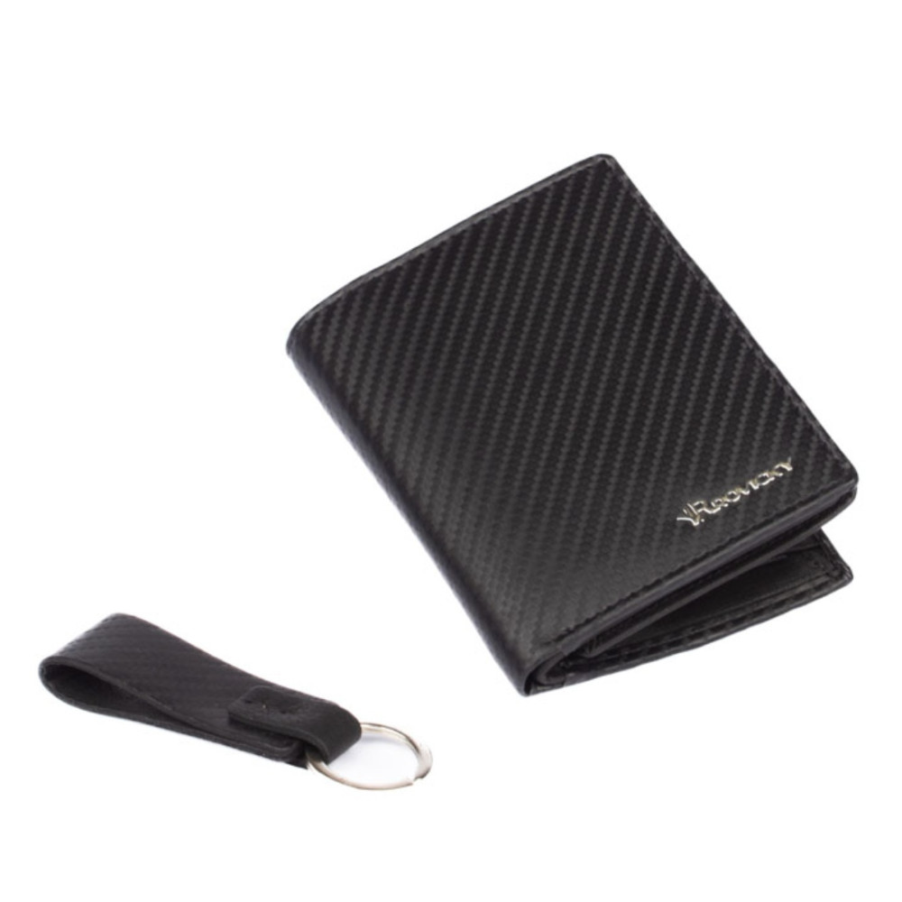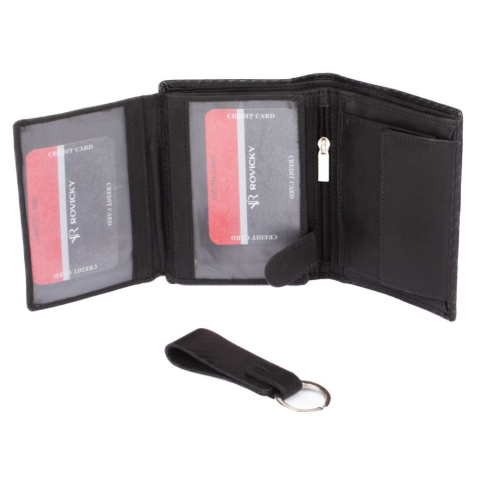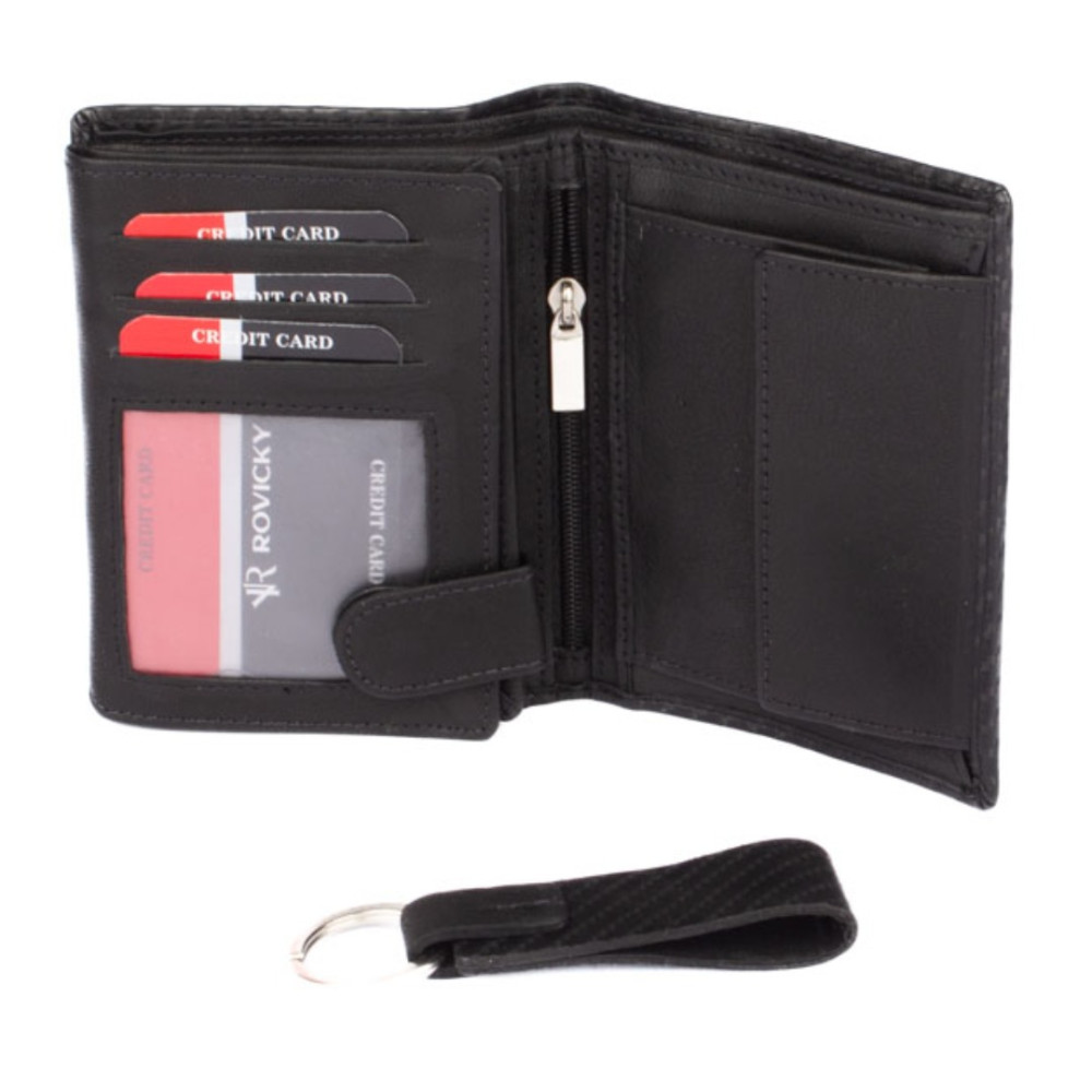 Luxusní pánská dárková sada s peněženkou je doplněná o praktickou klíčenku. Díky ní svoje klíče vždy a hned naleznete. Pro zavěšení klíčů slouží pevný kovový kroužek. Klíčenka je vyrobená ve stejném designu, jako peněženka.