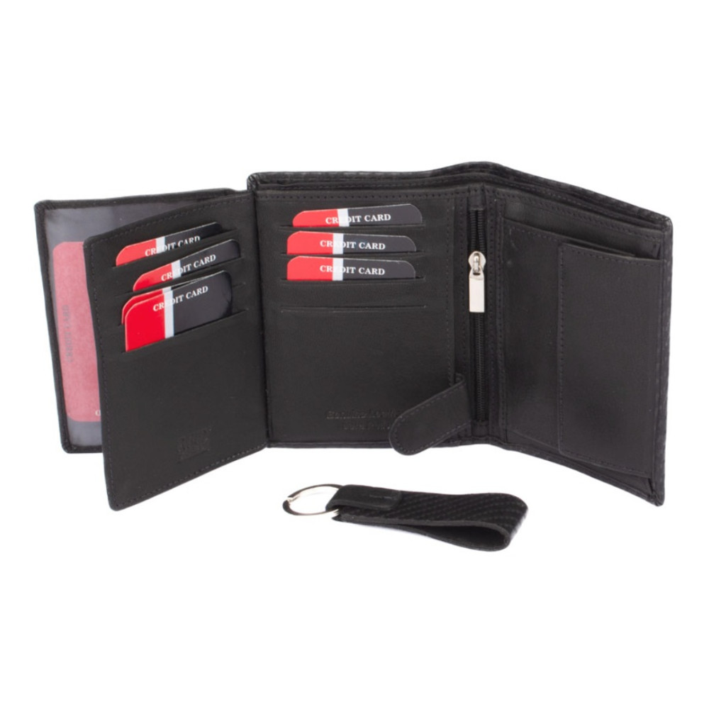 Luxusní pánská dárková sada s peněženkou je vyrobená z pravé kůže a zabalená do originální designové kazety. Sadu tvoří pánská peněženka vyrobená z pravé kůže a klíčenka, také z pravé kůže, ve stejném designu, jako je peněženka.
