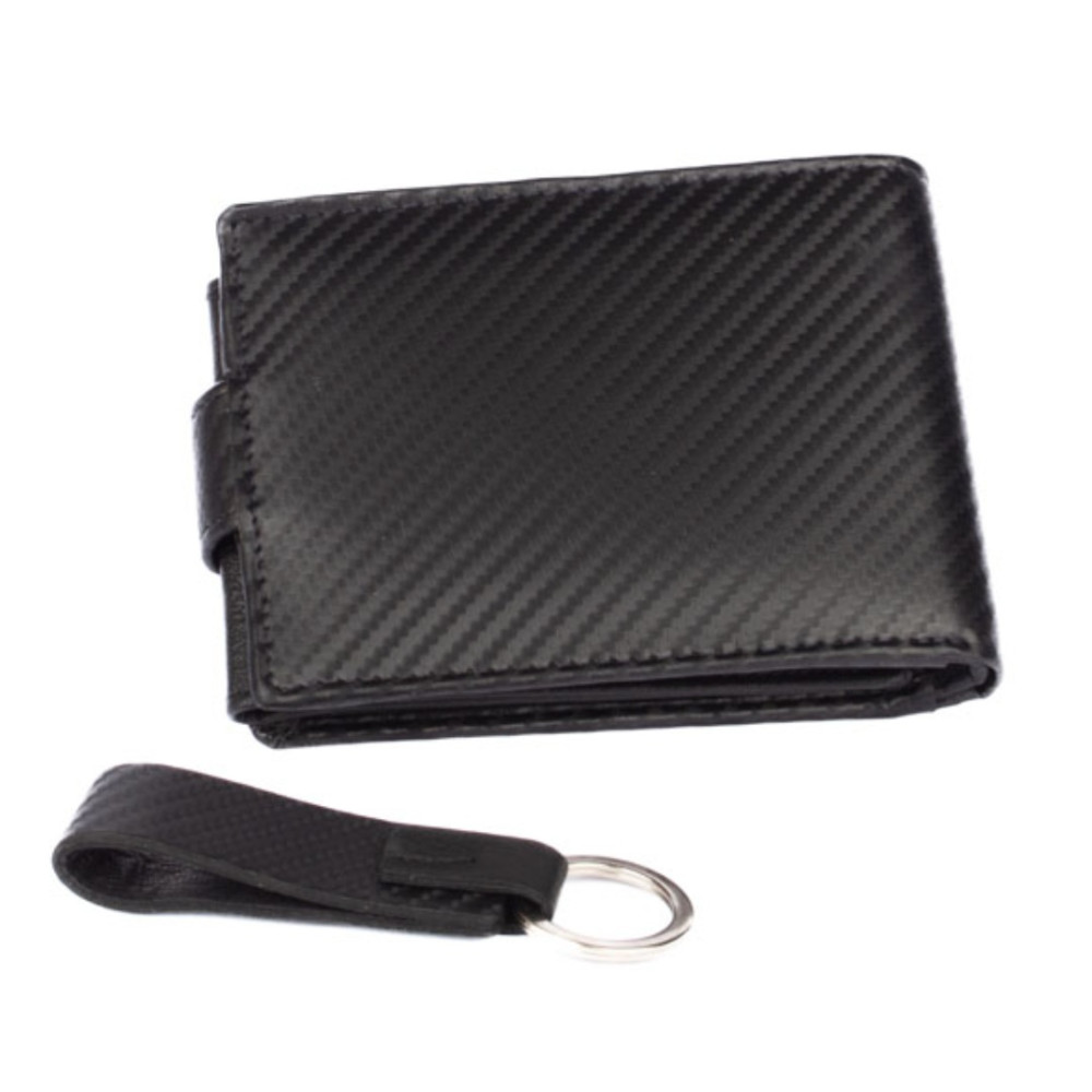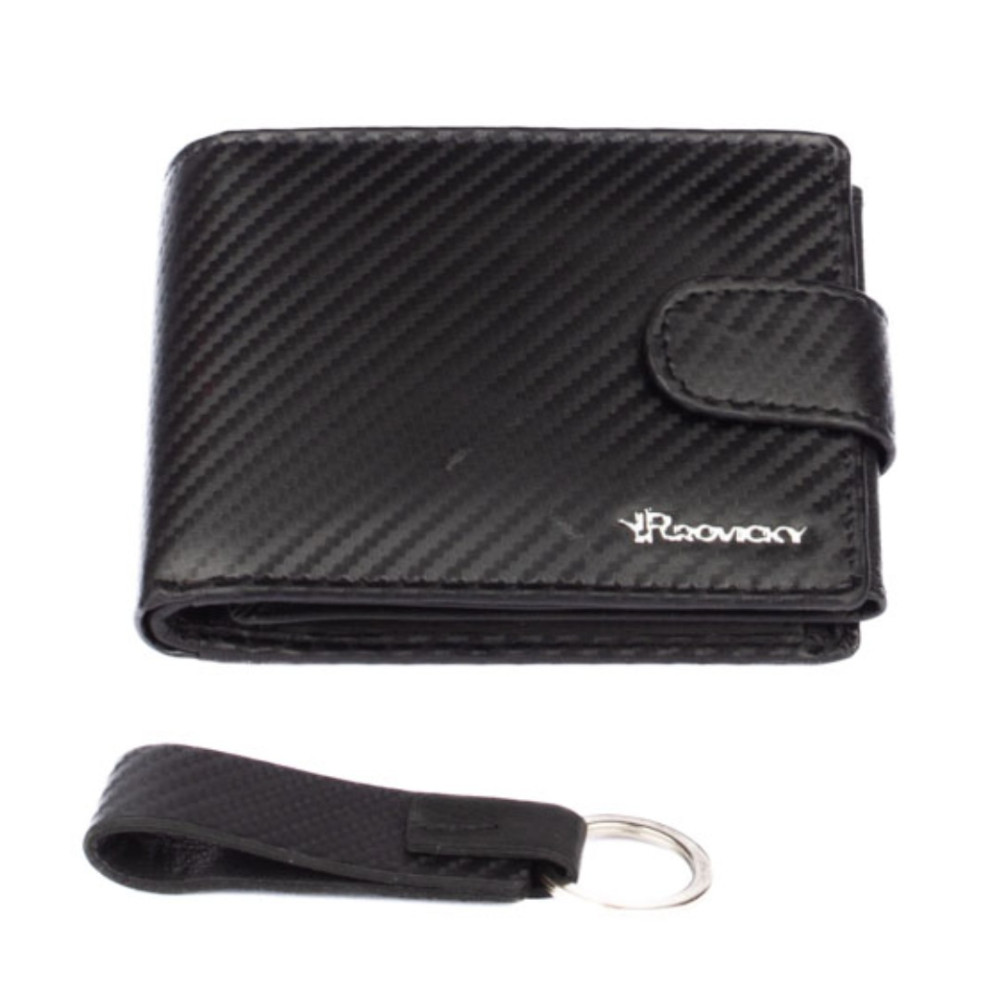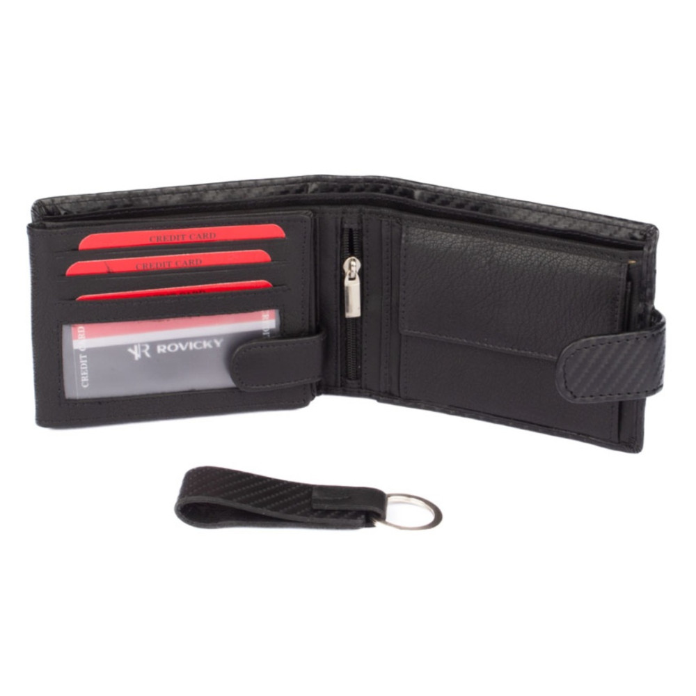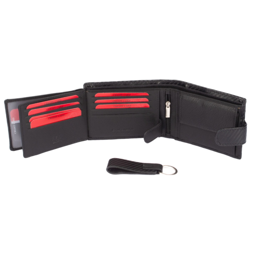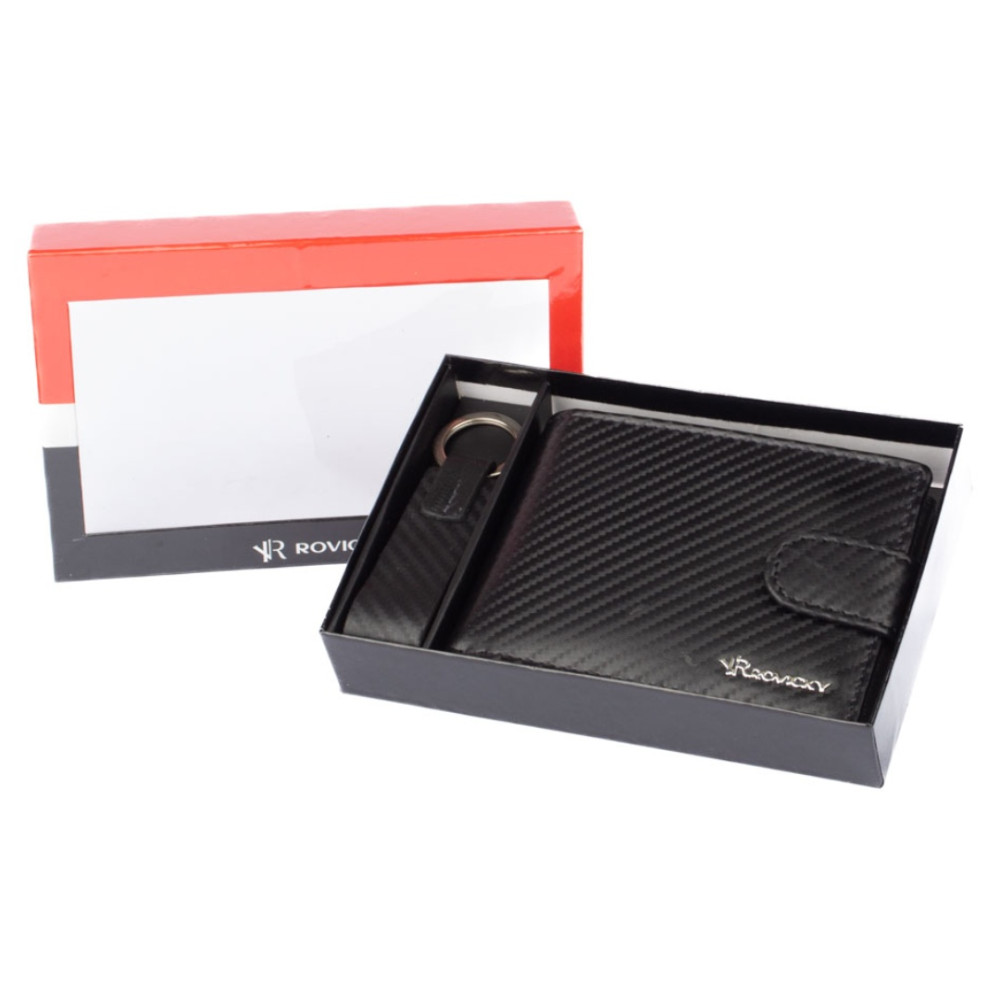 Luxusní sada dárková pánská s peněženkou vyrobená z pravé, jemné kůže černé barvy se skládá z pánské peněženky a klíčenky. Obojí má stejný design a dokonale tak sobě ladí. Sada se dodává v luxusní dárkové kazetě.